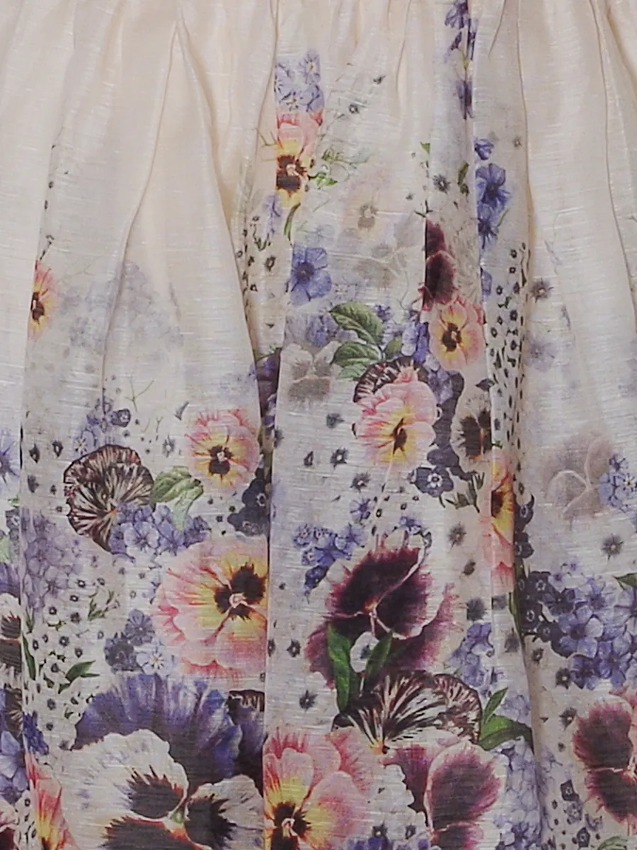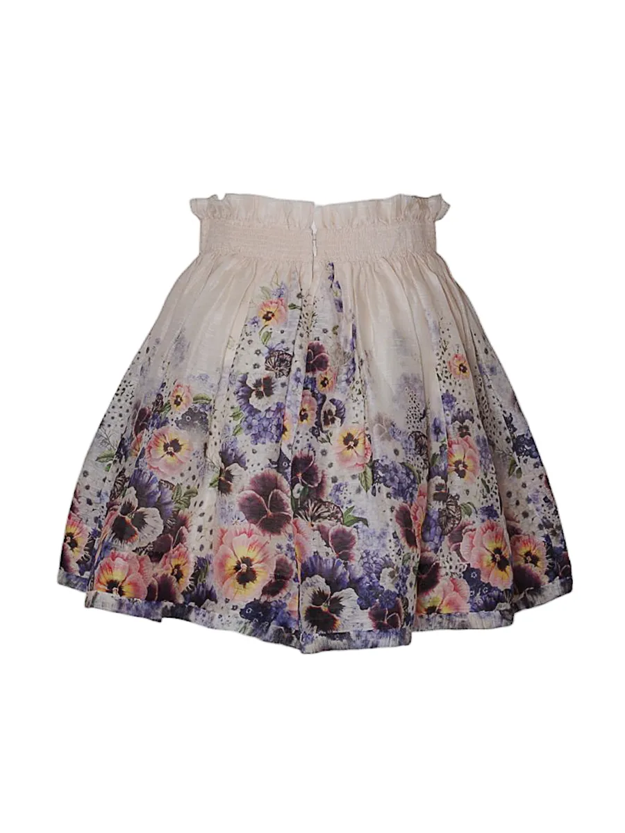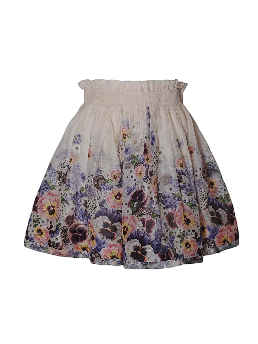 Юбка Zimmermann выполнена из лёгкой ткани с ярким цветочным принтом в пастельных и насыщенных тонах, сочетает романтичный стиль и воздушность; высокая эластичная талия и расклешённый крой создают объёмный силуэт — идеальный выбор для женственного и свежего образа.