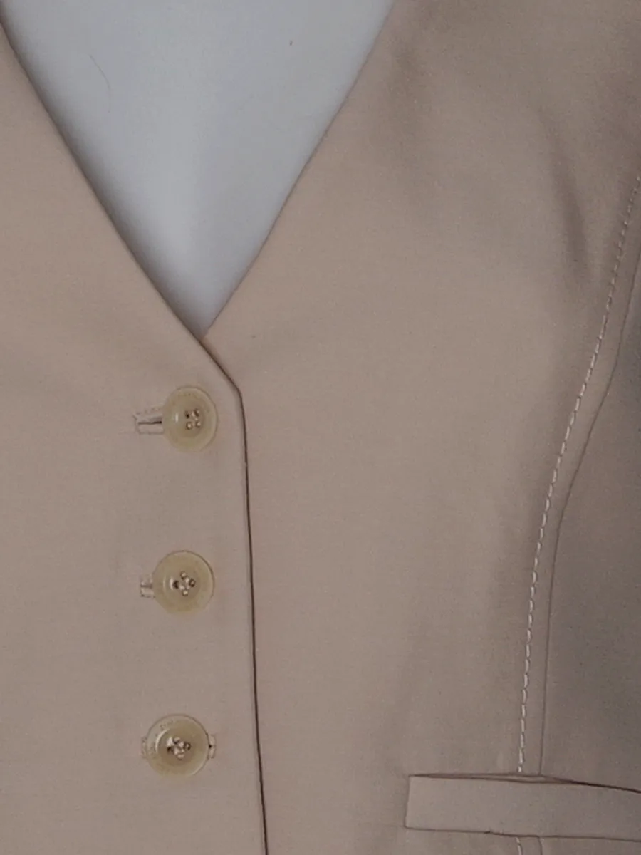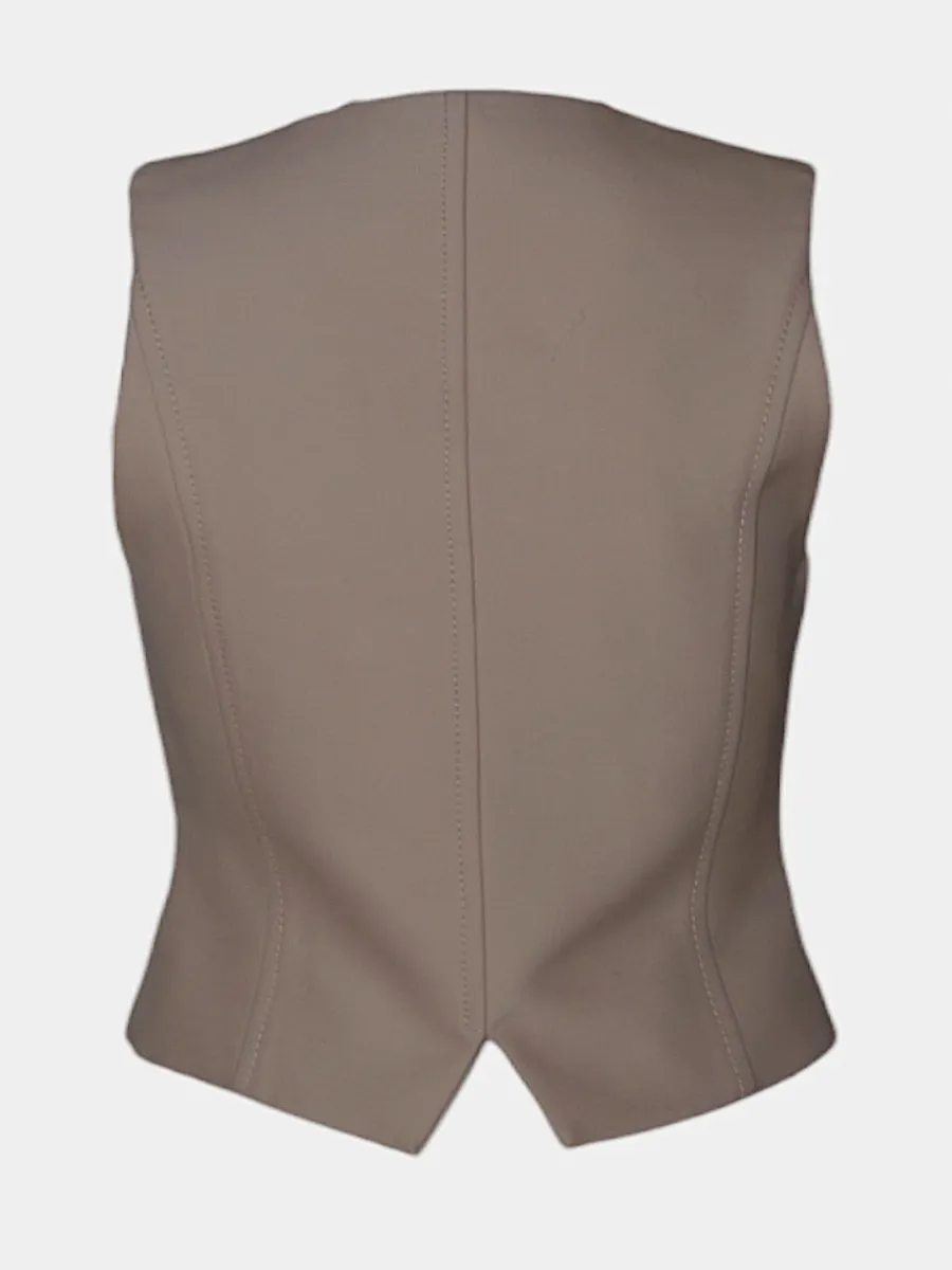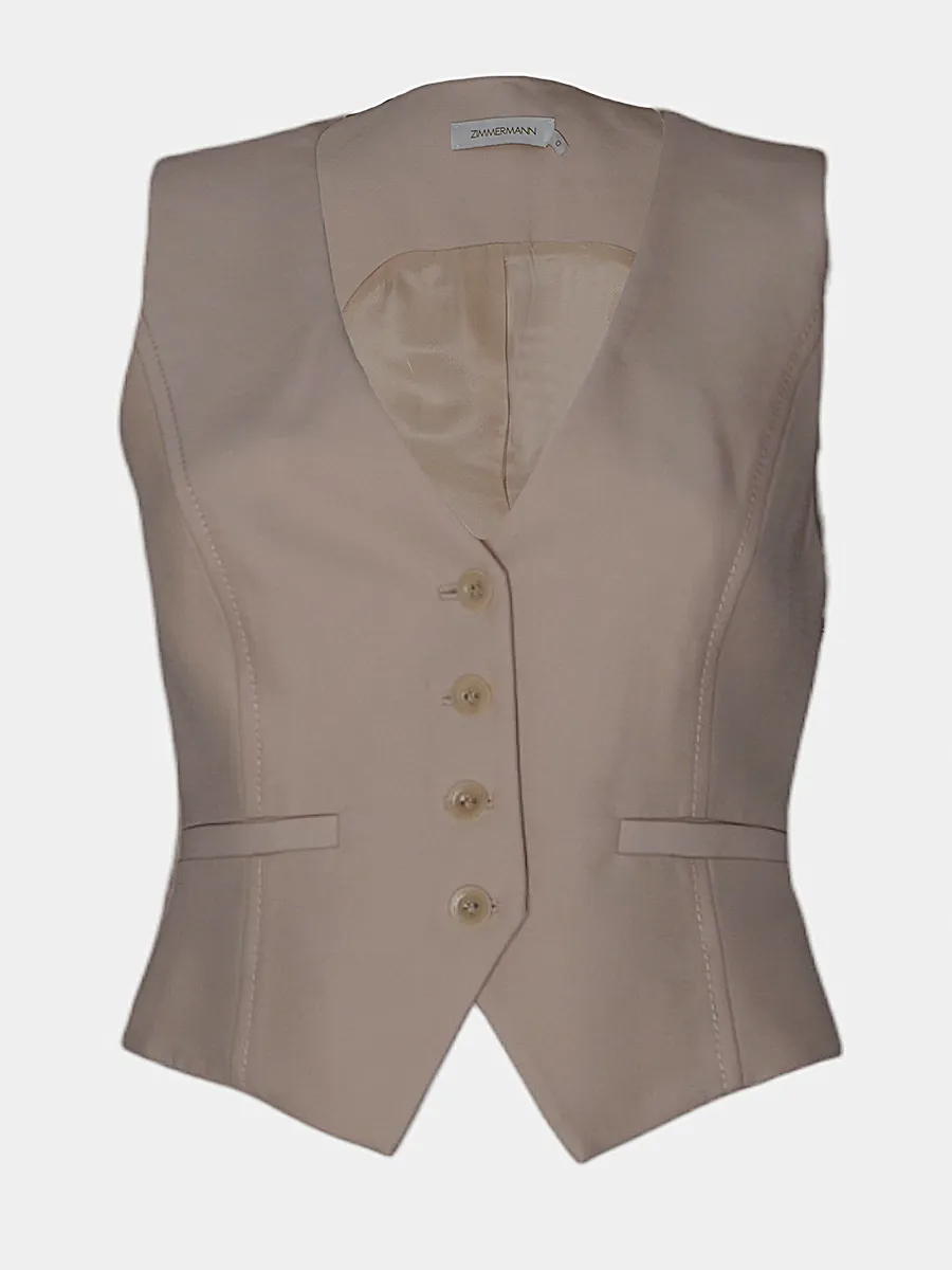 Жилетка Zimmermann выполнена из плотной ткани нежно-бежевого оттенка с классическим кроем и акцентной строчкой по бокам; четыре пуговицы, V-образный вырез и приталенный силуэт подчёркивают элегантность и утончённость — универсальный элемент делового или вечернего образа.