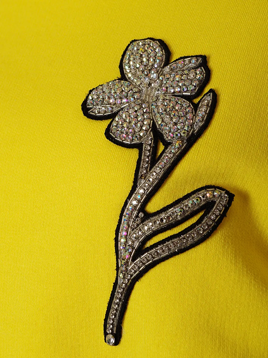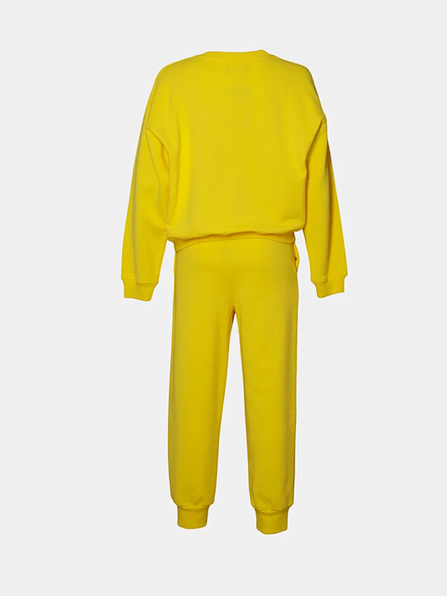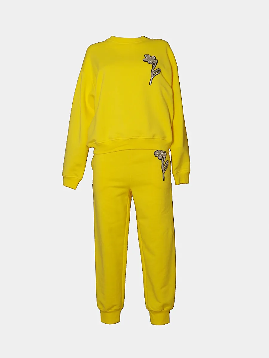 Костюм David Koma выполнен из мягкого и комфортного хлопкового трикотажа ярко-желтого цвета. Комплект состоит из свитшота с круглым вырезом и широких брюк с эластичными манжетами. Особый акцент — декоративная аппликация в виде цветка, выполненная из страз и черной каймы, которая украшает переднюю часть свитшота. Лаконичный дизайн и яркий оттенок создают современный и стильный образ для повседневной носки.