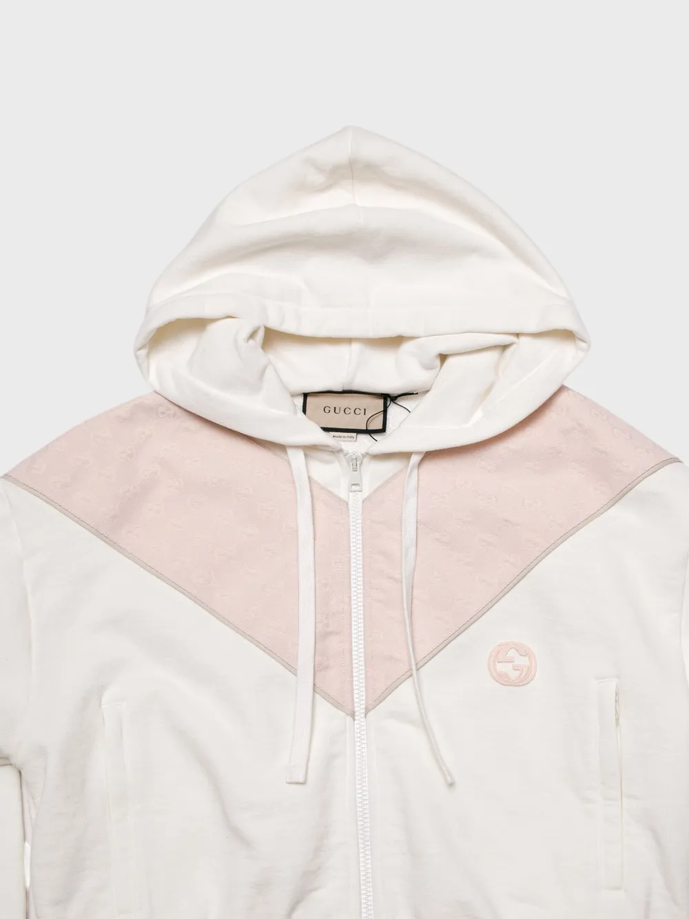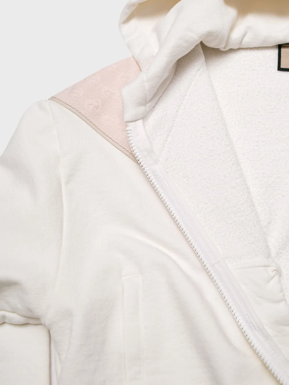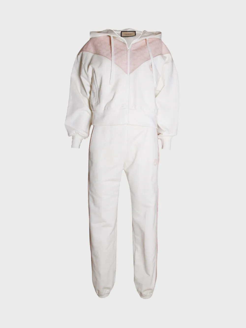 Костюм Gucci выполнен из мягкой ткани в бело-розовых тонах и состоит из верха с капюшоном и прямых брюк. Модель оформлена крупным логотипом "GUCCI" на груди, контрастной розовой отделкой и фирменными деталями бренда. Спортивный силуэт сочетает комфорт, элегантность и узнаваемый стиль Gucci.