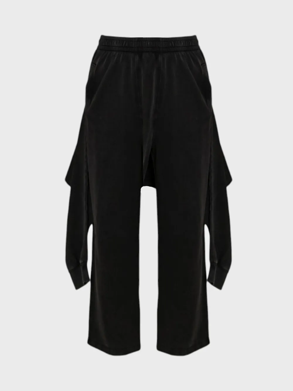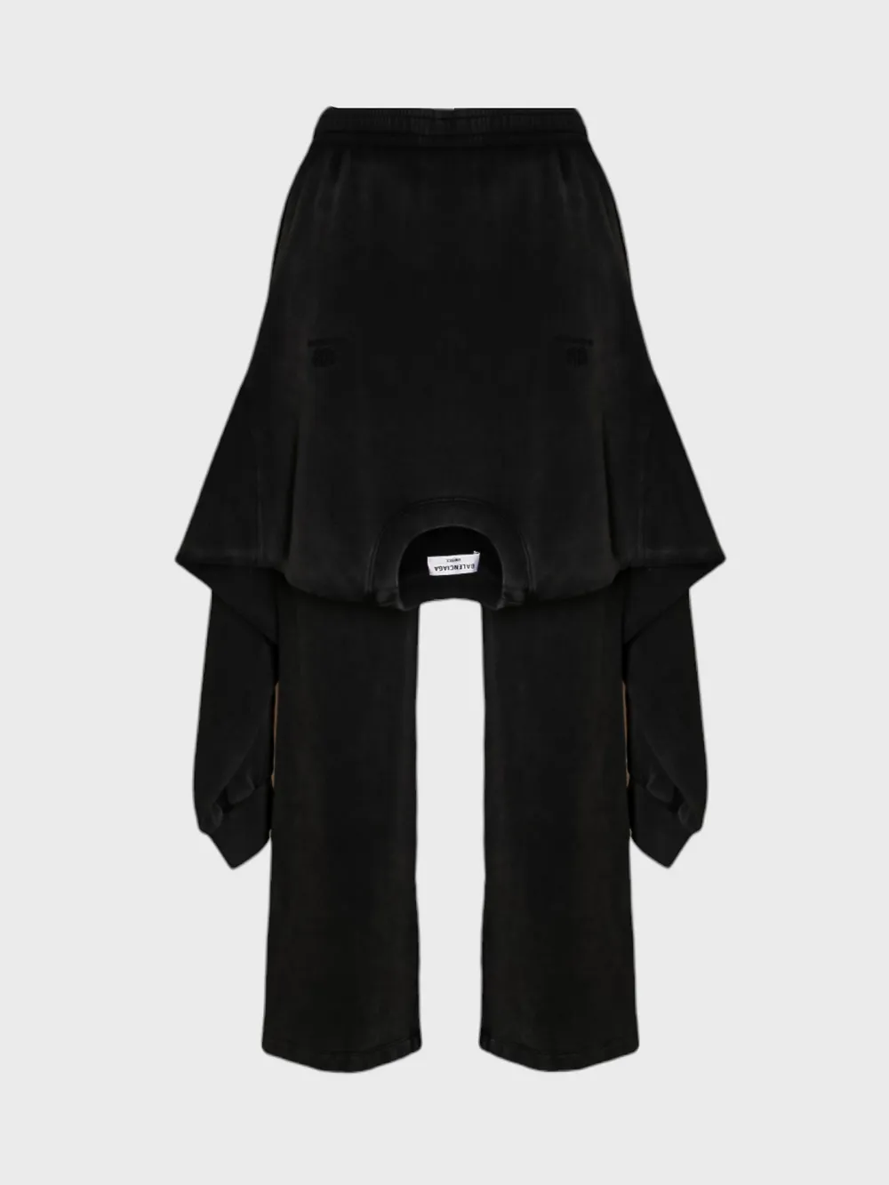 Штаны Balenciaga выполнены из качественного черного материала с широким кроем и эластичной посадкой. Модель дополнена декоративными элементами в виде асимметричных разрезов и логотипа бренда, что добавляет современности и стиля. Простой дизайн и комфортная посадка делают штаны идеальным выбором для повседневной носки или как базовый элемент в гардеробе.