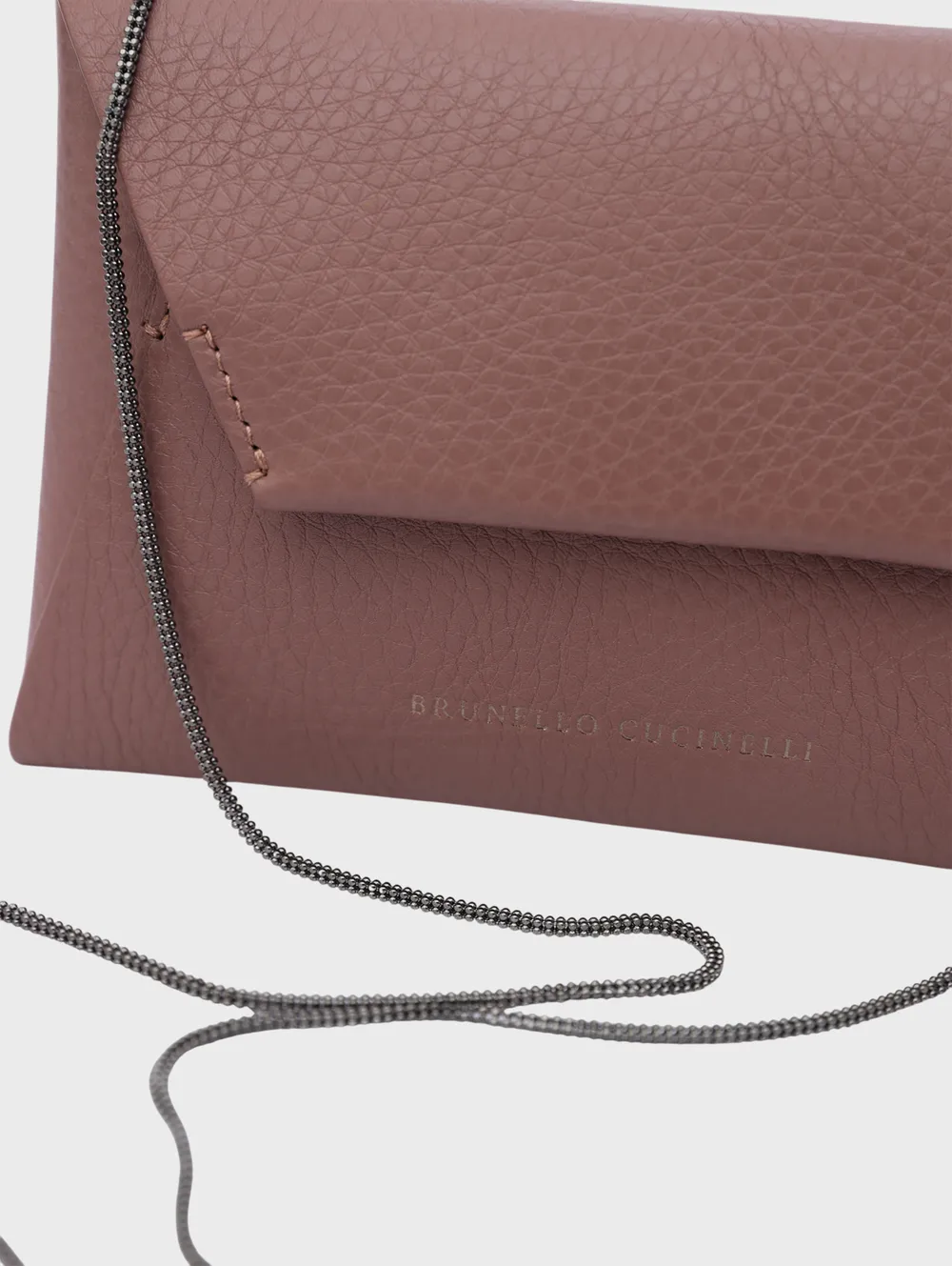 Клатч Brunello Cucinelli выполнен из качественной фактурной кожи коричневого цвета с рельефным узором, созданным методом перфорации. Модель сочетает компактный прямоугольный силуэт и длинную регулируемую цепочку для ношения через плечо или на запястье. Фронтальная часть декорирована металлическими деталями, придающими изделию современный вид. Внутри клатча просторное отделение с молнией, обеспечивающее надежное хранение вещей. Идеально для повседневного использования или деловых встреч.