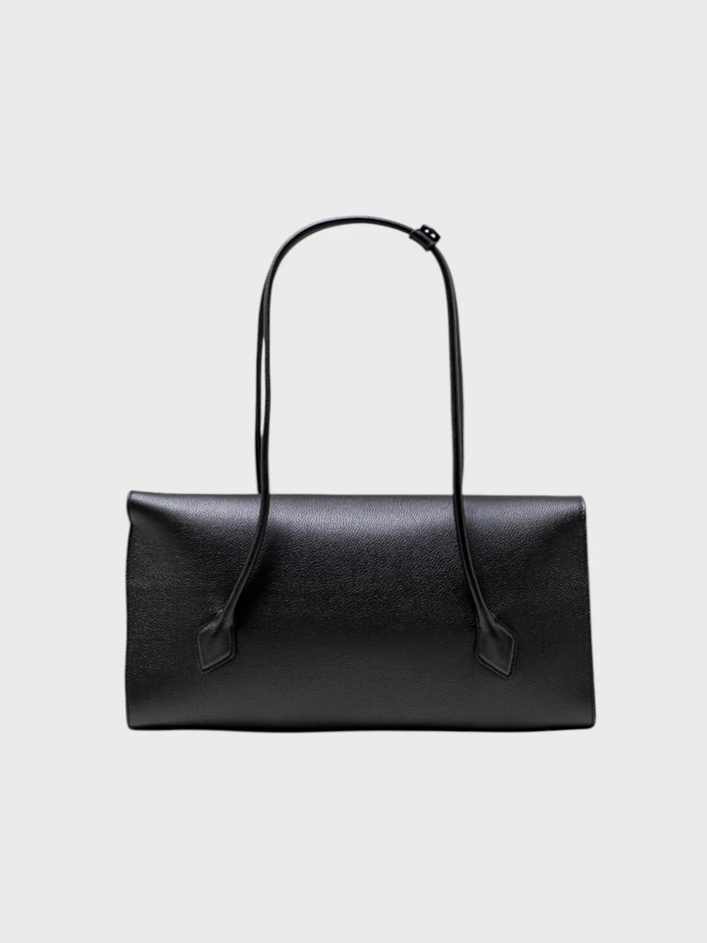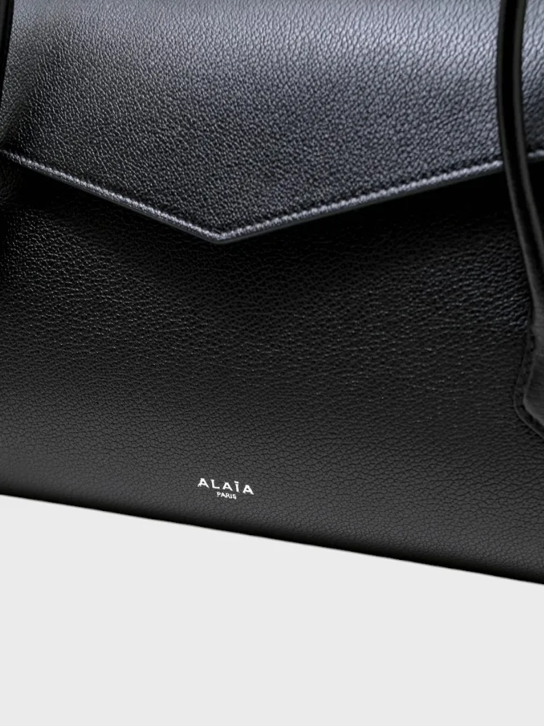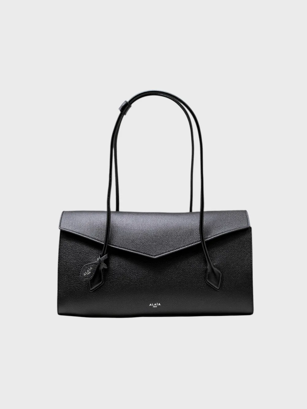 Чёрная сумка-конверт бренда Alaïa из фактурной кожи с тонкой зернистой текстурой, дополненная декоративным бантом на молнии и фирменным штампом «Alaïa Paris». Минималистичный силуэт с удлинёнными ручками и скрытой застёжкой сочетает строгость и женственность, идеально дополняя как деловые, так и вечерние образы. Роскошный аксессуар для тех, кто ценит безупречное качество и современный шик.