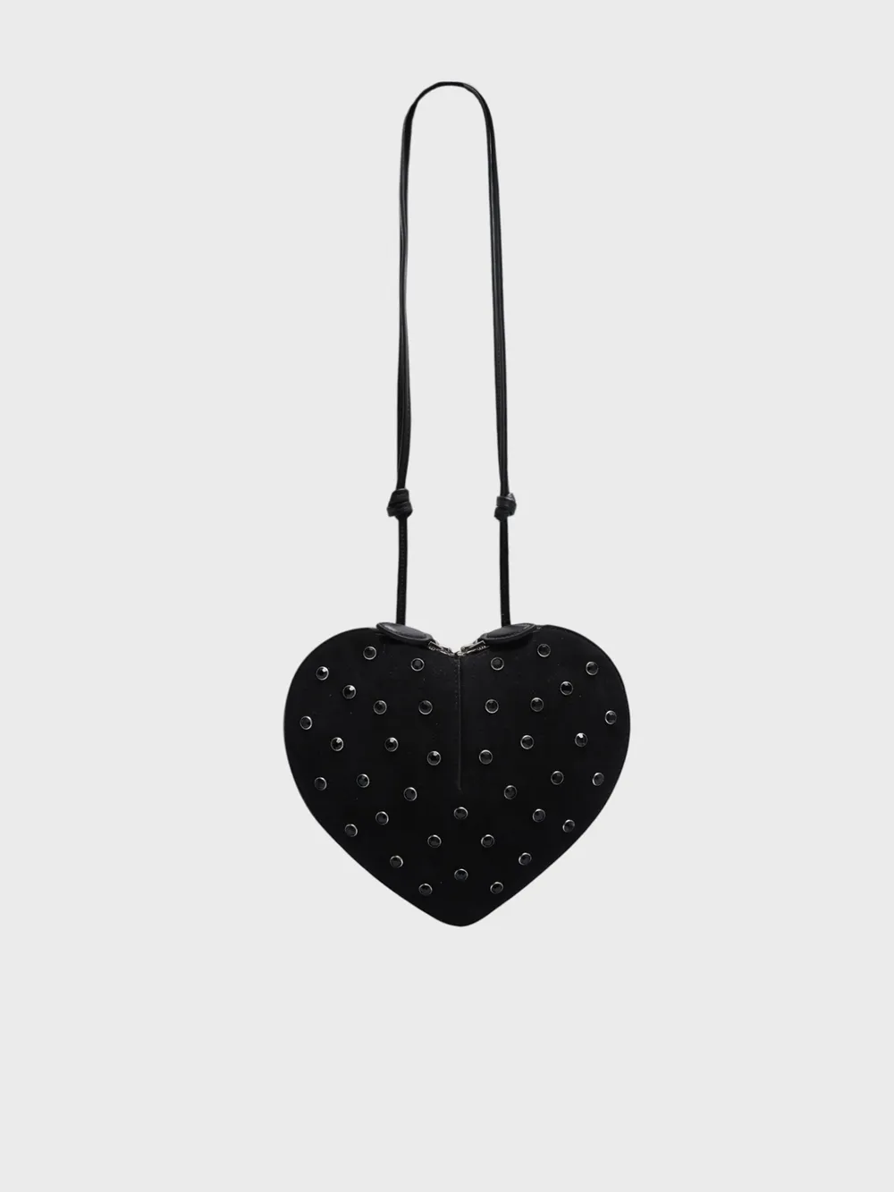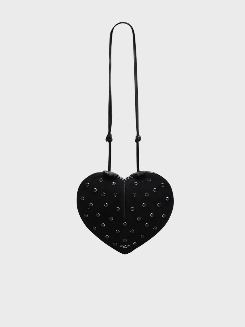 Сумка Alaïa выполнена в форме сердца из черной замши с фактурным покрытием. Модель декорирована множеством металлических заклепок, придающих ей современный и элегантный вид. Длинный тонкий ремешок позволяет носить сумку через плечо или как клатч. Фирменная эмблема бренда нанесена на переднюю часть, подчеркивая высокое качество и премиальный статус аксессуара. Универсальный дизайн идеально сочетается с различными образами, от повседневных до вечерних.