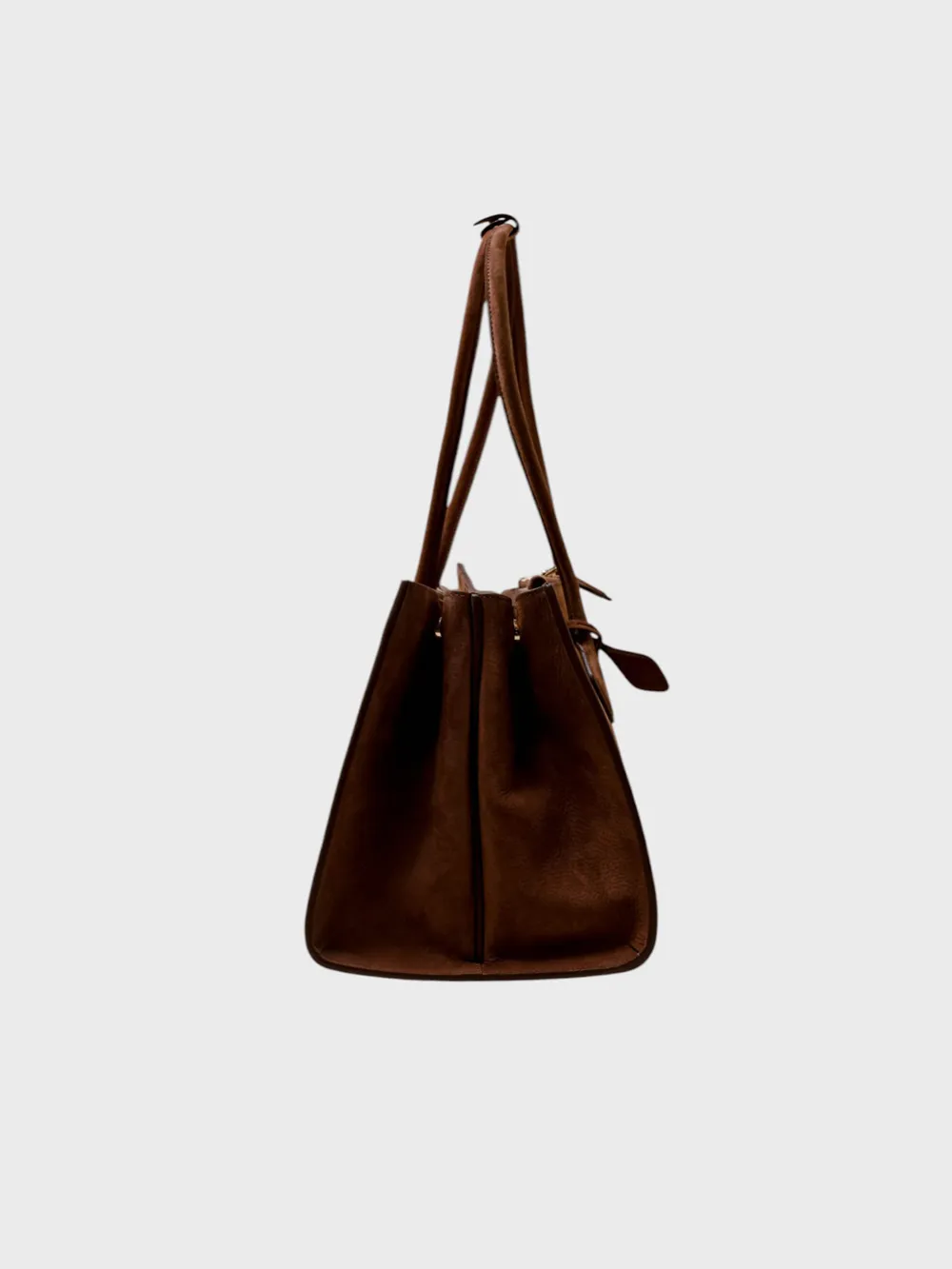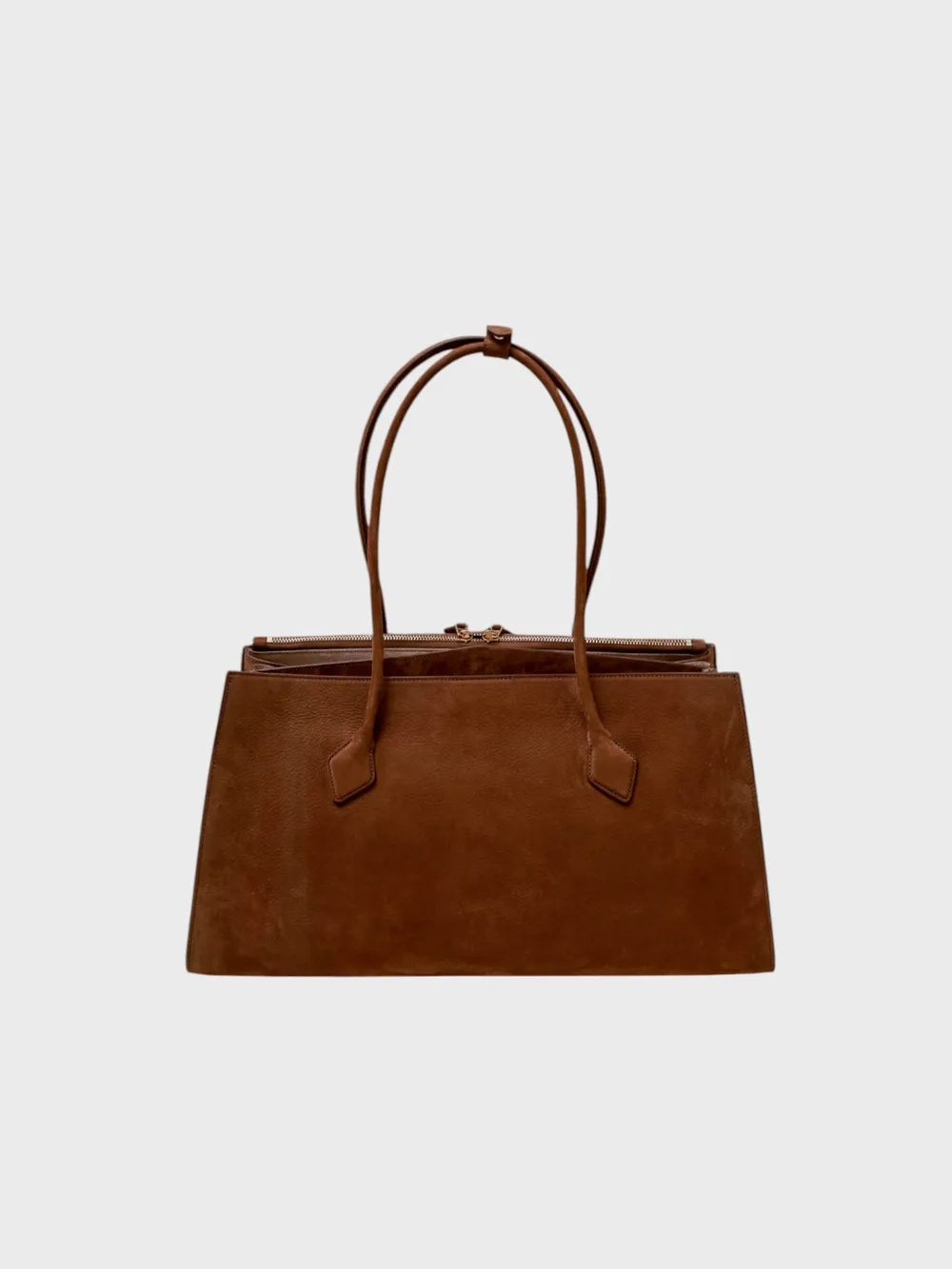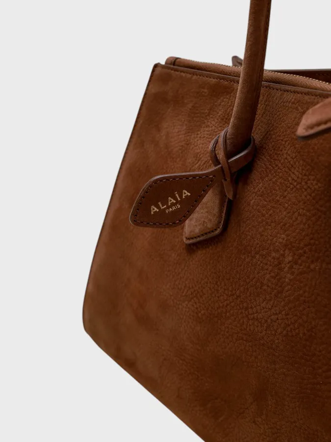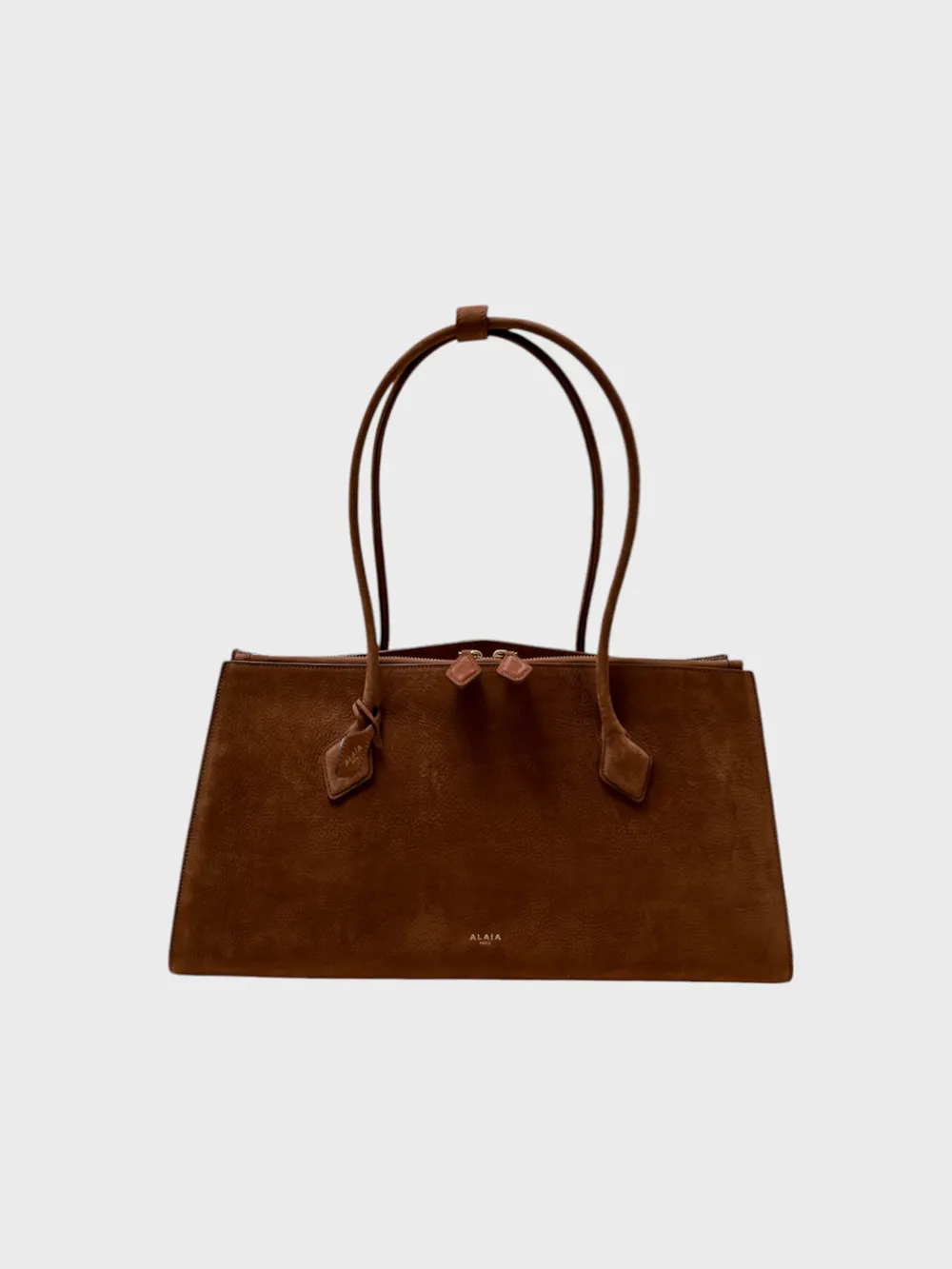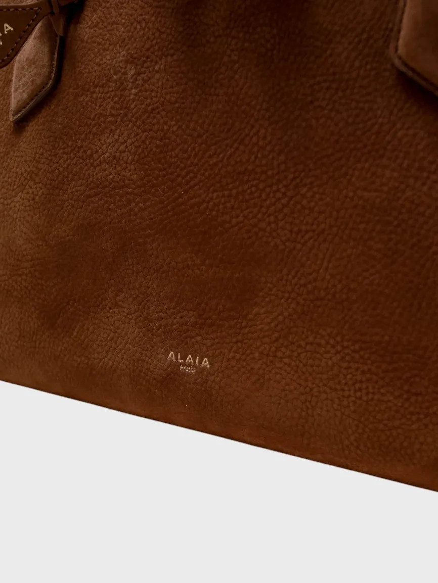 Сумка Alaïa выполнена из качественной коричневой кожи с текстурным рельефом, придающим ей элегантный и современный вид. Модель оснащена двумя длинными кожаными ручками для удобного ношения на плече или в руке. Застежка-молния обеспечивает безопасное хранение вещей, а дополнительные карманы внутри увеличивают функциональность сумки. Фирменная эмблема бренда нанесена на внешнюю часть, подчеркивая высокое качество и премиальный статус аксессуара. Идеально подходит как для повседневного использования, так и для деловых встреч.