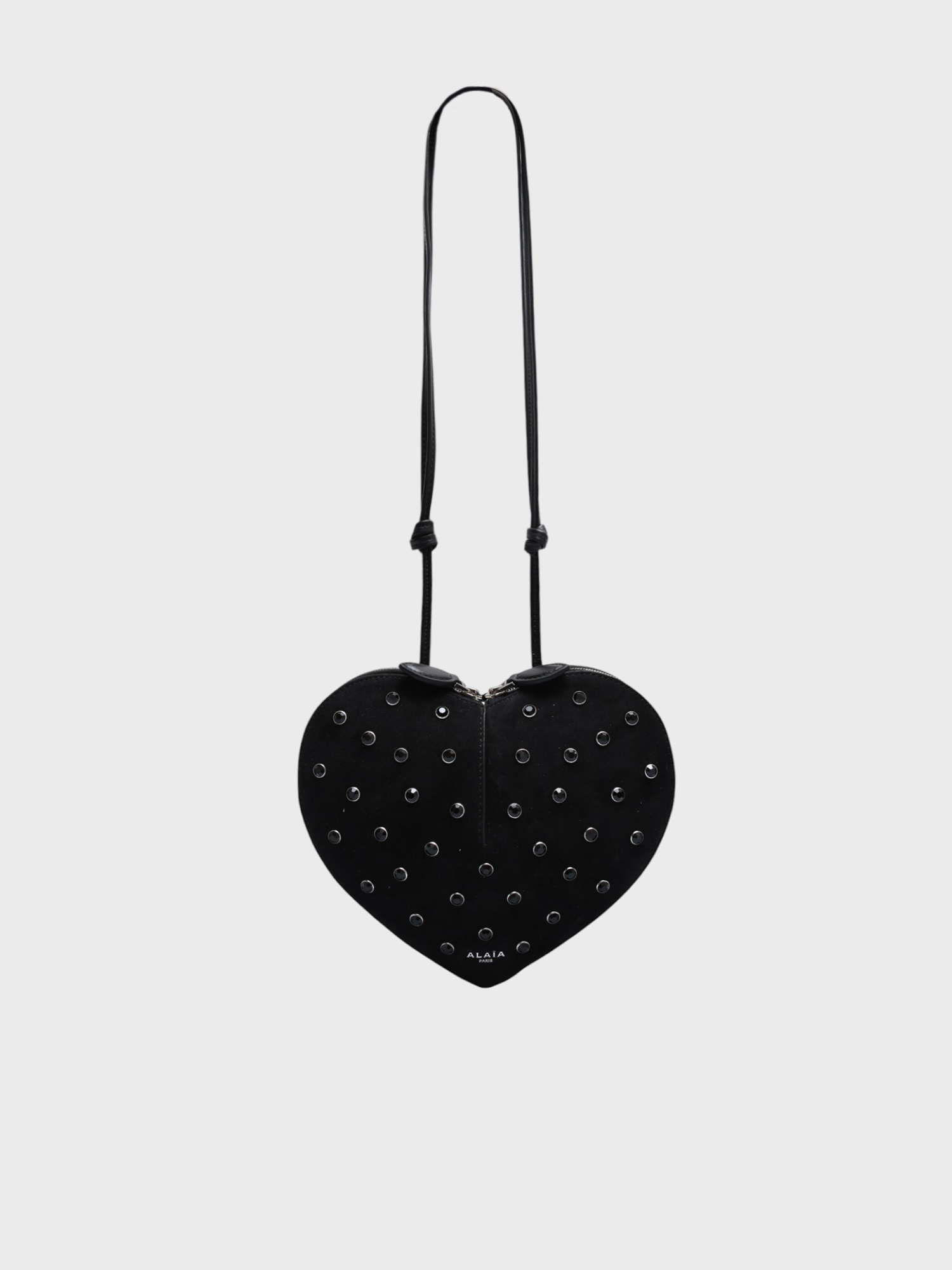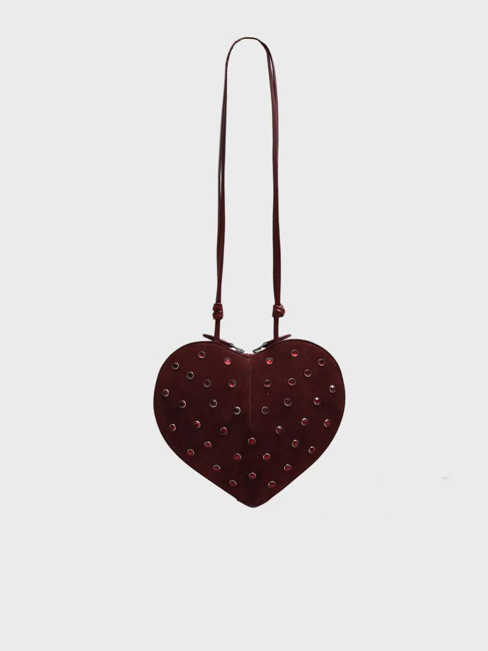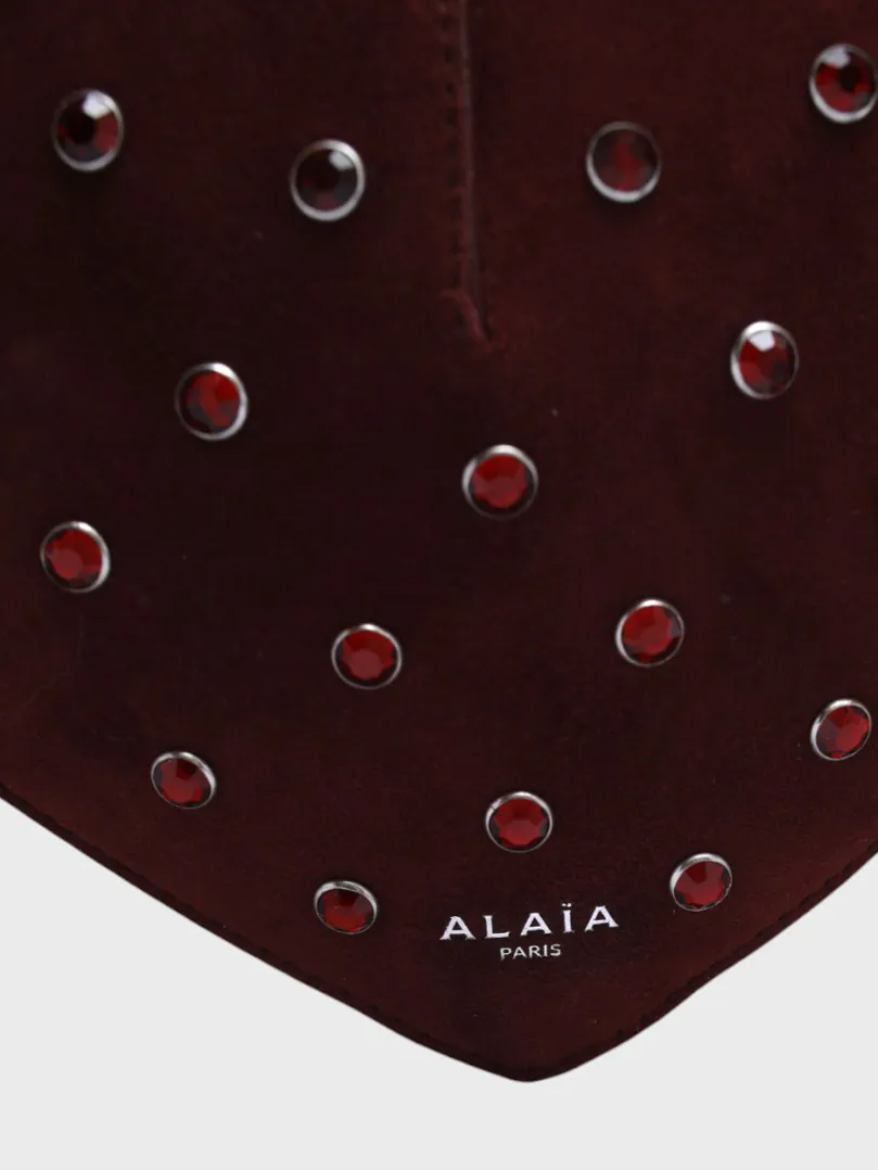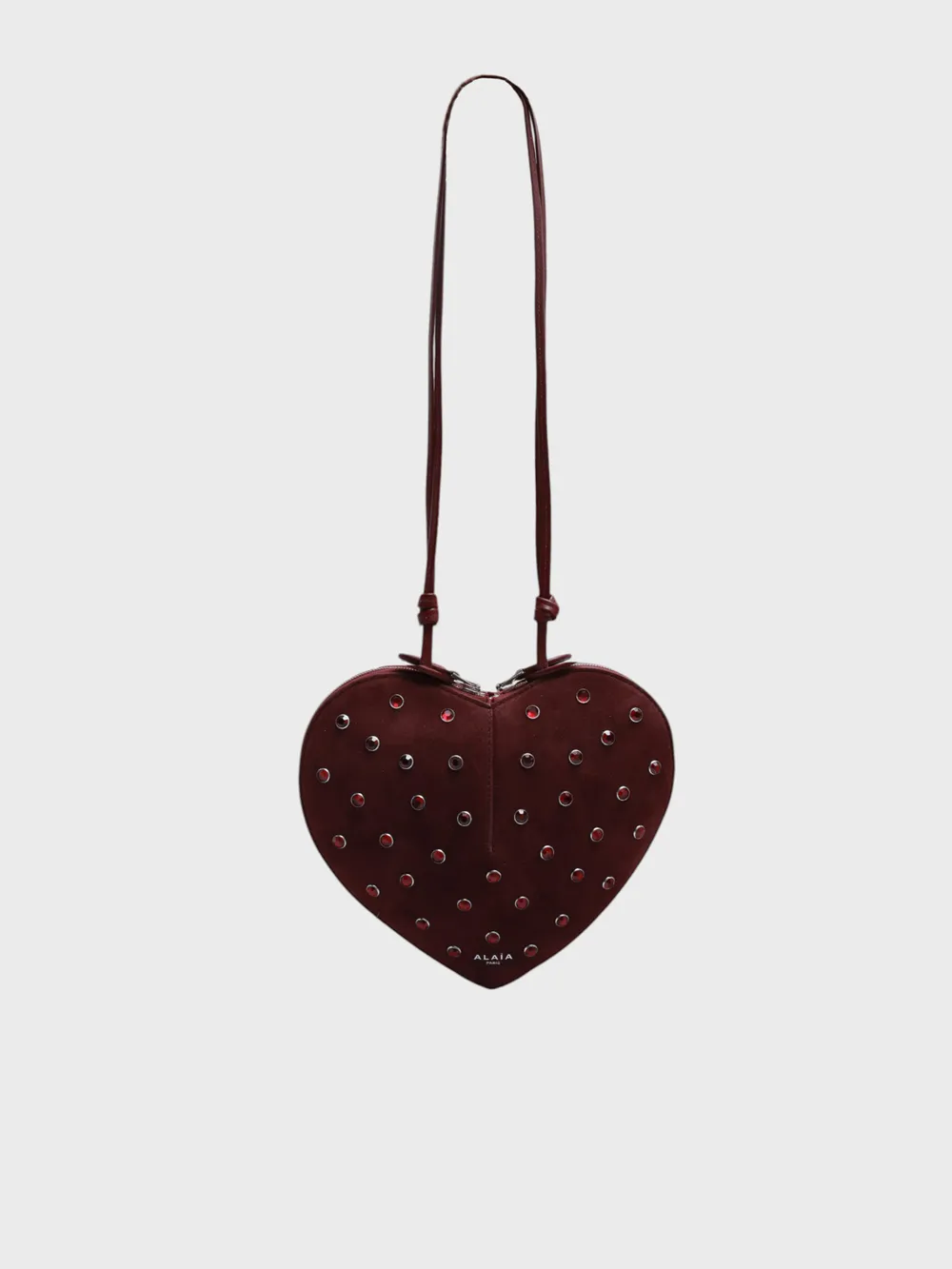 Сумка Alaïa выполнена в форме сердца из темно-бордовой замши с фактурным покрытием. Модель декорирована множеством металлических заклепок, которые создают эффектное сверкание и придают сумке современный дизайн. Длинный тонкий ремешок позволяет носить аксессуар через плечо или как клатч. Фирменная эмблема бренда нанесена на переднюю часть, подчеркивая высокое качество и премиальный статус изделия. Универсальный дизайн идеально сочетается с различными образами, от повседневных до вечерних.