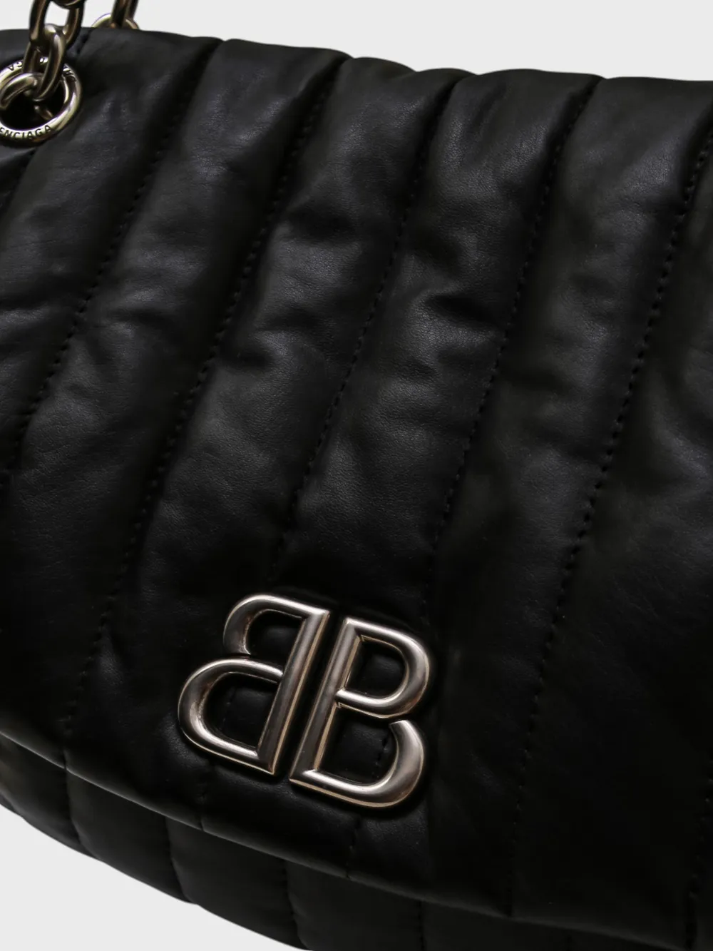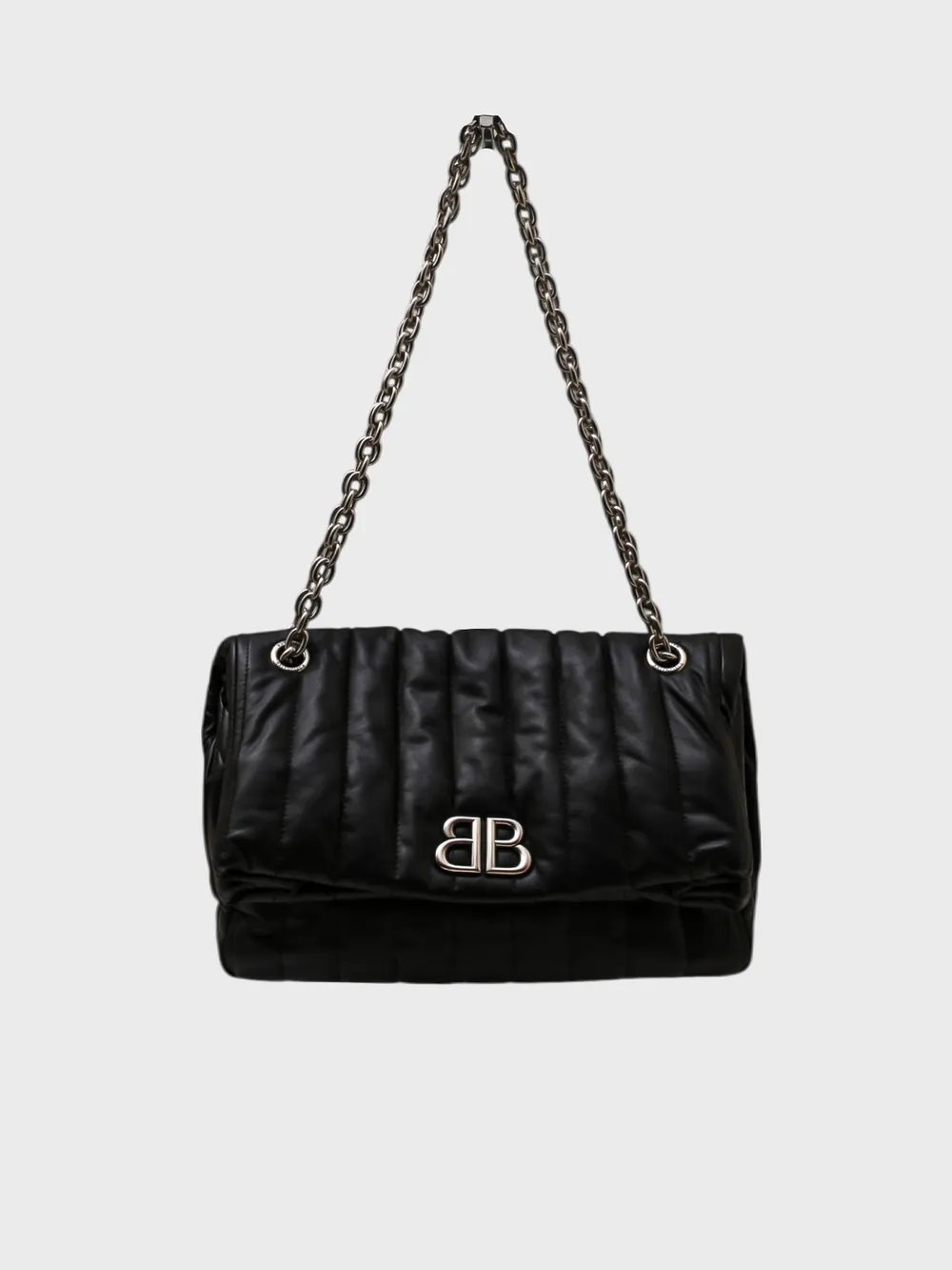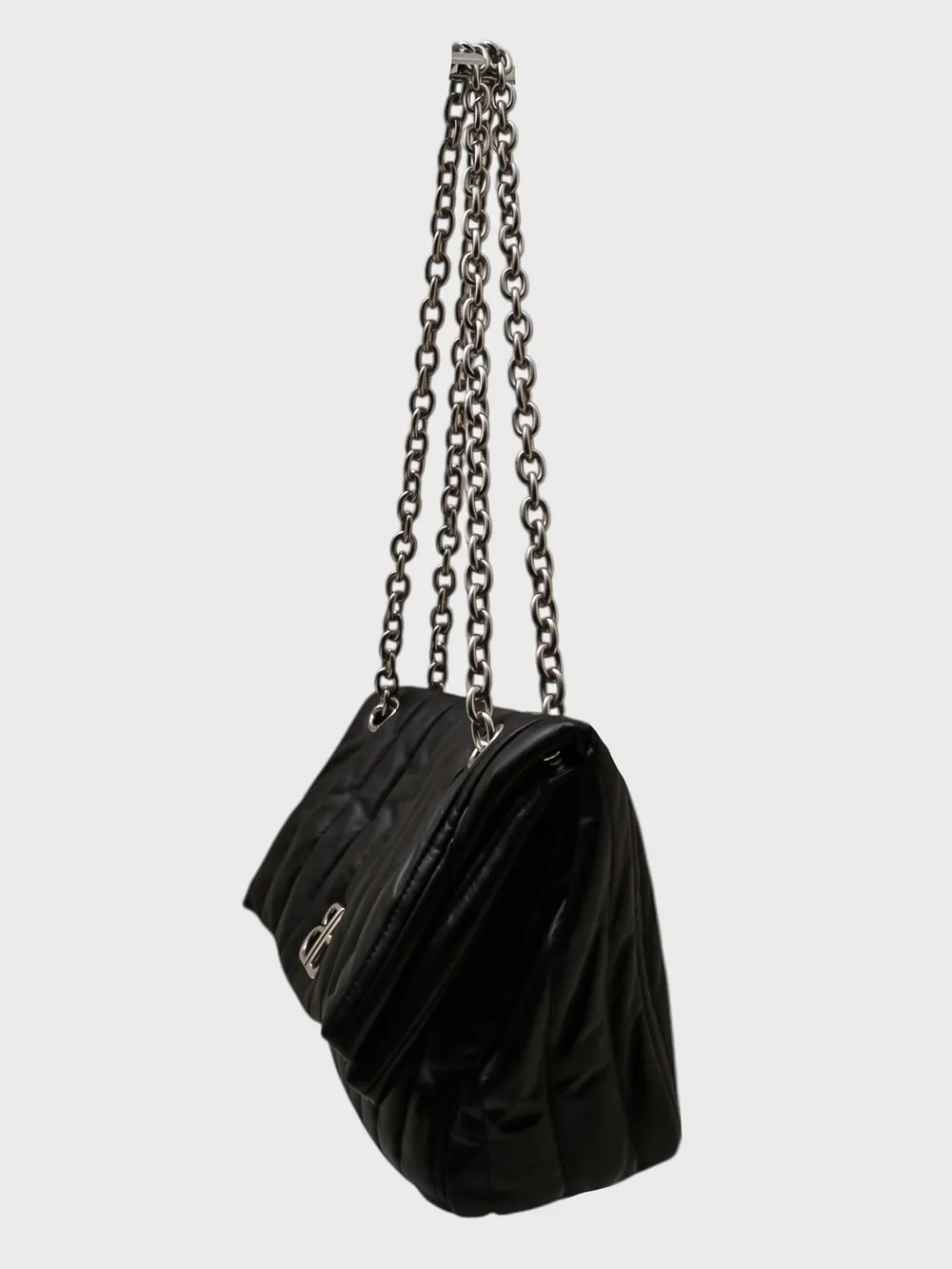 Сумка Balenciaga выполнена из качественной кожи черного цвета с прямым кроем и продуманным дизайном. Модель дополнена серебряной цепочкой, которая придает ей современный и элегантный вид. Прямой силуэт и утонченные детали делают эту сумку универсальной, подходящей как для повседневного использования, так и для создания модных комбинаций.