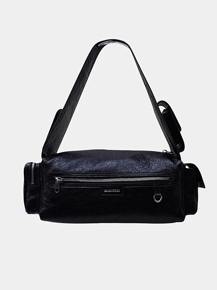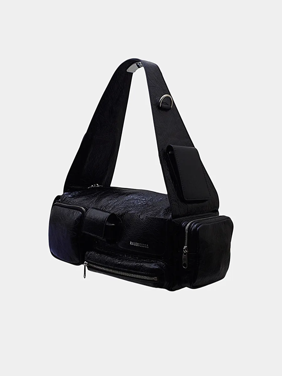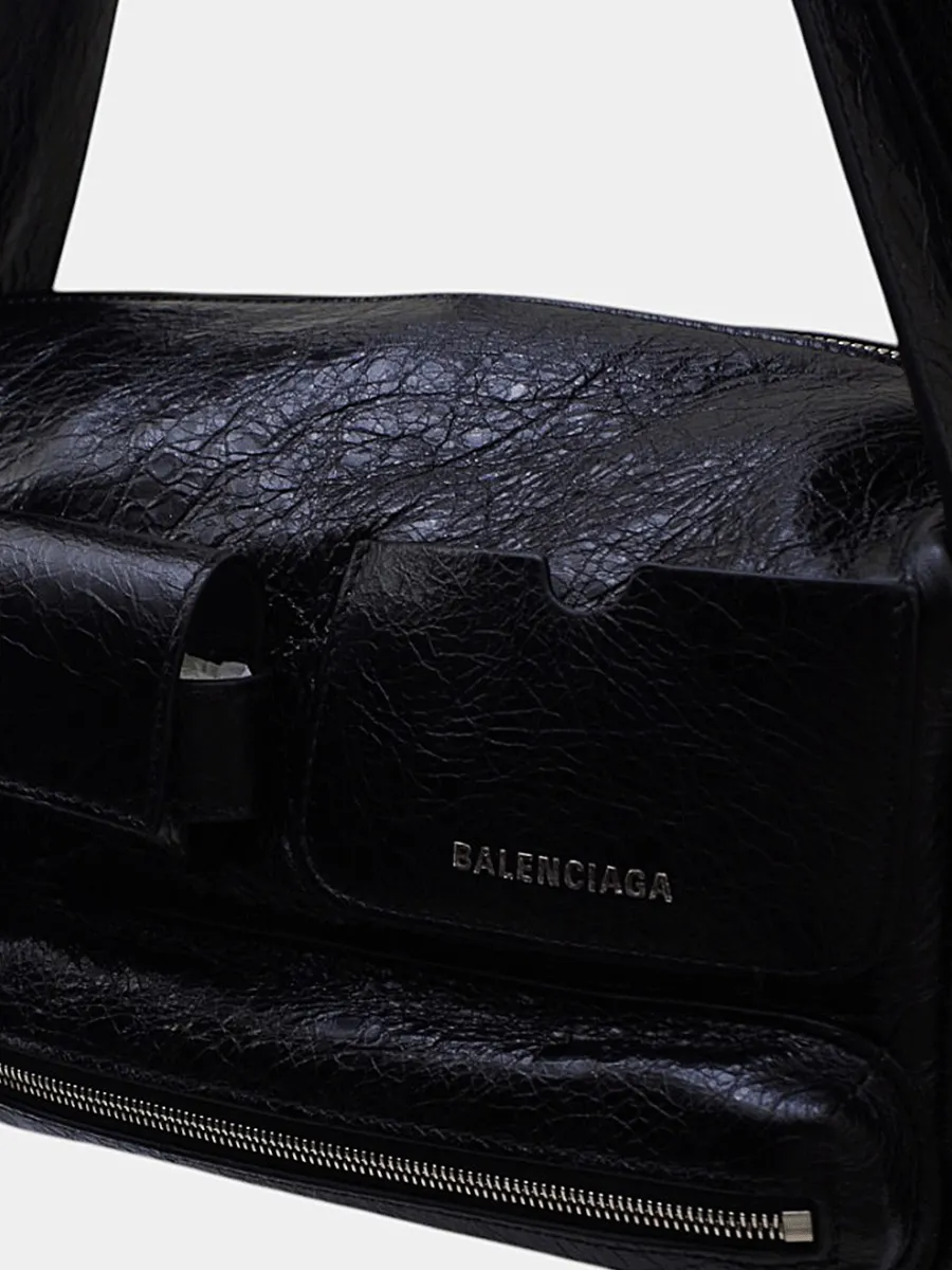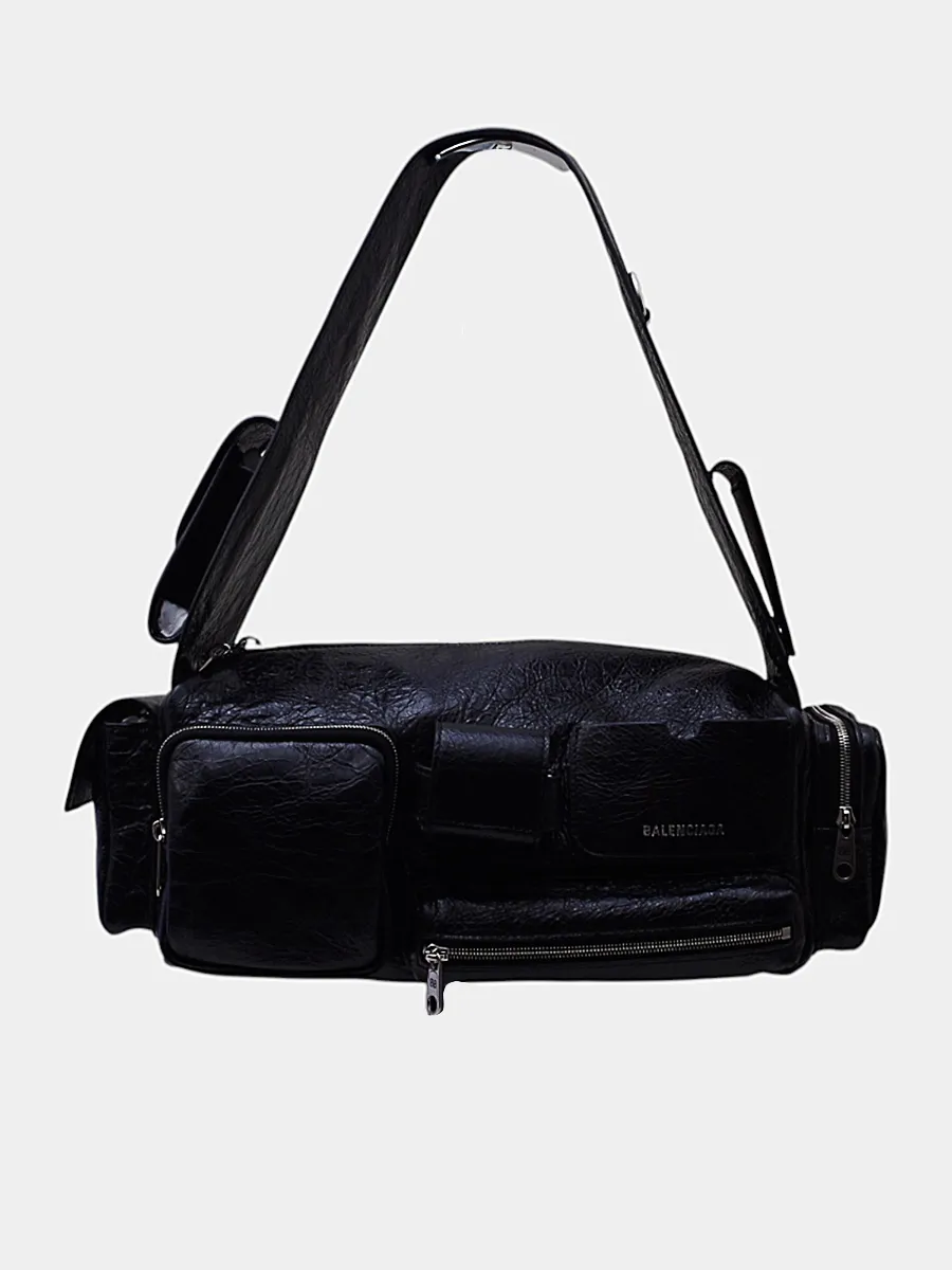 Сумка Balenciaga выполнена из текстурированной черной кожи с эффектом потертости, сочетает утилитарный дизайн и высокое качество: модель с регулируемым ремнем, множеством внешних карманов на молнии и тисненым логотипом — функциональный и стильный аксессуар в духе современной урбанистической моды.