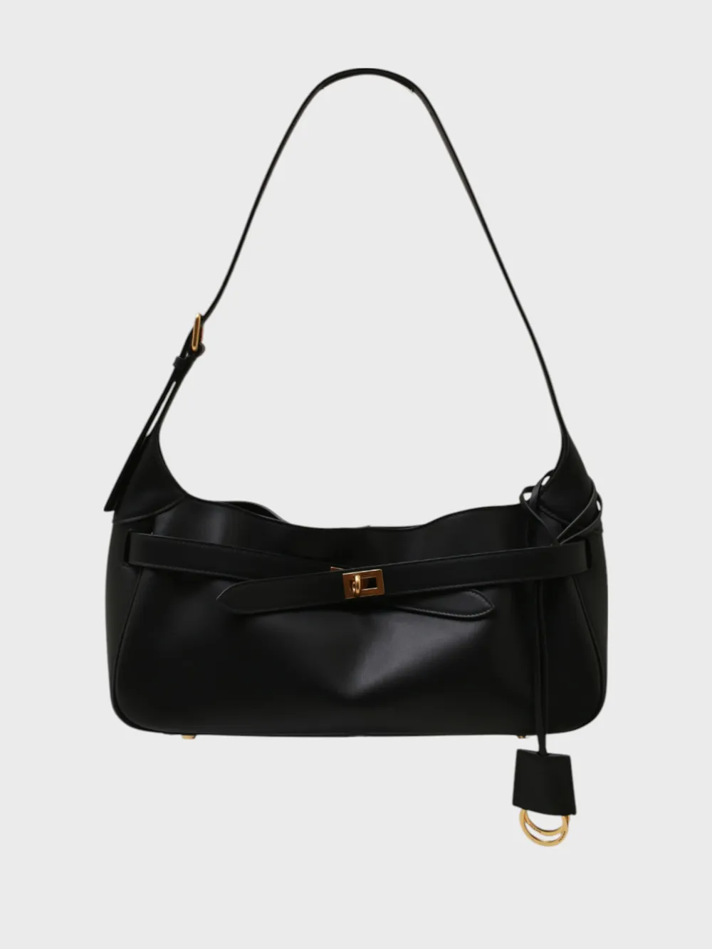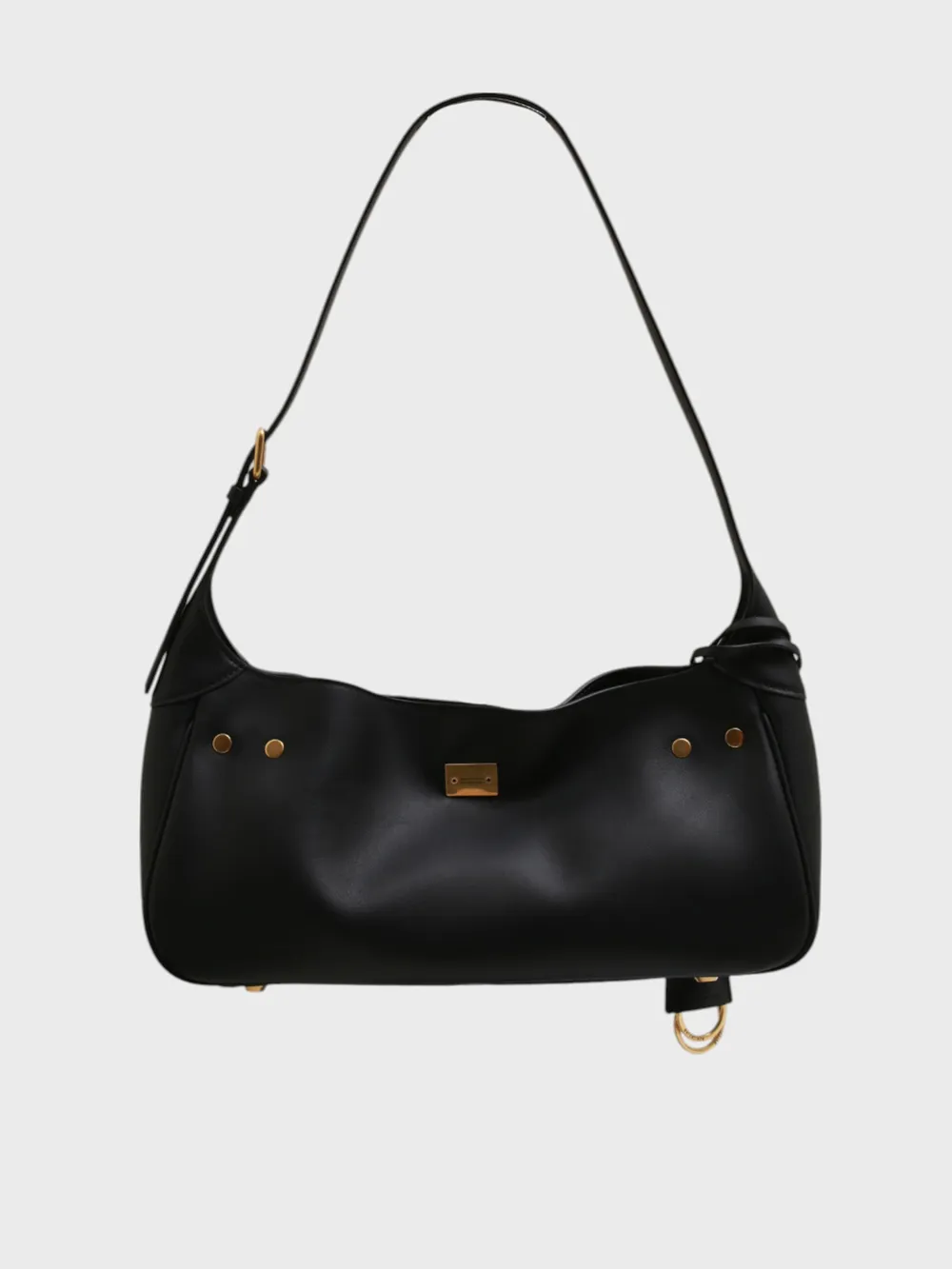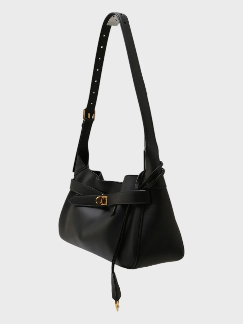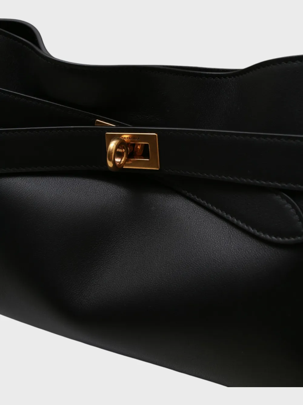 Сумка Balenciaga выполнена из черной гладкой кожи с элегантным дизайном и золотыми акцентами. Модель дополнена регулируемым плечевым ремнем, завязками на лицевой стороне и вместительным внутренним отделением. Стильная и универсальная — идеальный аксессуар для повседневного образа, сочетающий современность и классику.