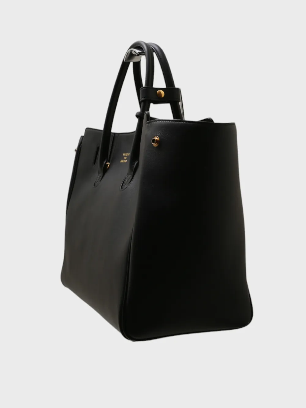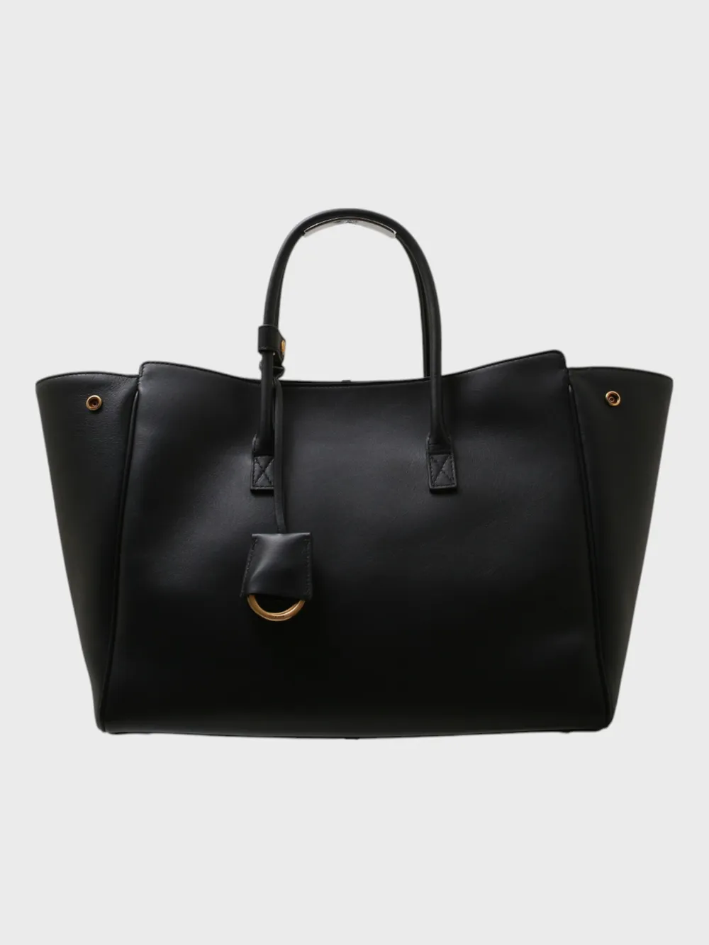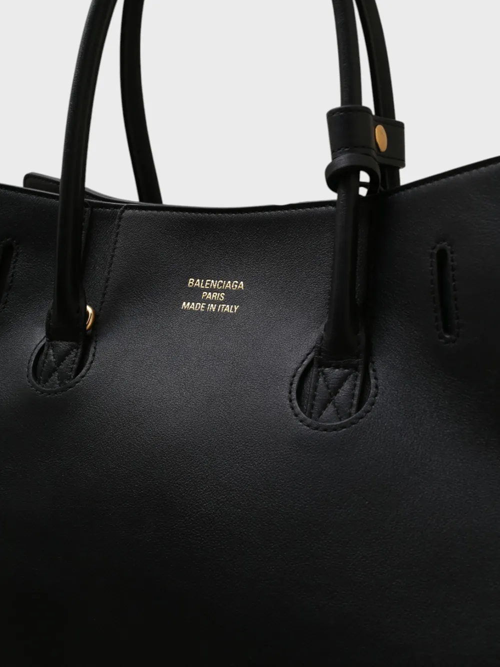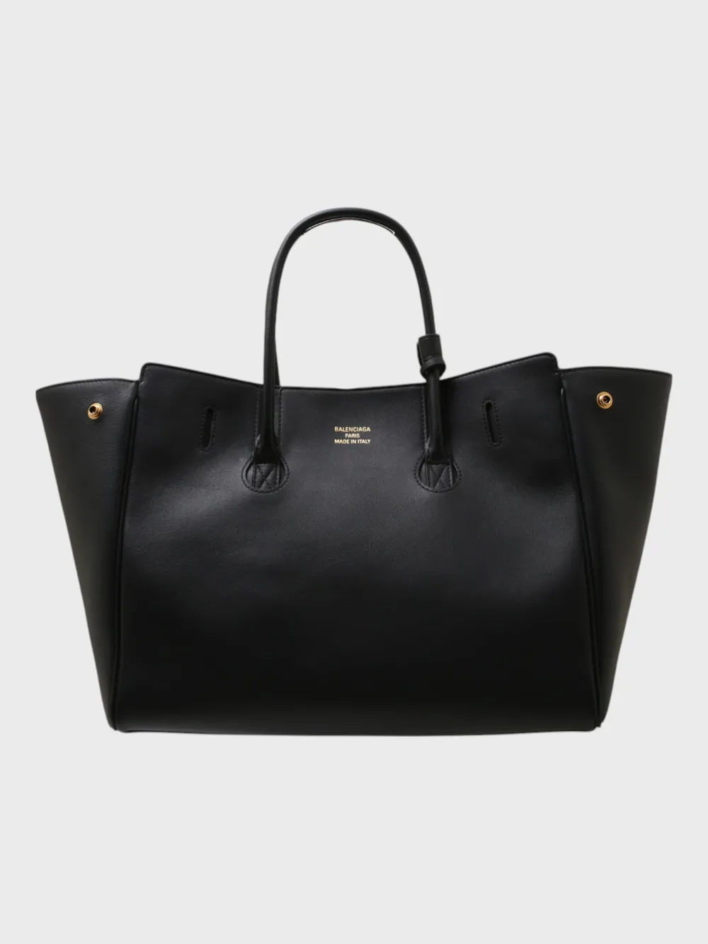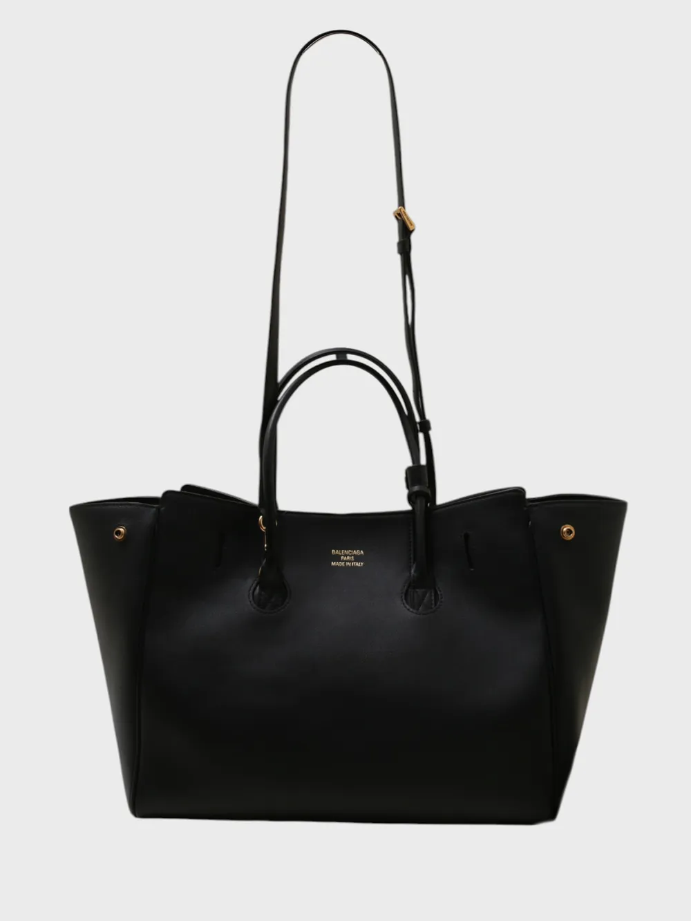 Сумка Balenciaga выполнена из черной фактурной кожи с лаконичным дизайном и золотыми деталями. Модель дополнена двумя ручками, регулируемым плечевым ремнем и вместительным внутренним отделением. Стильная и функциональная — идеальный аксессуар для повседневного образа, подчеркивающий современный и элегантный стиль.