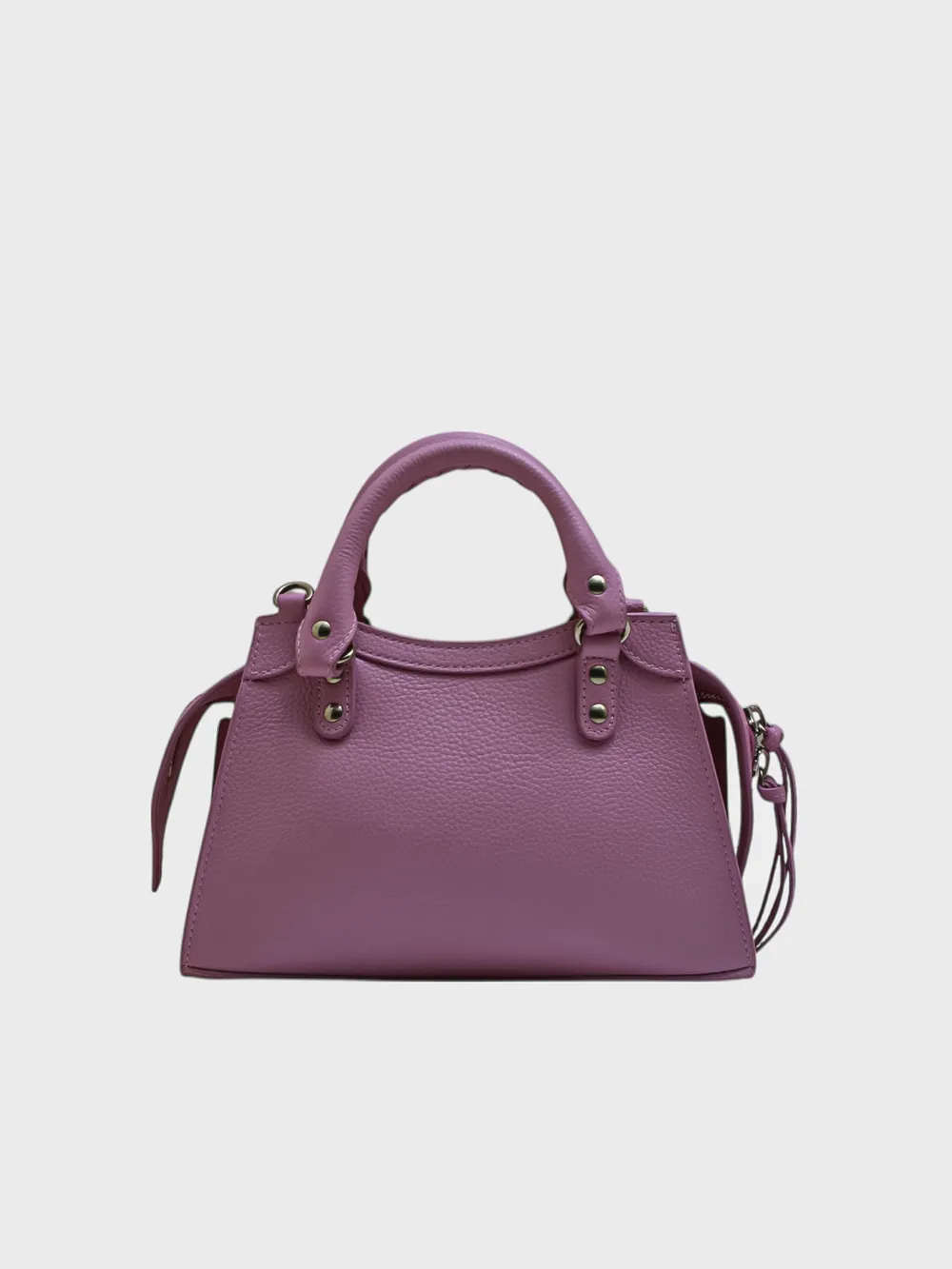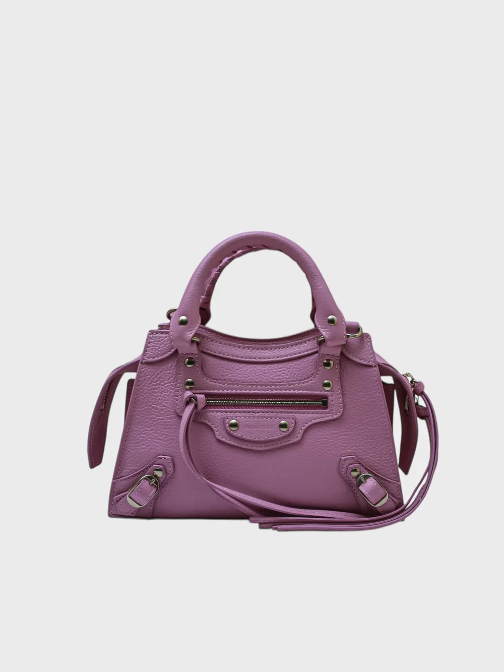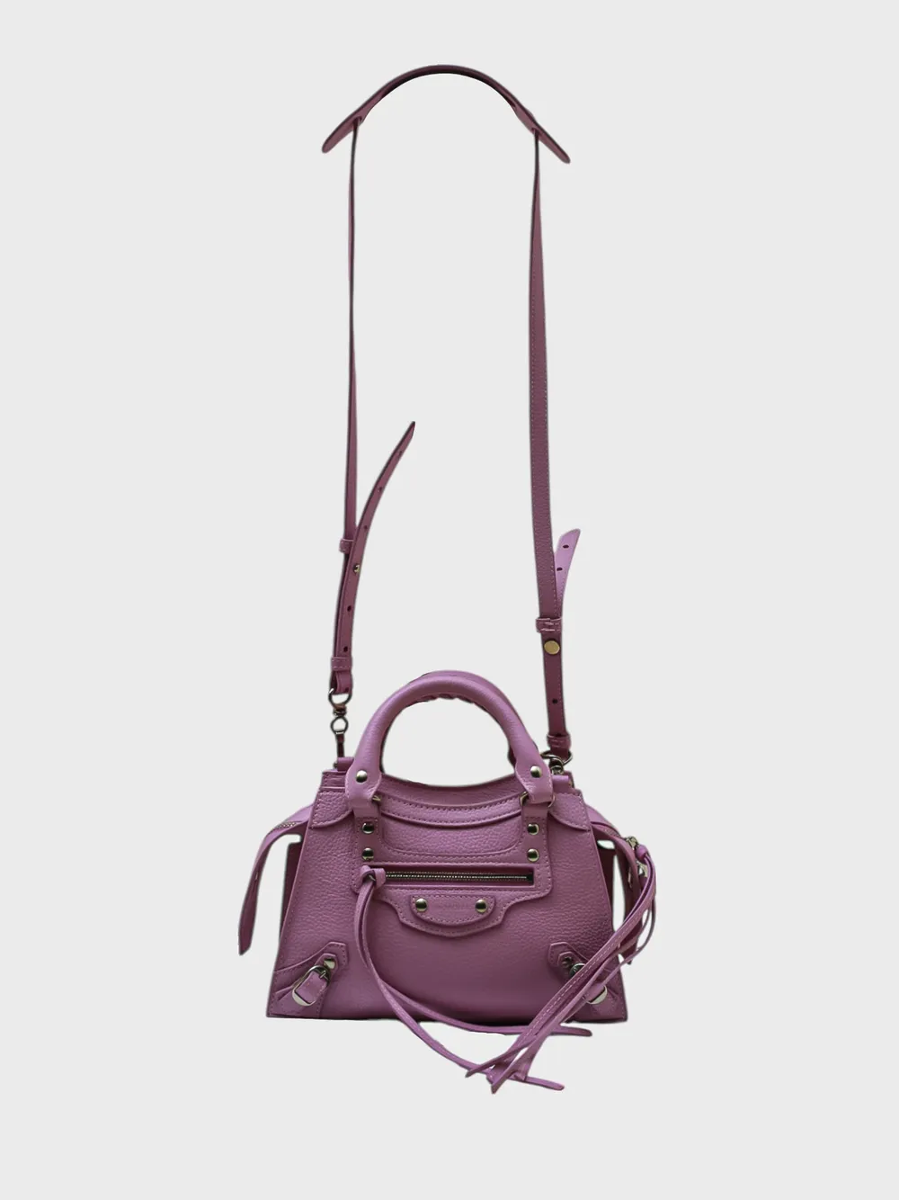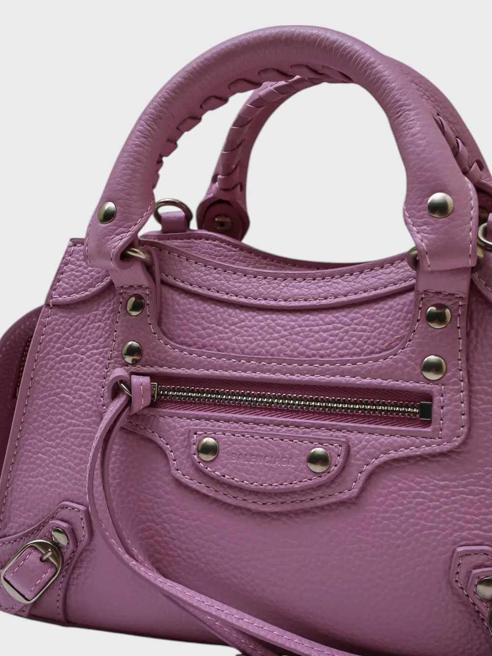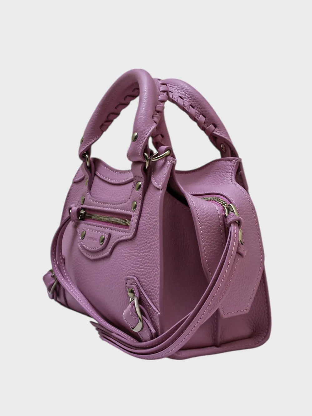 Сумка Balenciaga выполнена из качественной фактурной кожи розового цвета с текстурой, напоминающей граненую поверхность. Модель сочетает компактный прямоугольный силуэт и круглые ручки для удобства ношения на плече или в руке. Фронтальная часть декорирована металлическими деталями и молнией, придающими изделию современный вид. Внутри сумки просторное отделение с несколькими карманами для хранения различных предметов. Идеально для повседневного использования или деловых встреч.