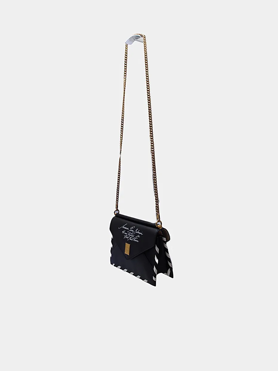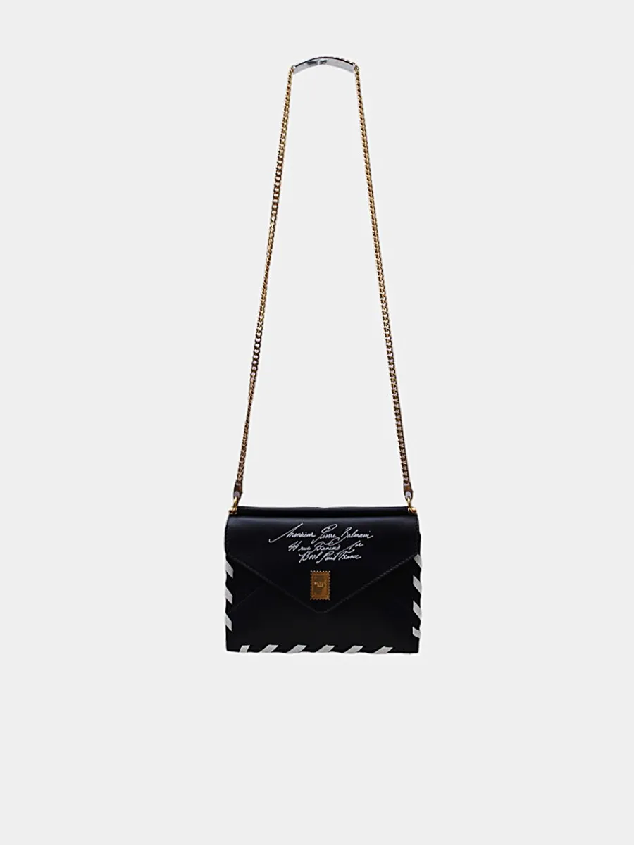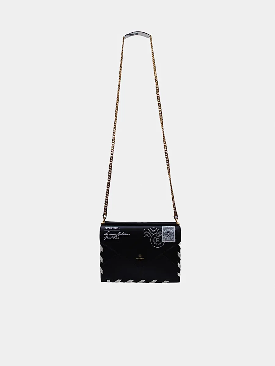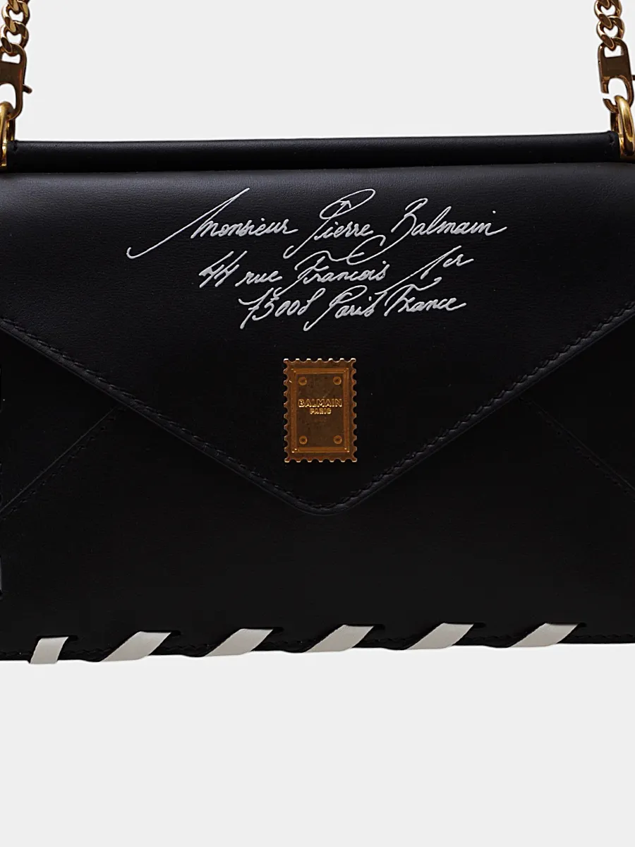 Сумка Balmain выполнена из гладкой черной кожи в форме конверта с элементами дизайна, вдохновленными почтовой тематикой — сочетание роскоши и арт-концепции. Модель с золотистой цепочкой, контрастной полосатой отделкой по краям и декоративной надписью в стиле рукописного адреса подчеркивает индивидуальность. Детали: металлическая табличка с логотипом и фирменный штамп добавляют узнаваемости. Идеальный аксессуар для стильных образов, где важна эксклюзивность и внимание к деталям.