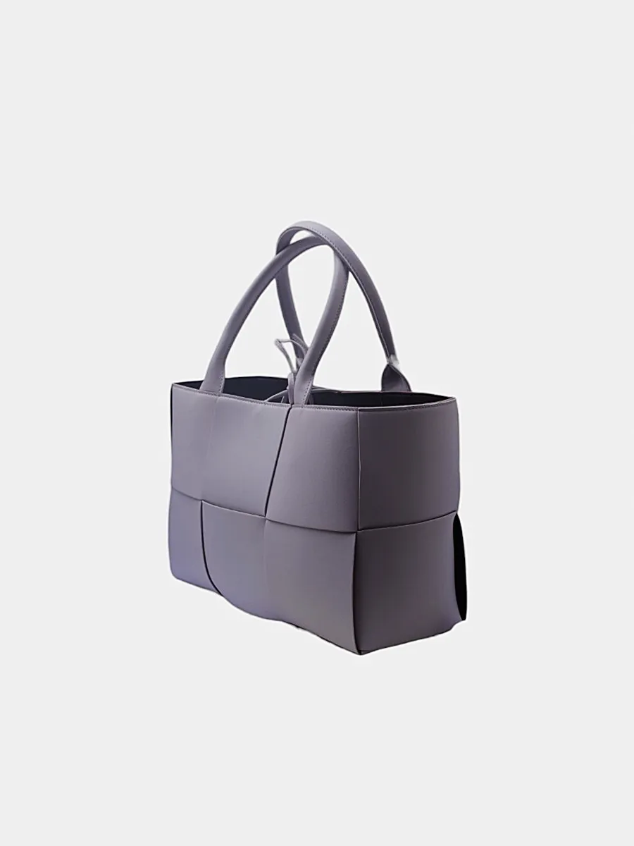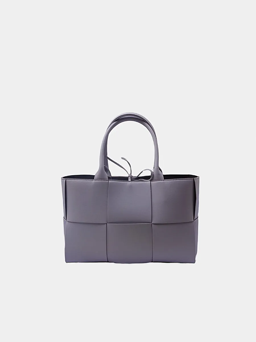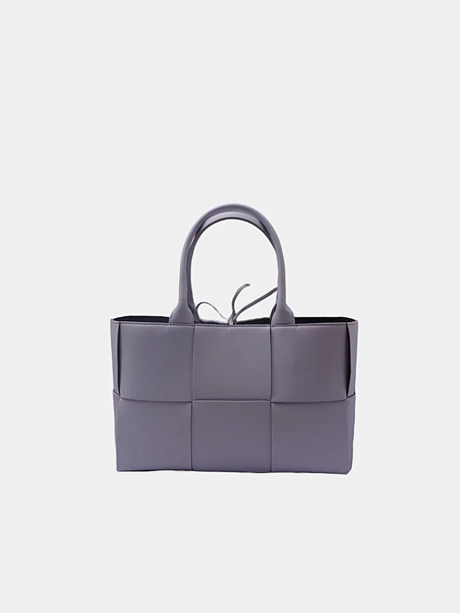 Сумка Bottega Veneta выполнена из гладкой кожи пастельно-серого цвета с фирменной плетёной текстурой Intrecciato в виде квадратных панелей; прямоугольная форма, короткие ручки и лаконичный дизайн подчёркивают минимализм и премиальность — универсальный аксессуар для повседневного образа.