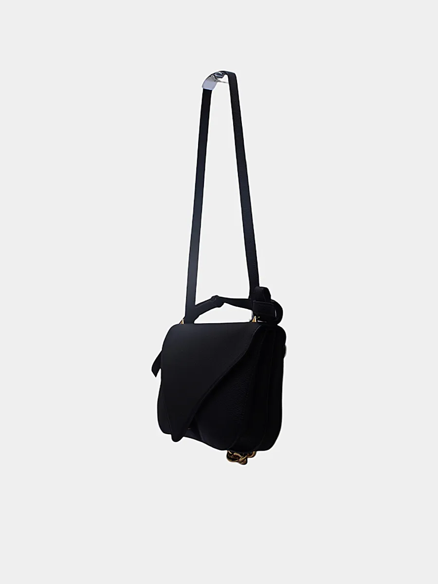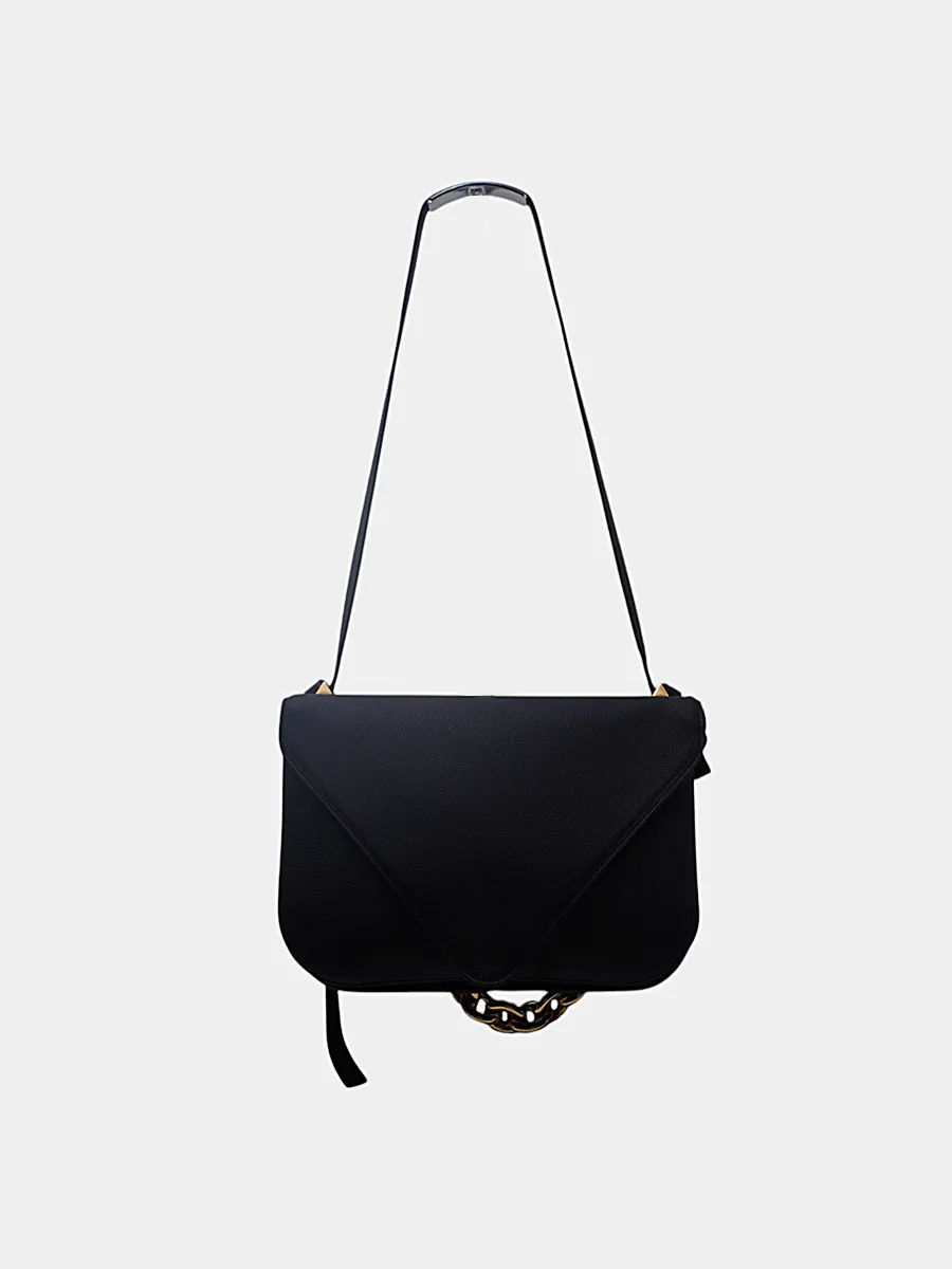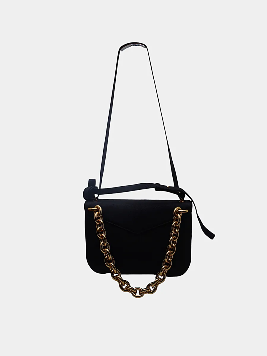 Сумка Bottega Veneta выполнена из гладкой кожи чёрного цвета с текстурой под зерно, сочетает минималистичный силуэт и роскошные детали: клапан-конверт, длинный регулируемый ремень и массивная золотистая цепь на передней части; качественная фурнитура и лаконичный дизайн подчёркивают премиальность — универсальный аксессуар для современного образа.