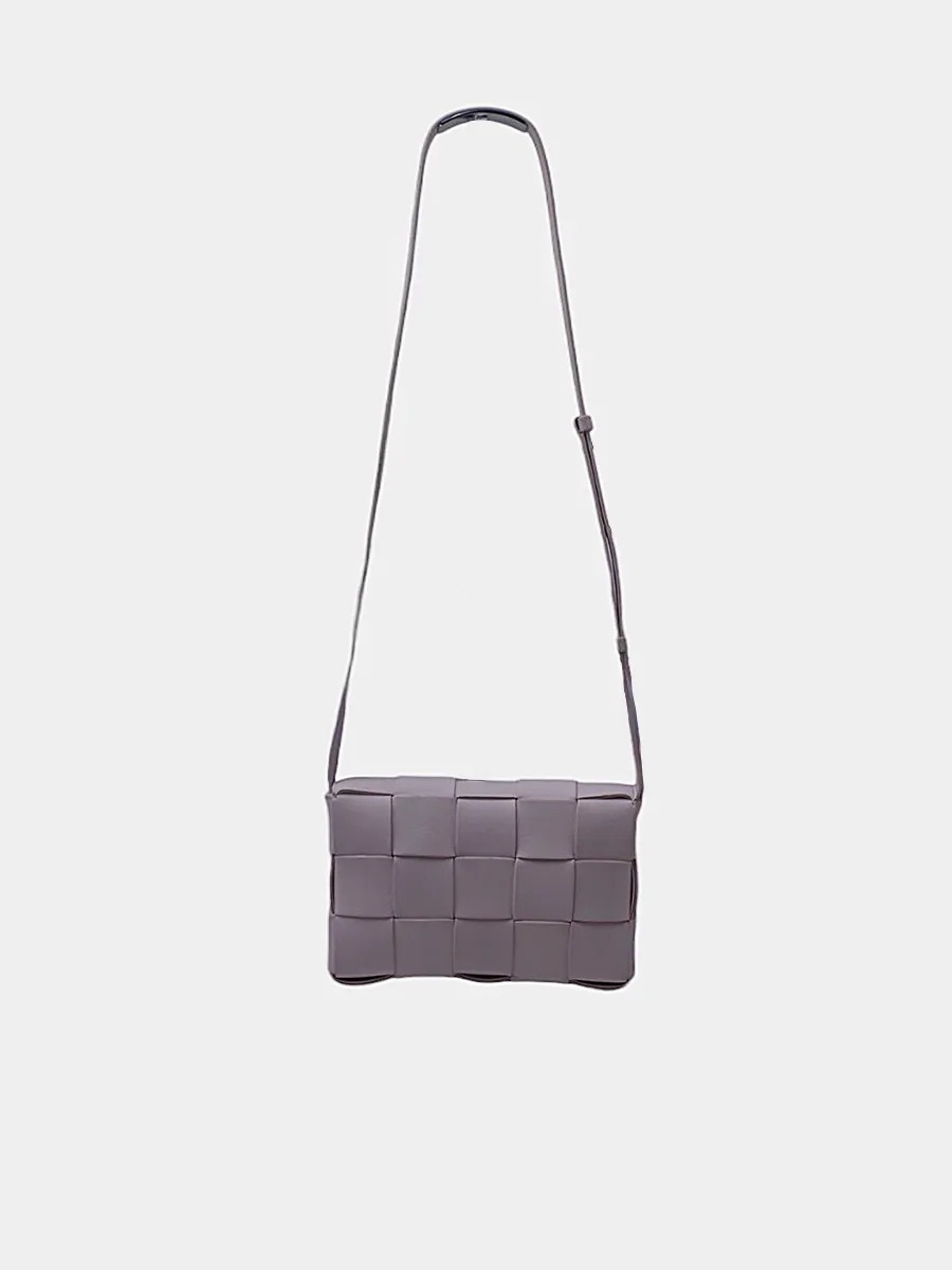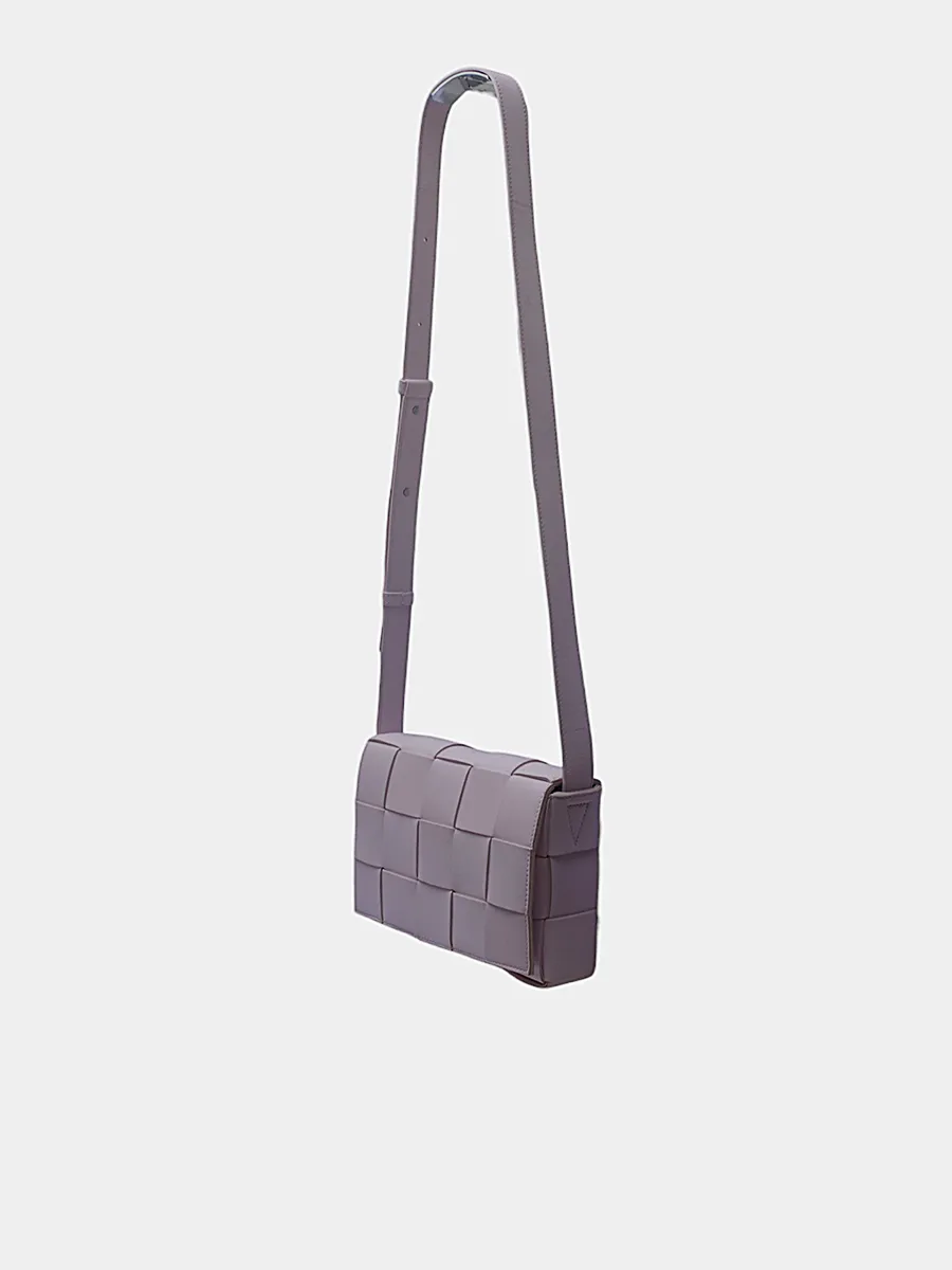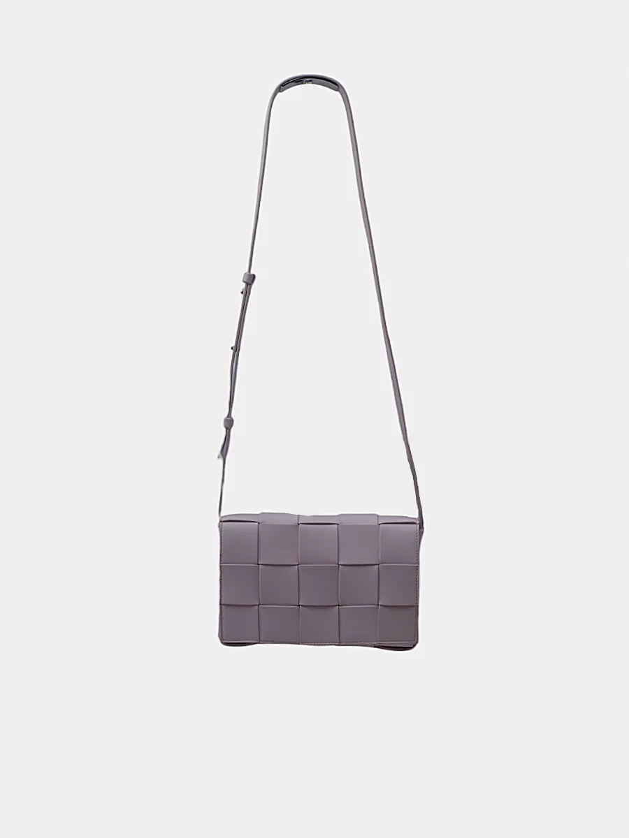 Сумка Bottega Veneta выполнена из гладкой кожи пастельно-серого цвета с фирменной плетёной текстурой Intrecciato в виде квадратных панелей; длинный регулируемый ремень и лаконичный прямоугольный силуэт подчёркивают минимализм и премиальность — универсальный аксессуар для повседневного и вечернего образа.