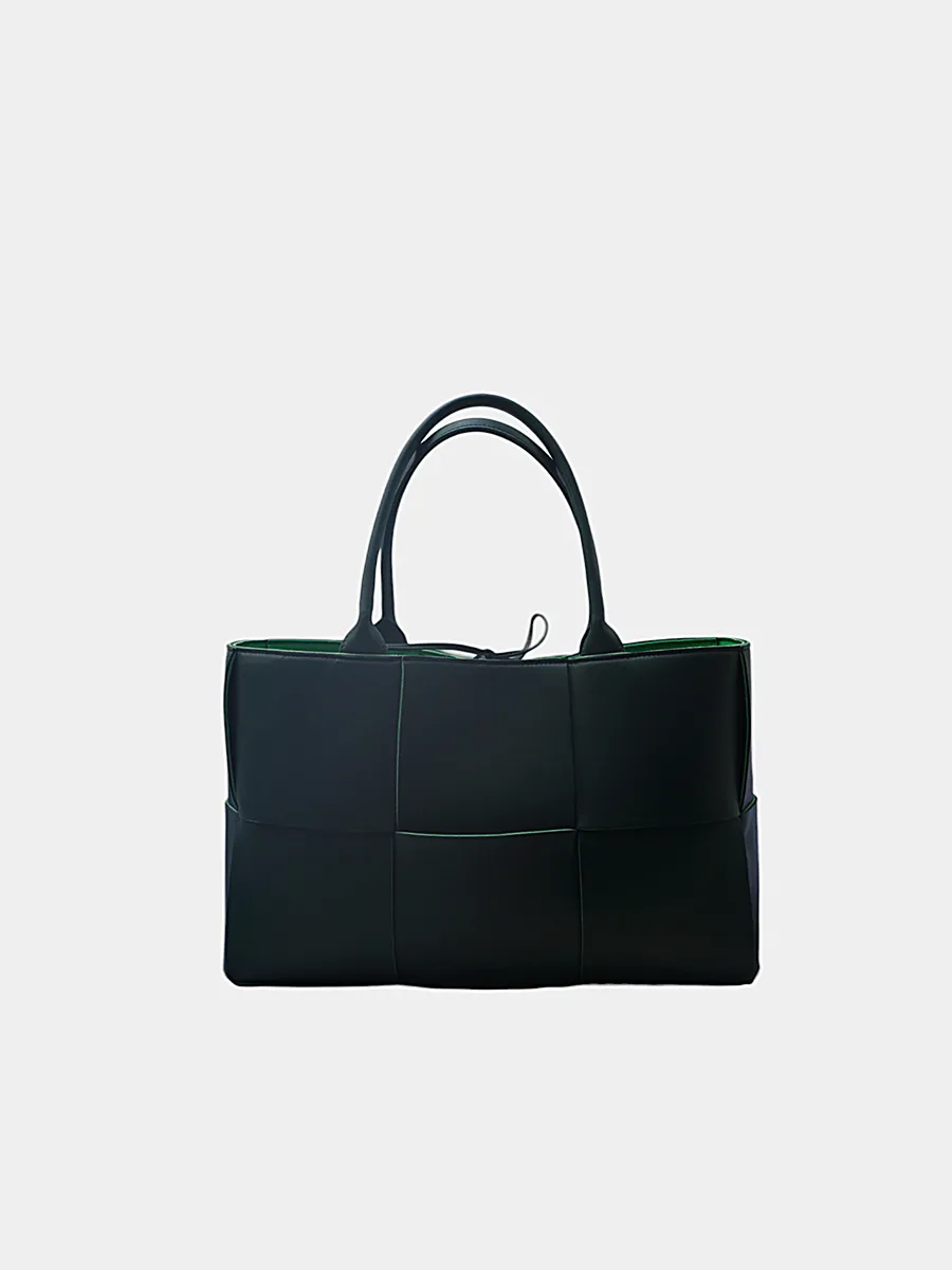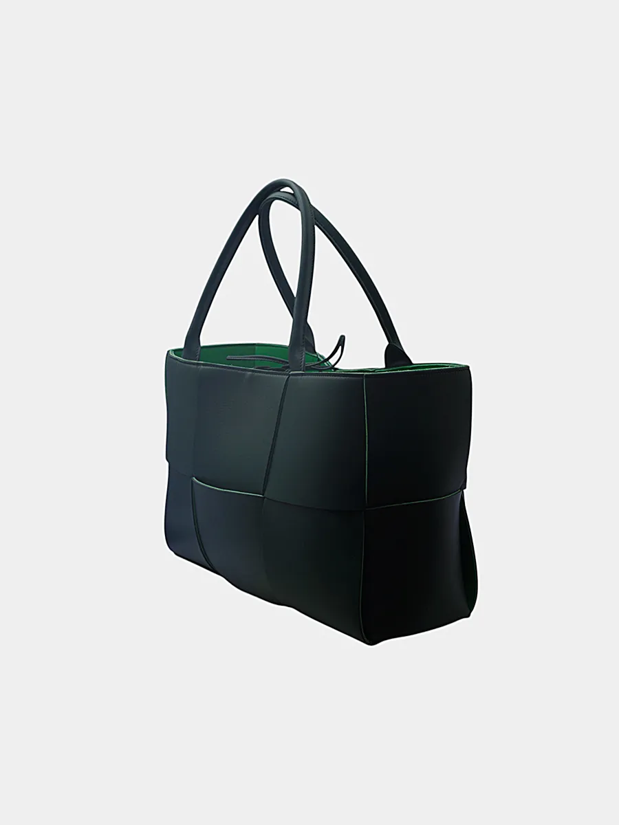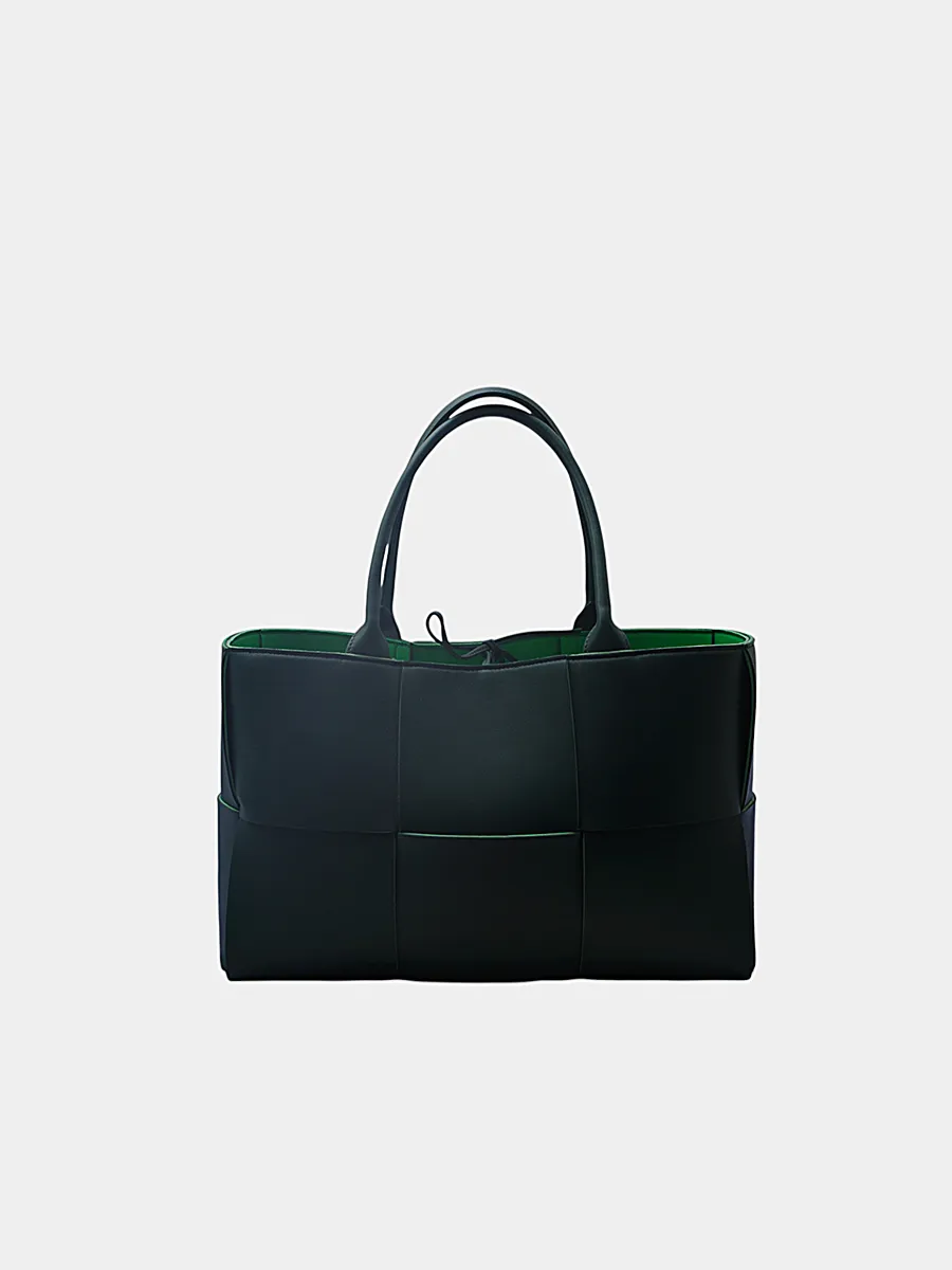 Сумка Bottega Veneta выполнена из гладкой черной кожи в технике Intrecciato — сочетание структурированного кроя и узнаваемого плетения. Модель с двумя ручками, прямоугольной формой и контрастной зеленой подкладкой подчеркивает минимализм и функциональность. Безупречная посадка, качественная фурнитура и лаконичный дизайн делают её универсальным аксессуаром для повседневного и делового образа. Идеальное воплощение элегантности и мастерства бренда.