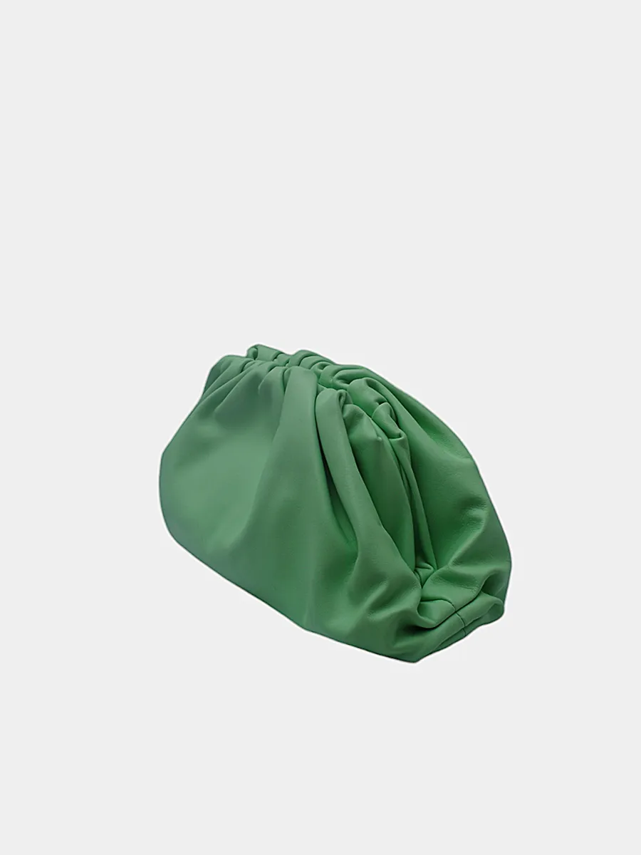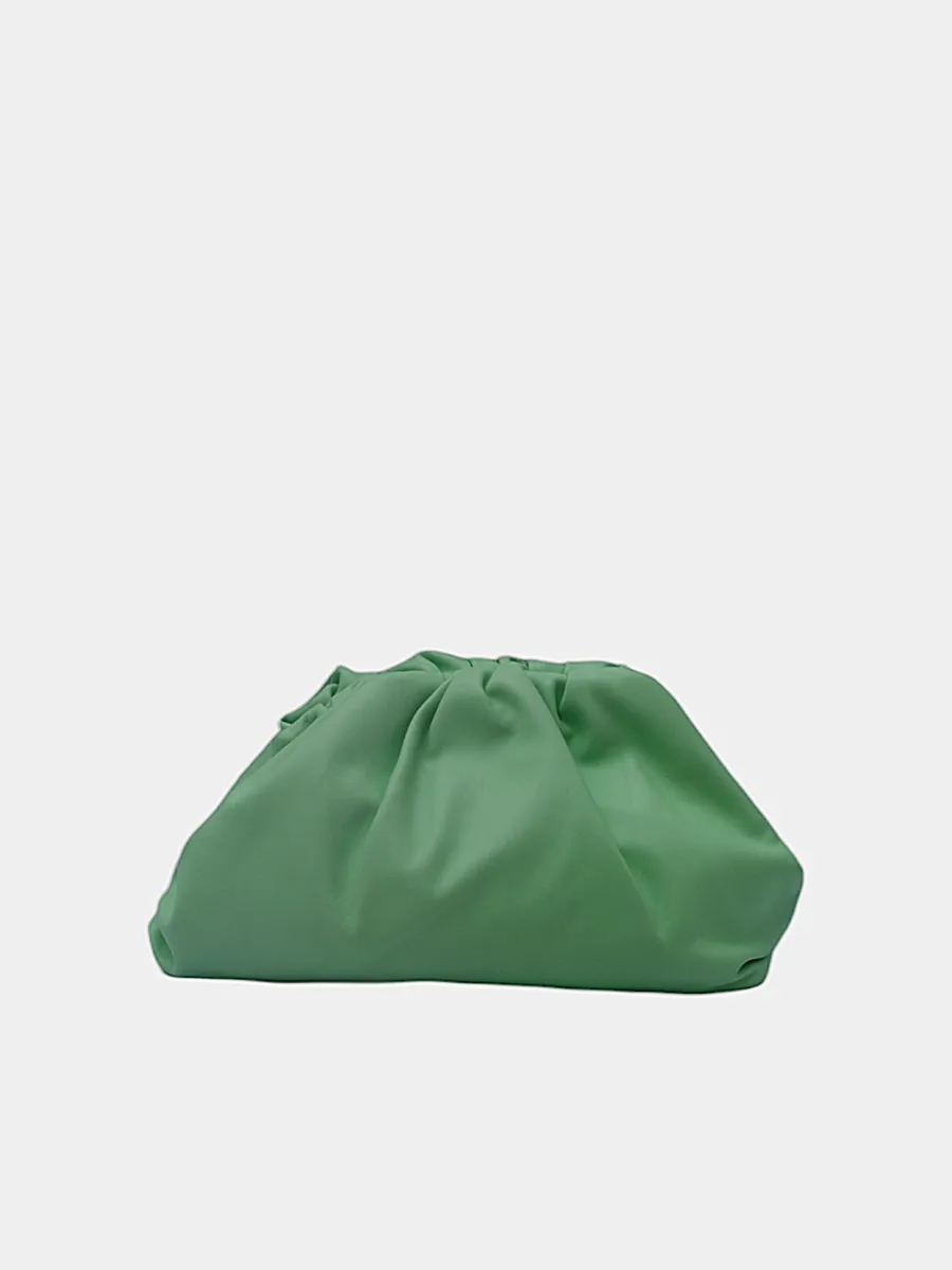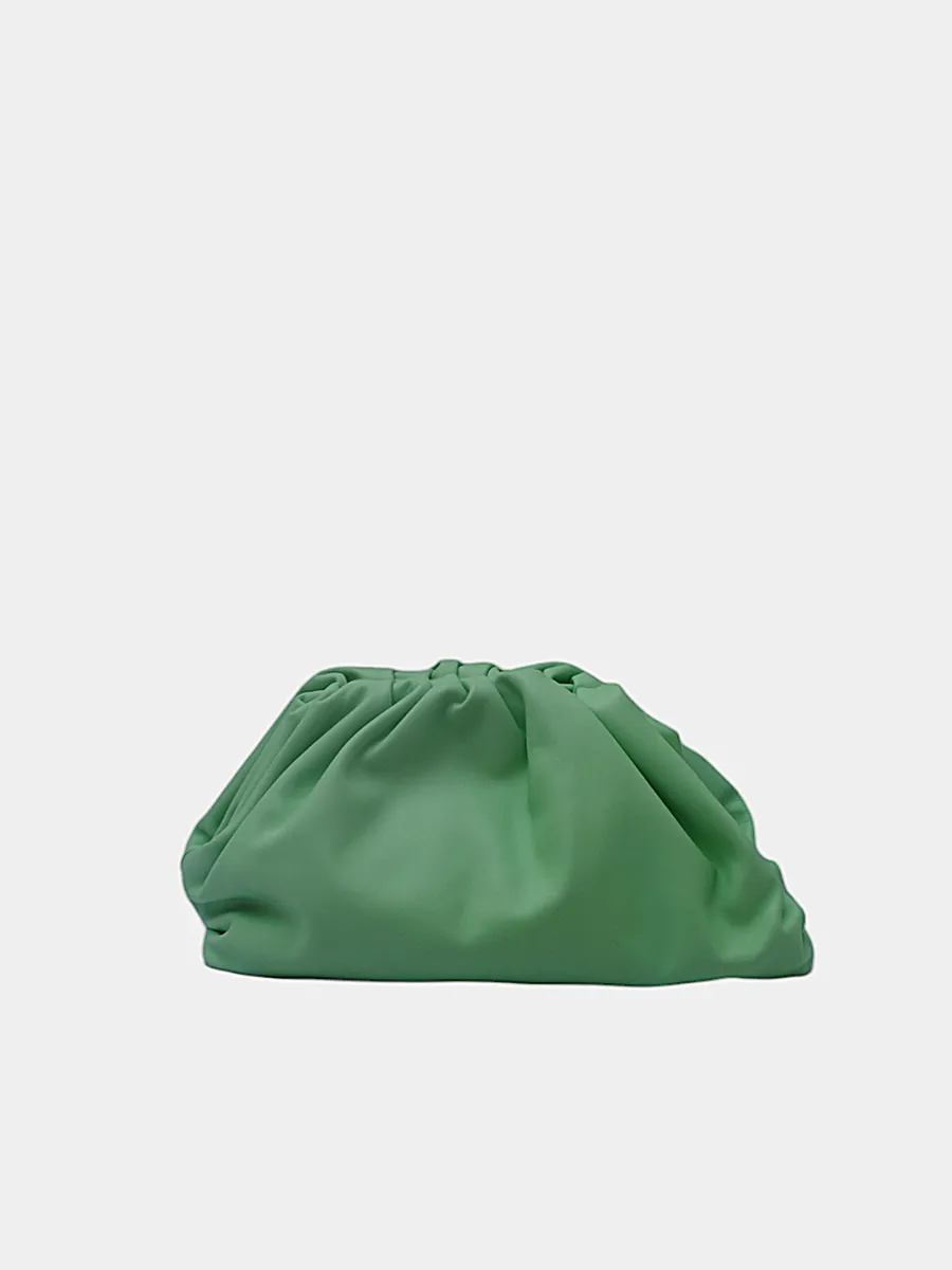 Сумка Bottega Veneta выполнена из гладкой кожи насыщенного зелёного цвета с минималистичным дизайном: мягкая, объёмная форма с эффектом складок и завязками сверху подчёркивает элегантность и современность — универсальный аксессуар для вечернего образа.