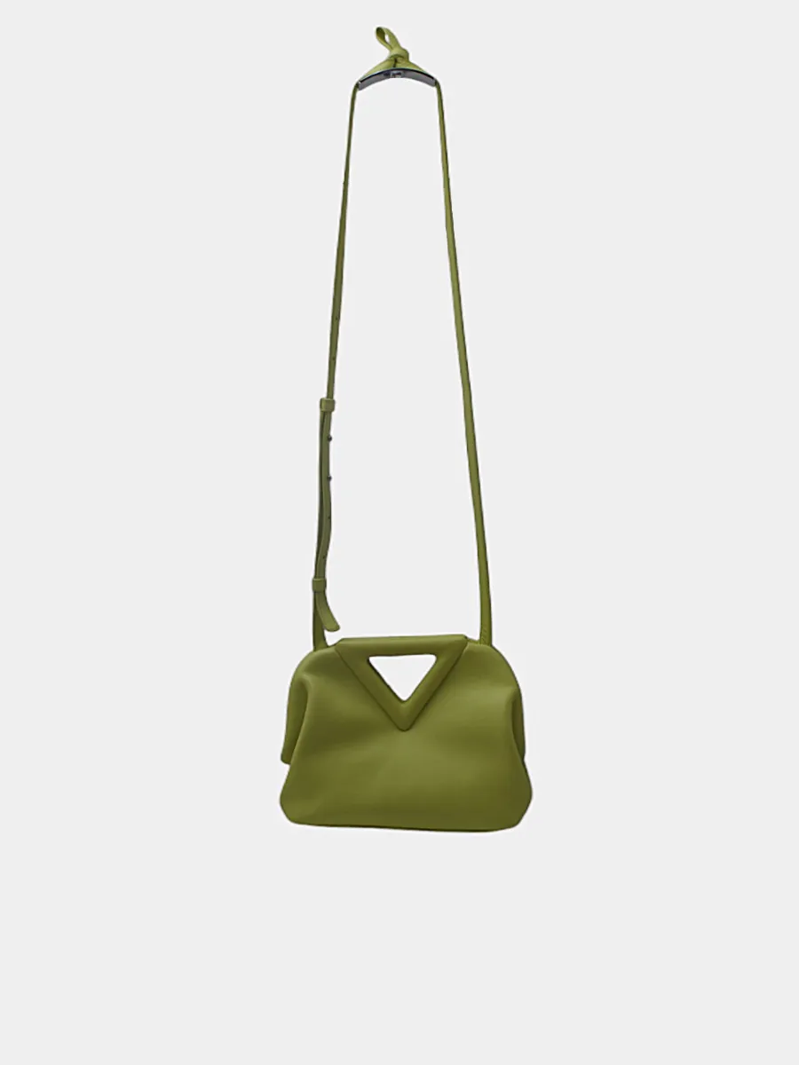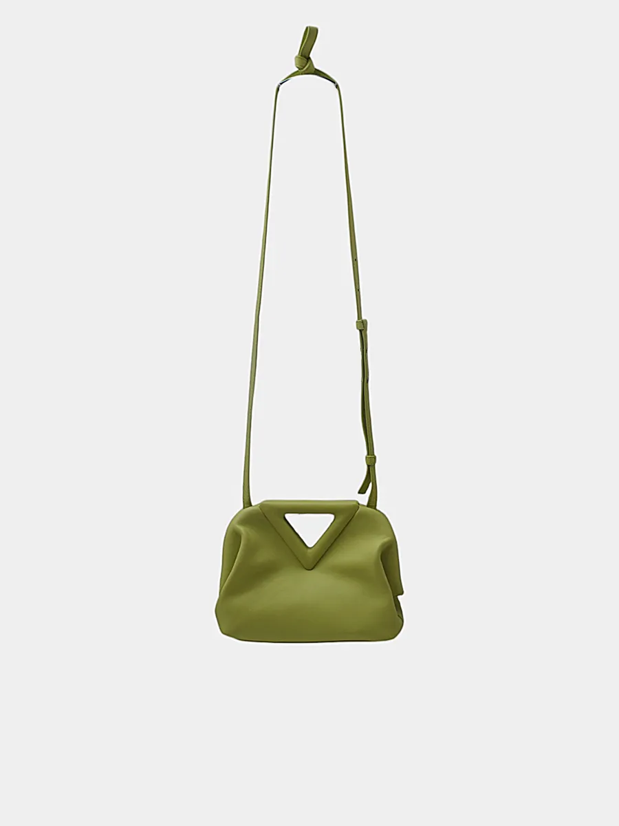 Сумка Bottega Veneta выполнена из гладкой кожи оливкового оттенка с минималистичным дизайном и характерной треугольной ручкой. Модель с длинным регулируемым ремнем сочетает современные формы и безупречное качество — идеальный аксессуар для стильных образов в духе итальянской элегантности.