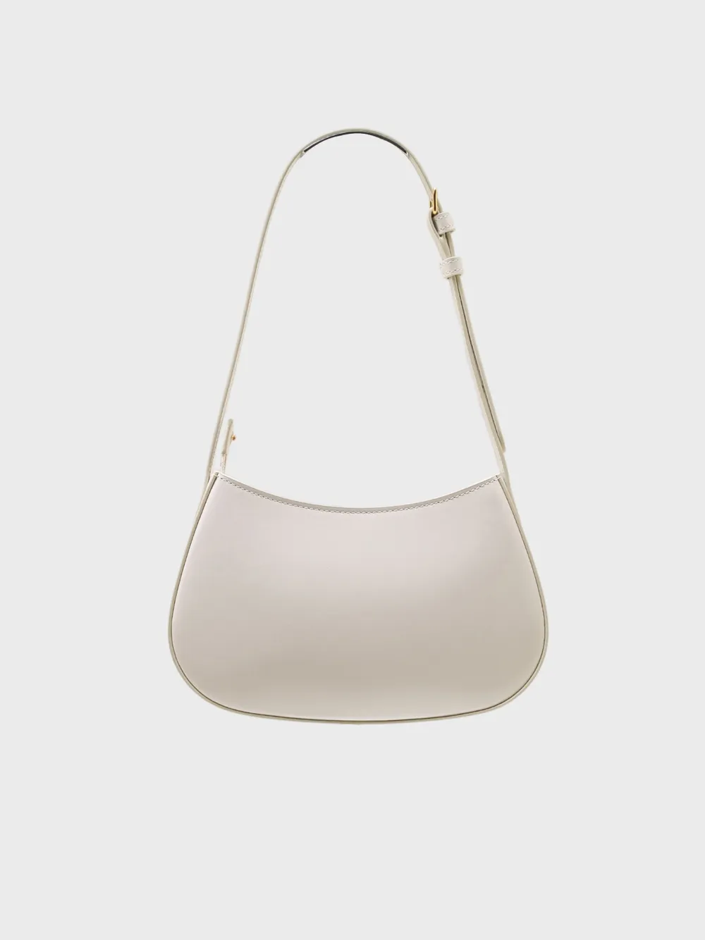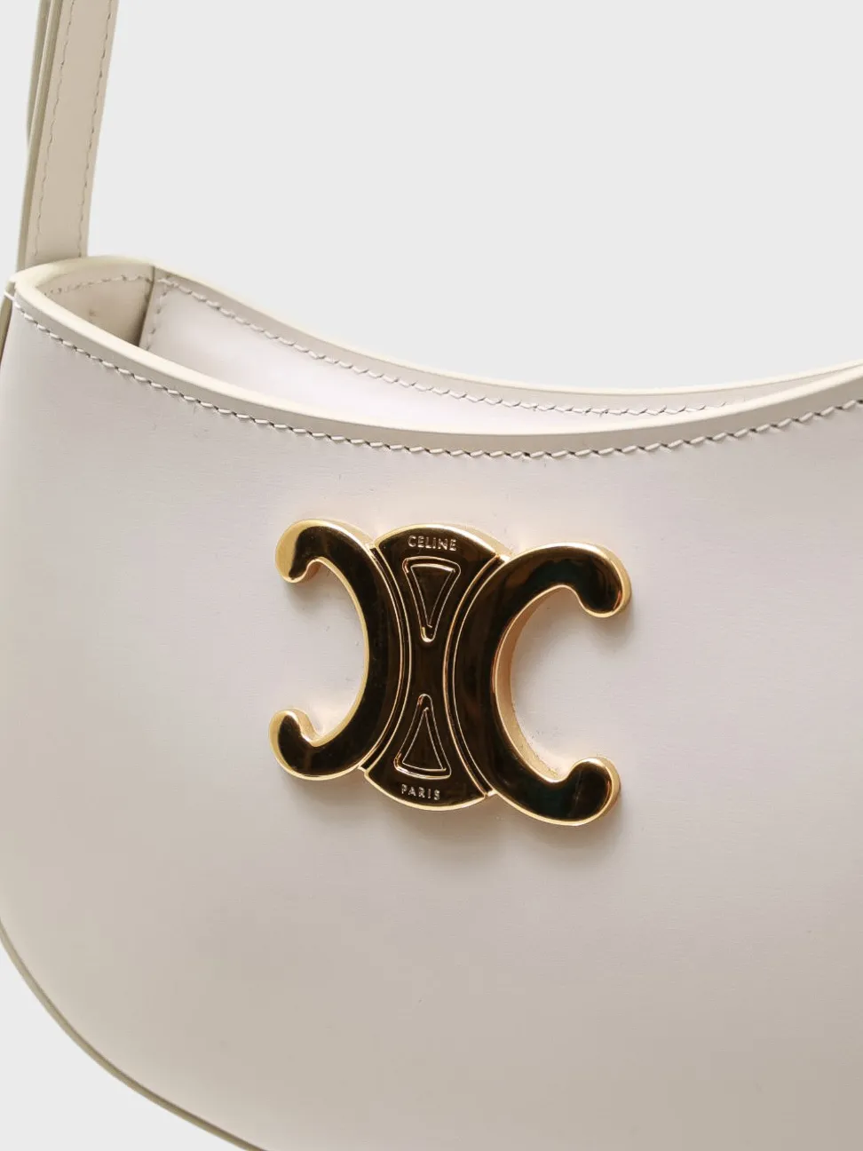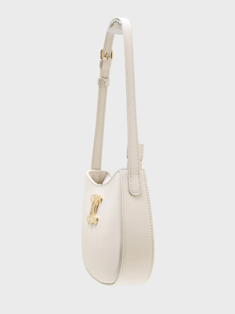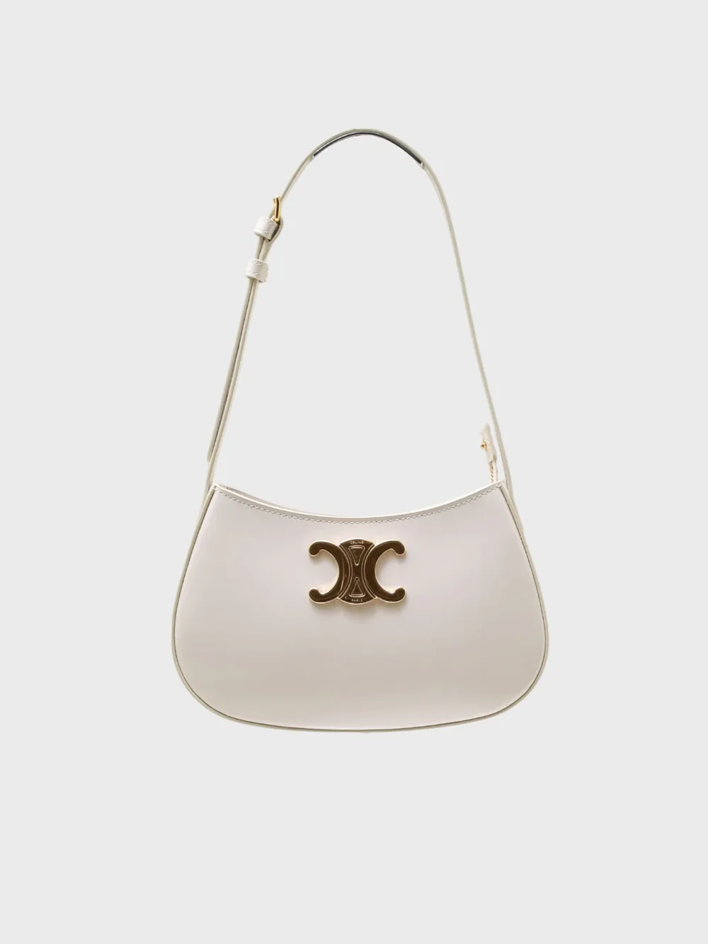 Стильная сумка из белой гладкой кожи с лаконичным дизайном и фирменной золотой металлической застежкой в виде логотипа бренда. Модель дополнена регулируемым плечевым ремнем, который позволяет носить как через плечо, так и на руке. Простая форма и качественные материалы делают эту сумку универсальным аксессуаром для повседневного образа.