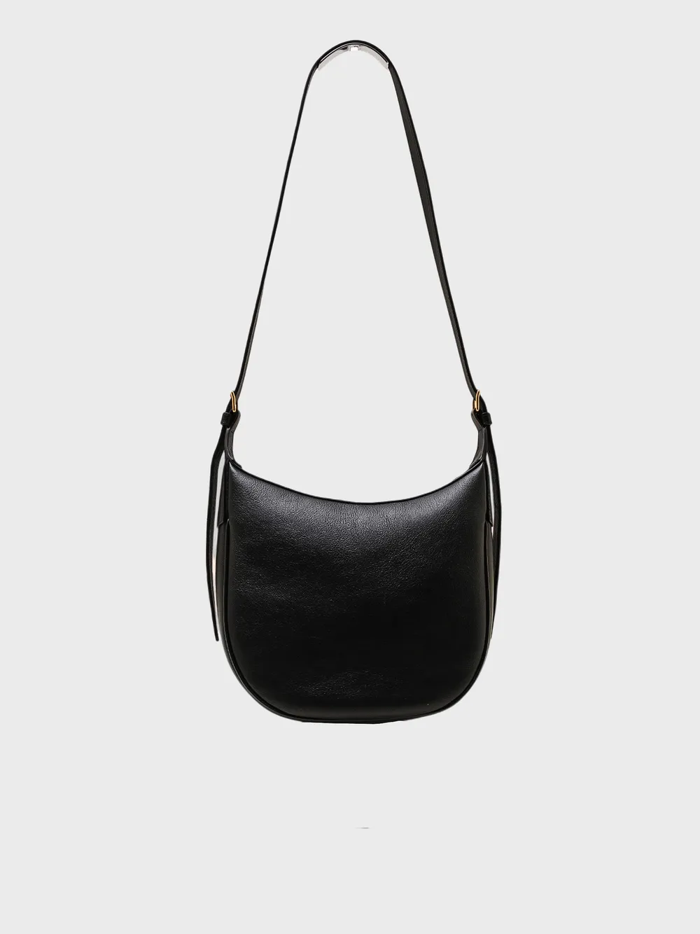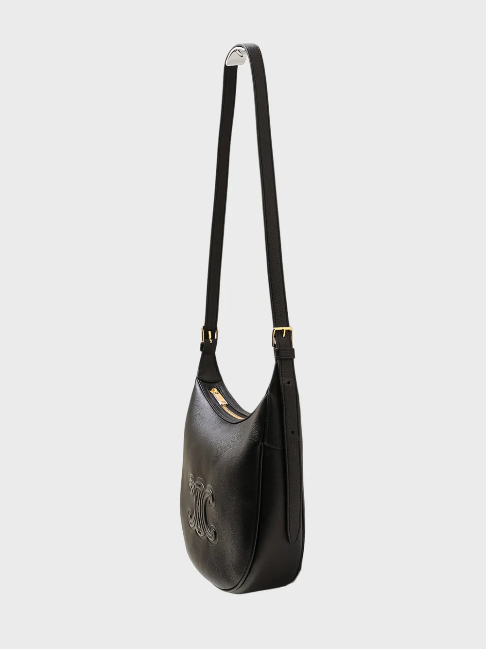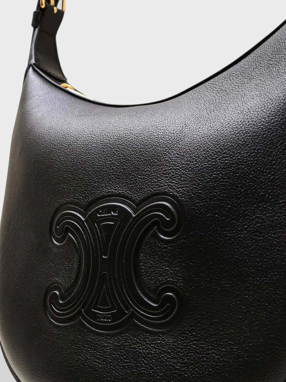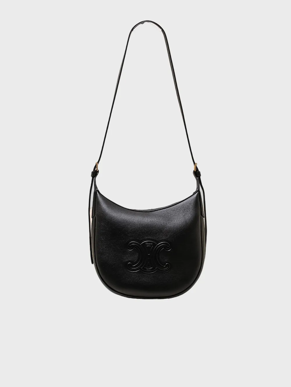 Сумка Celine выполнена в черном цвете из качественной натуральной кожи с текстурой. Модель представляет собой классический дизайн хобо (hobo bag) с широким плечевым ремнем, который можно носить как через плечо, так и на руке. На передней части сумки расположен крупный логотип "CELINE" в виде выгравированного монограммы, что добавляет узнаваемости бренда. Сумка оснащена застежкой-молнией для удобства использования и имеет внутренний карман для дополнительной организации вещей. Идеально подходит для повседневной носки или деловых встреч.