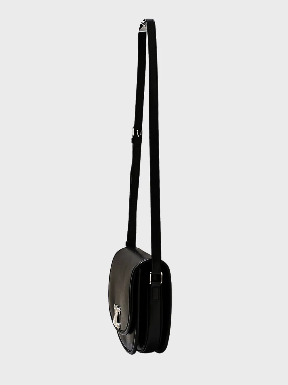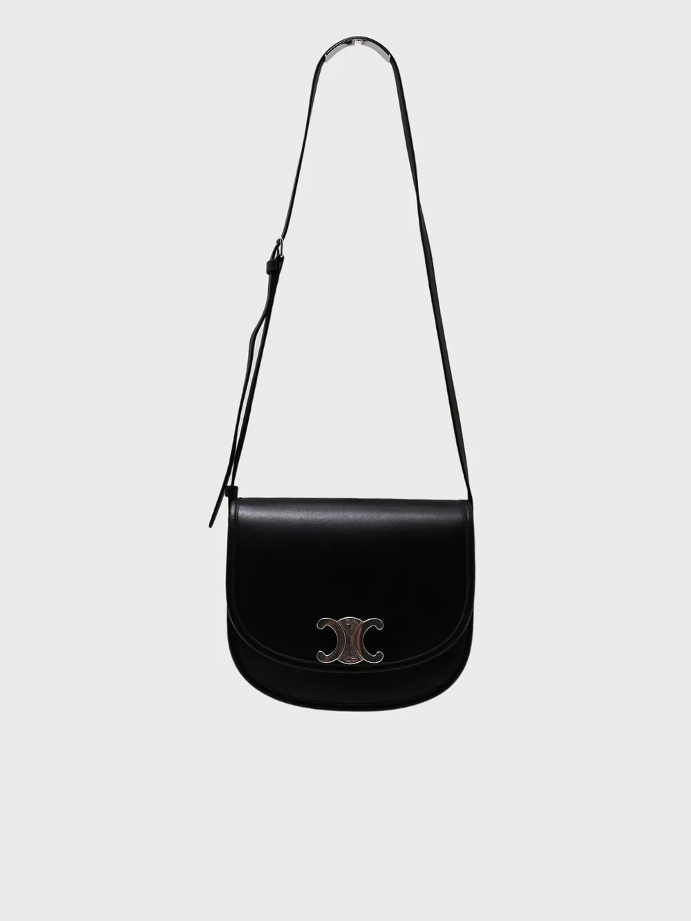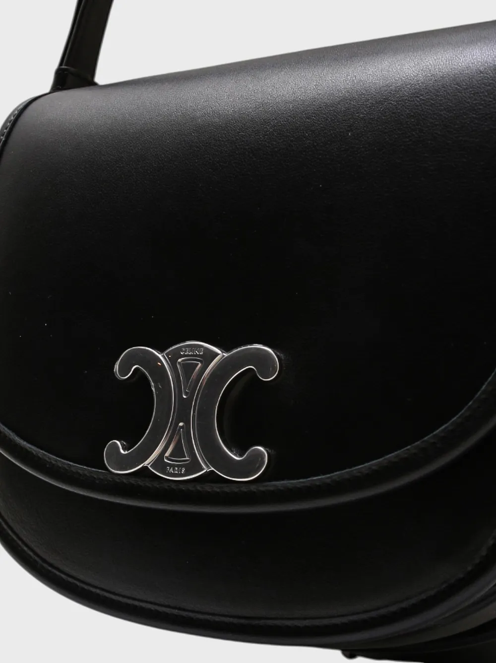 Сумка Celine выполнена из качественной черной кожи с гладкой фактурой. Модель оформлена лаконичным дизайном и дополнена металлическим логотипом бренда в виде крупного "C" на передней части. Дополнена регулируемым плечевым ремнем для комфортного ношения. Застежка-ремешок с металлической фурнитурой обеспечивает надежность и стильный внешний вид. Компактные размеры и универсальный дизайн делают эту сумку идеальным аксессуаром для повседневного использования или деловых встреч.
