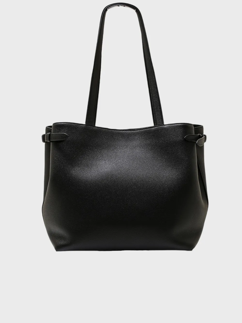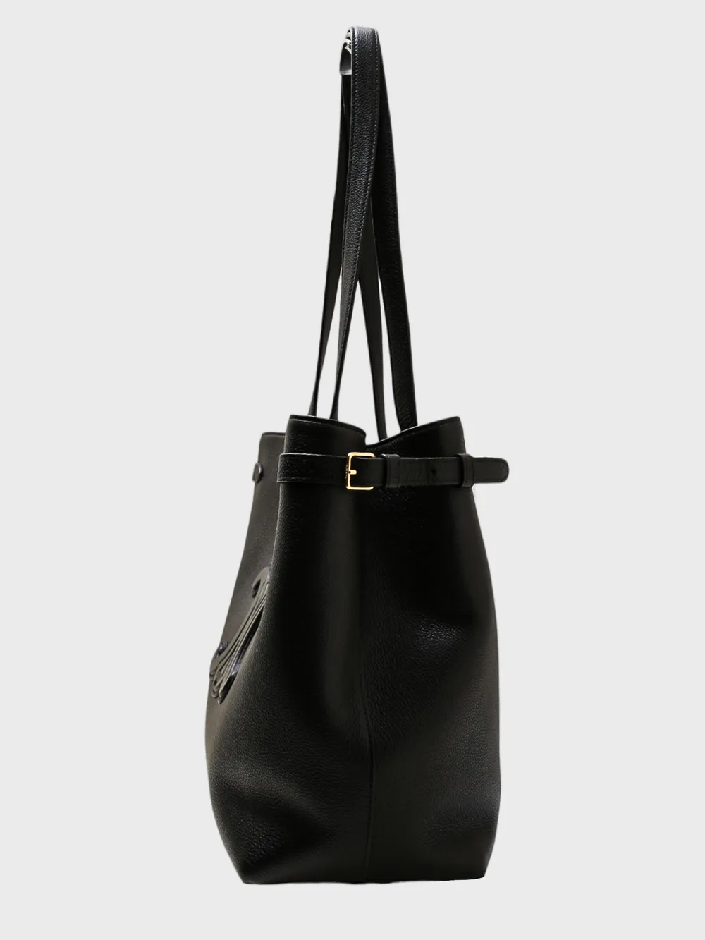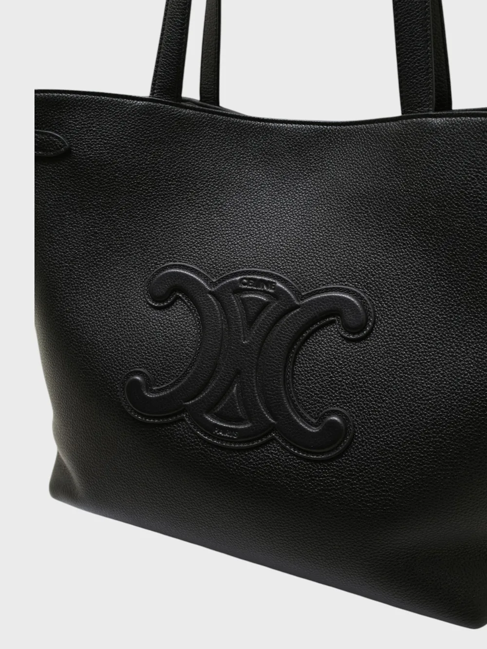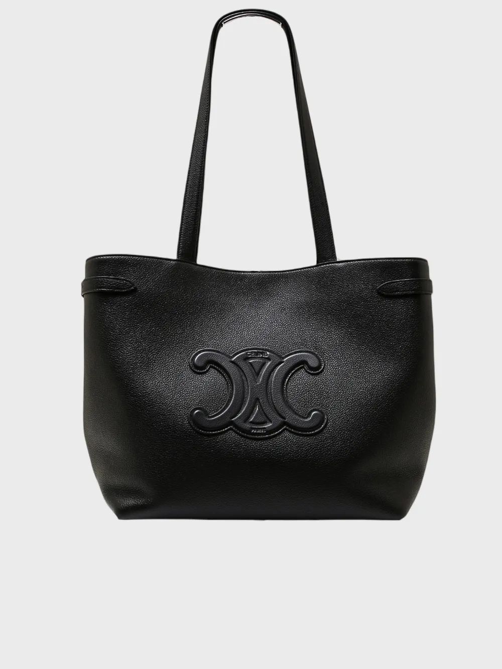 Сумка Celine выполнена из черной фактурной кожи с матовым блеском, обеспечивающей долговечность и стильный внешний вид. Модель дополнена двумя ручками для удобного ношения на плече или в руке, а также ремешком-обручем вокруг корпуса для регулировки формы. На передней части сумки расположен объемный логотип бренда, созданный из контрастной кожи, что придает изделию современный и узнаваемый дизайн. Простой, но элегантный силуэт делает эту сумку универсальным аксессуаром для повседневного использования.