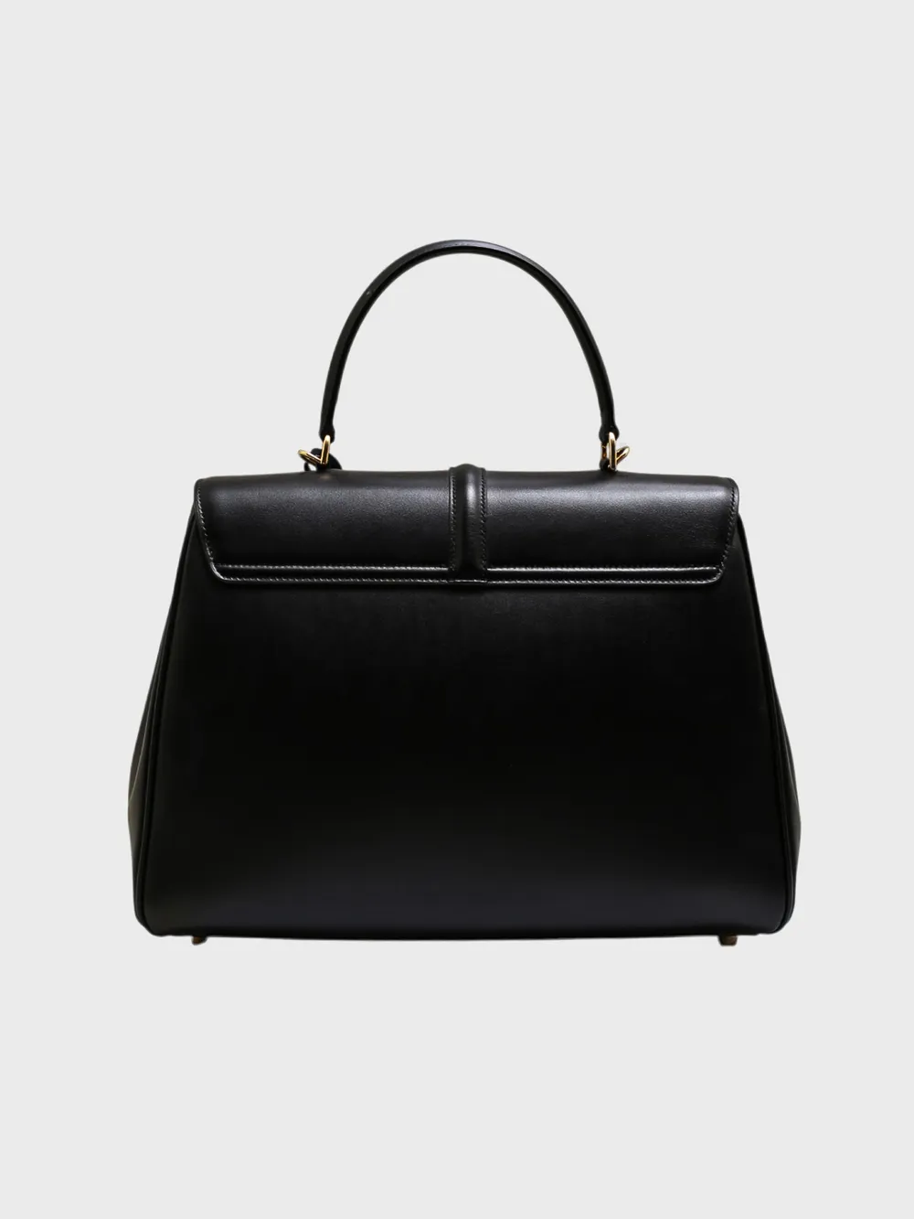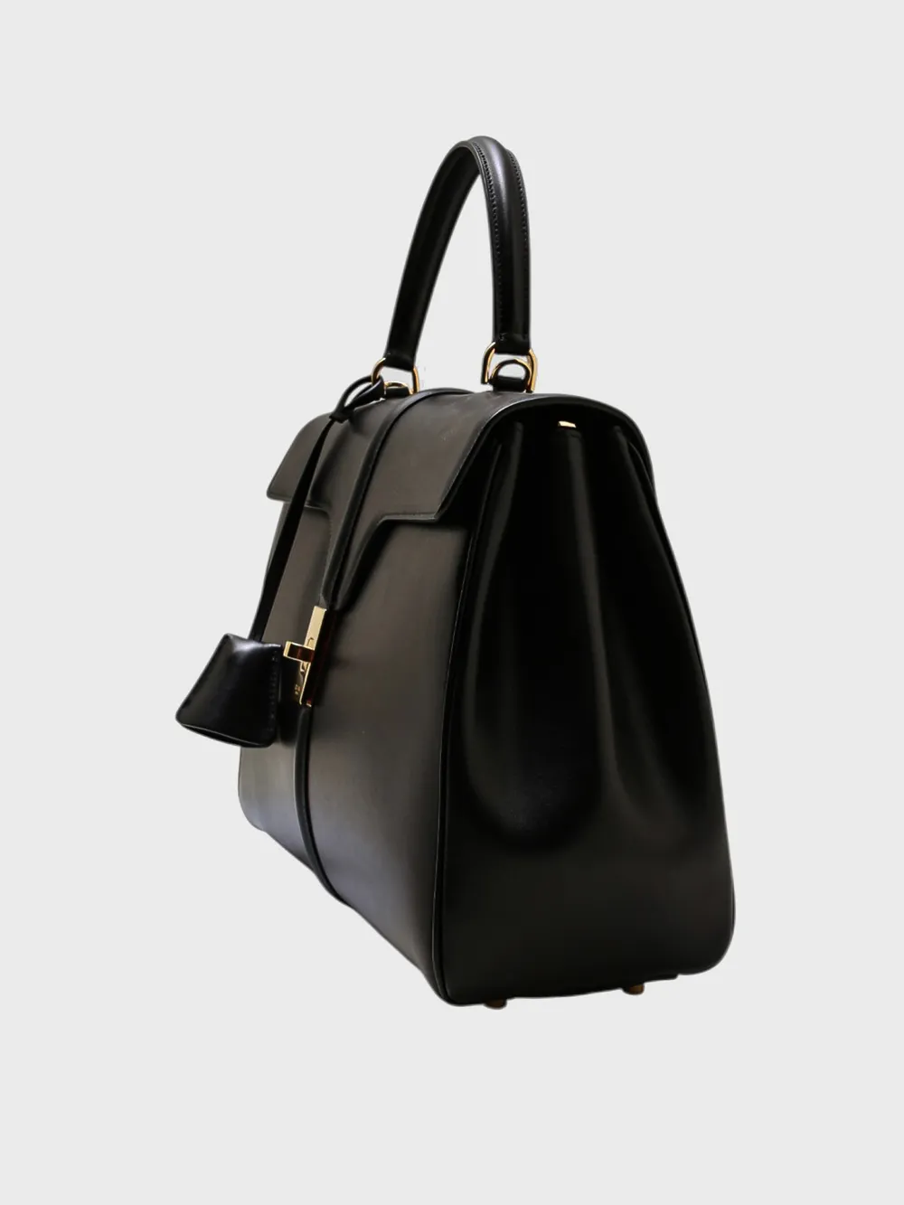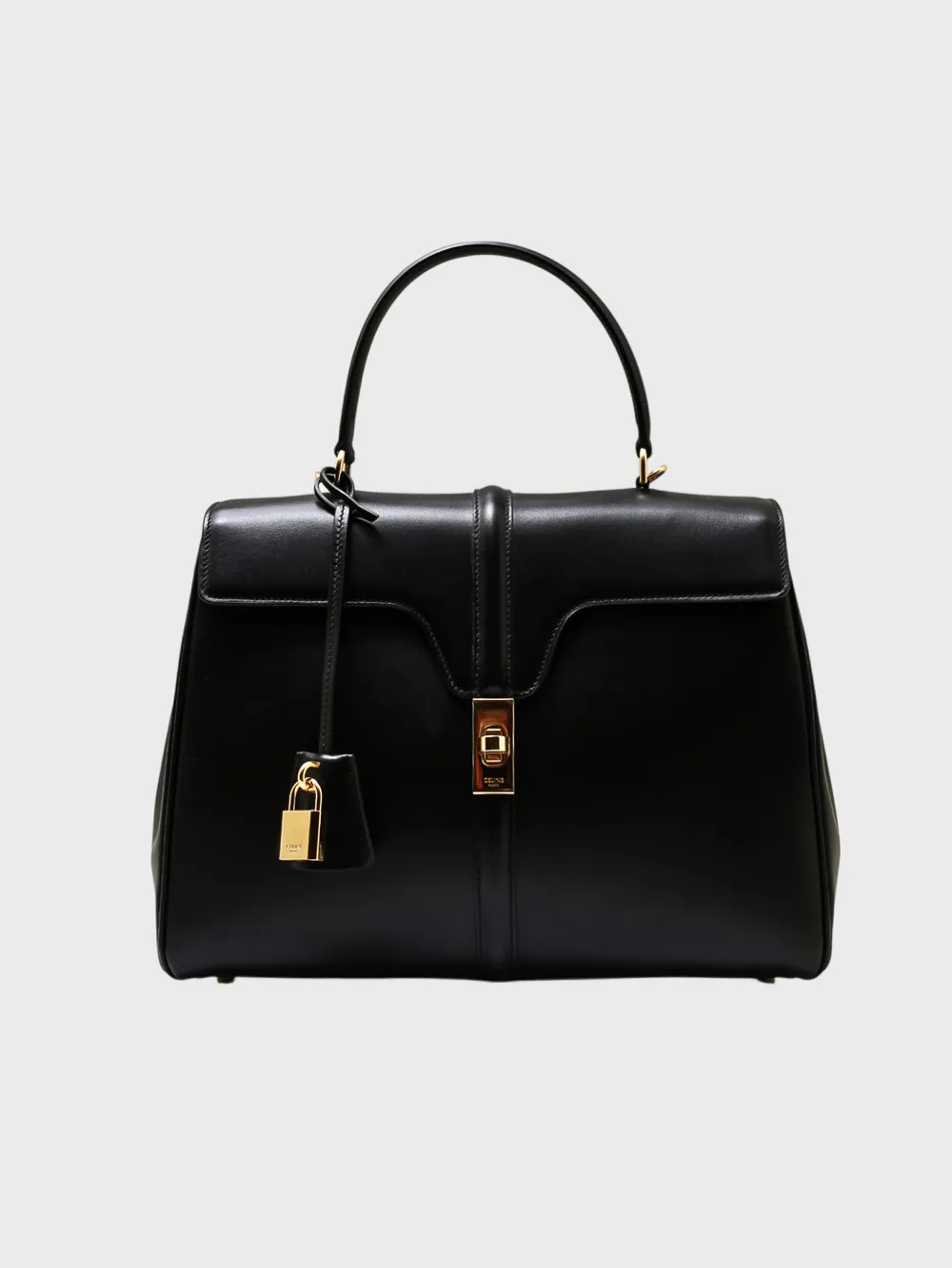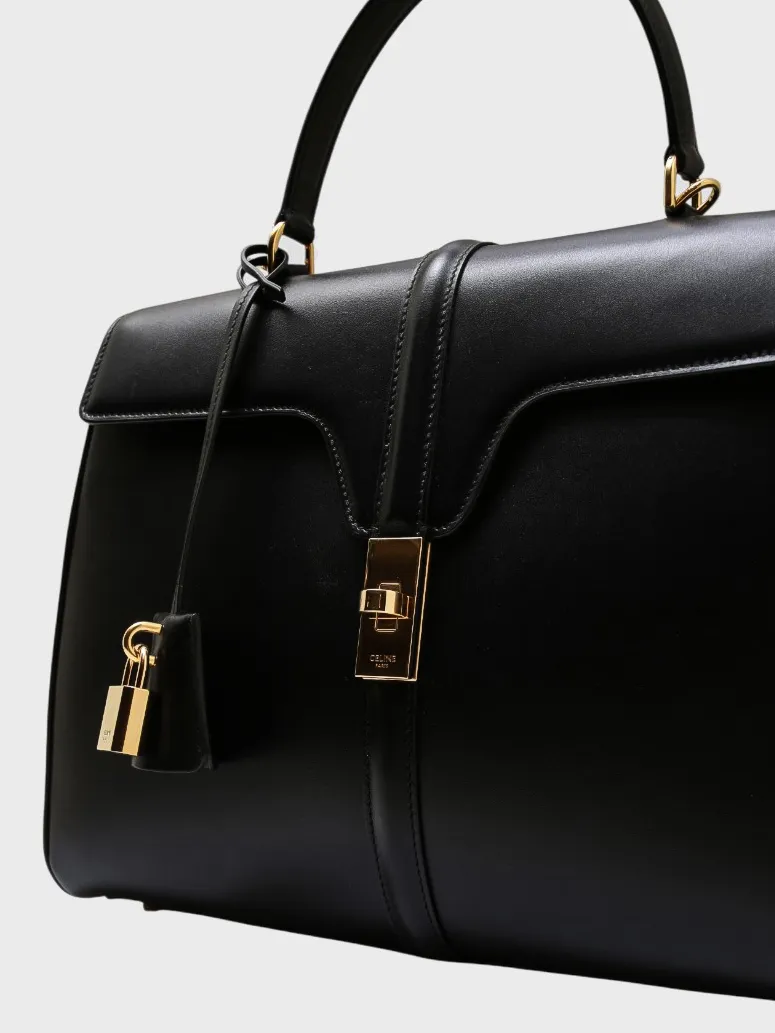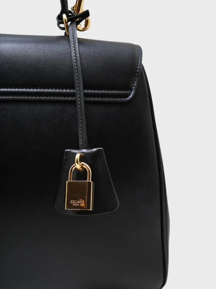 Сумка Celine выполнена в черном цвете из качественной натуральной кожи с гладкой текстурой. Модель представляет собой классический портфельный стиль с двумя ручками для удобной переноски. Особенностью сумки является металлический замок-запорник, который закрывает переднюю часть и придает ей современный и элегантный вид. Замок украшен золотым декором, добавляющим элемент роскоши. Спереди сумки расположен небольшой кожаный табличный элемент с логотипом бренда "CELINE", что подчеркивает ее премиальность. Идеально подходит для деловых встреч или повседневной носки, сочетая в себе функциональность и стиль.