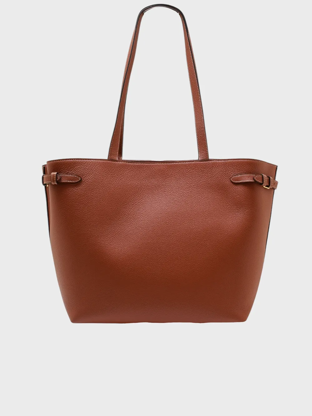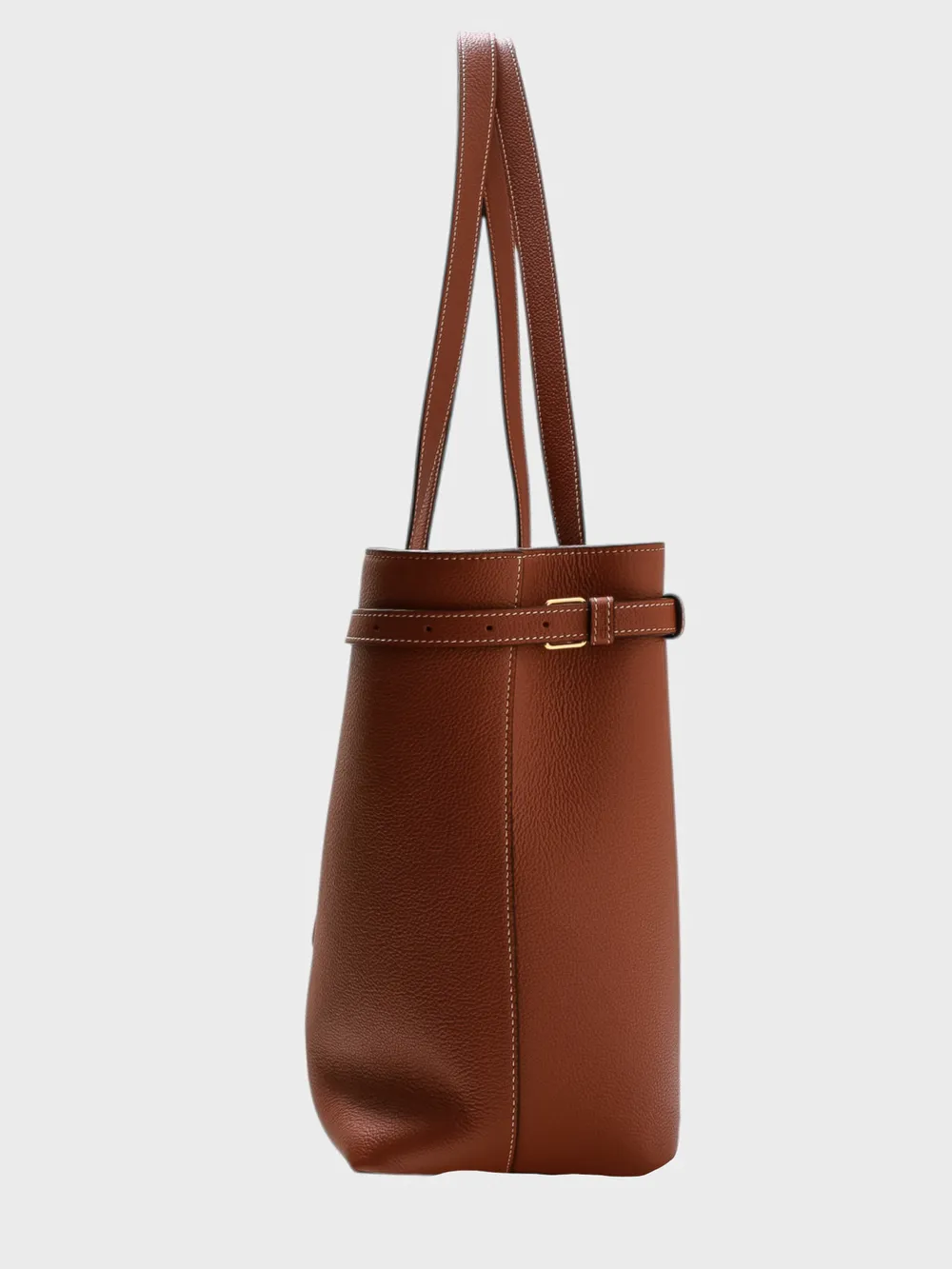 Сумка Celine выполнена из качественной фактурной кожи коричневого оттенка с лаконичным дизайном и крупным вышитым логотипом бренда. Модель дополнена двумя длинными ручками, регулируемым ремешком на молнии для удобного ношения через плечо и вместительным внутренним отделением. Стильная и функциональная — идеальный аксессуар для повседневного образа или деловых встреч.