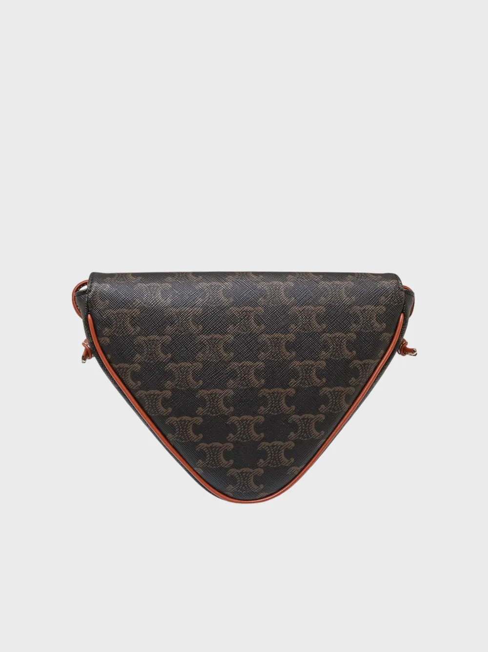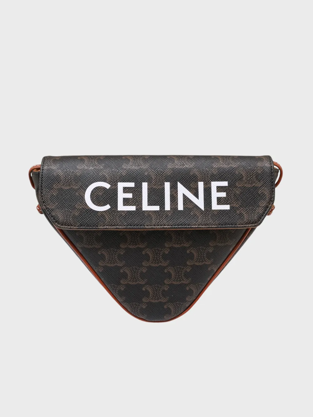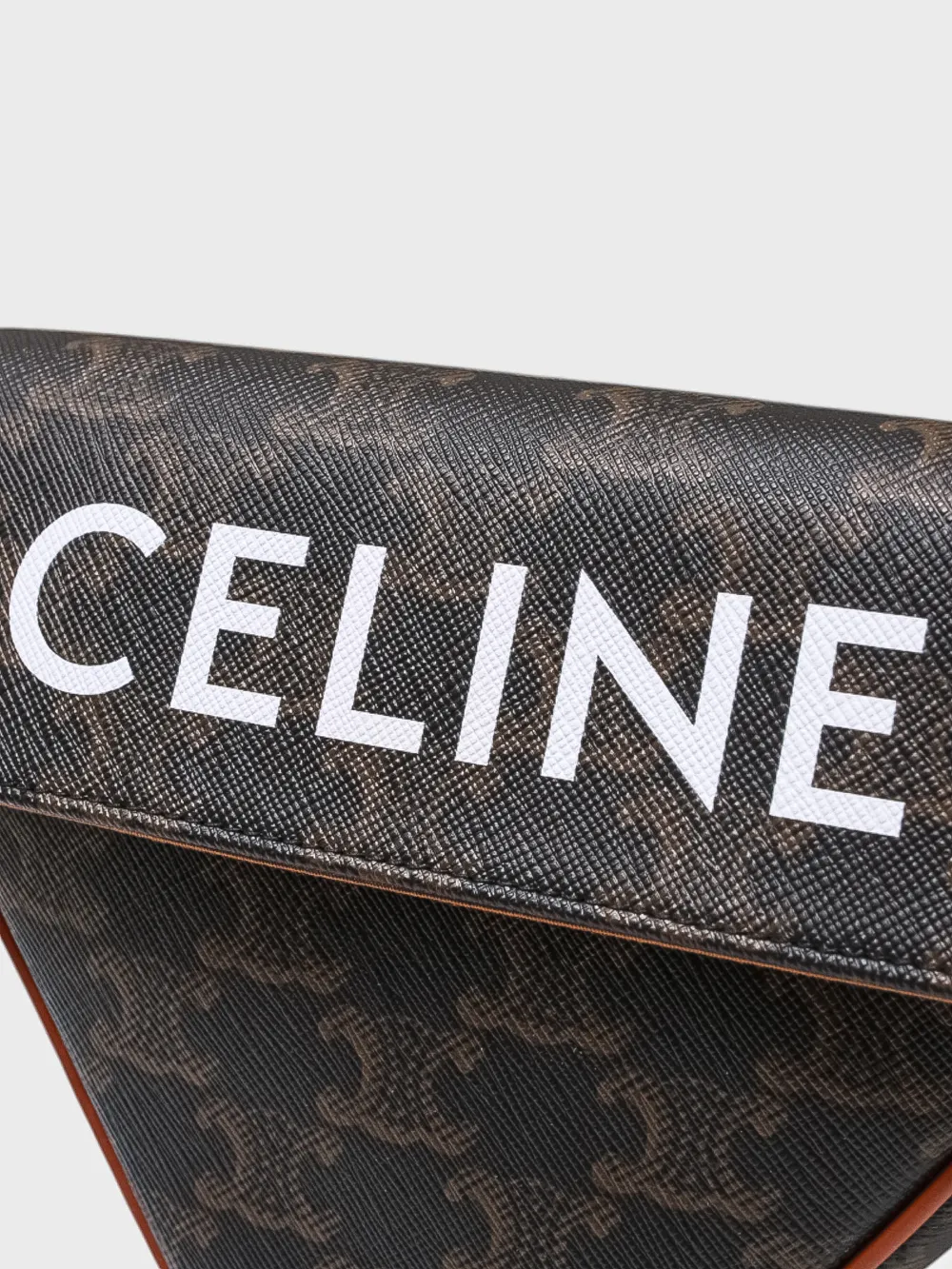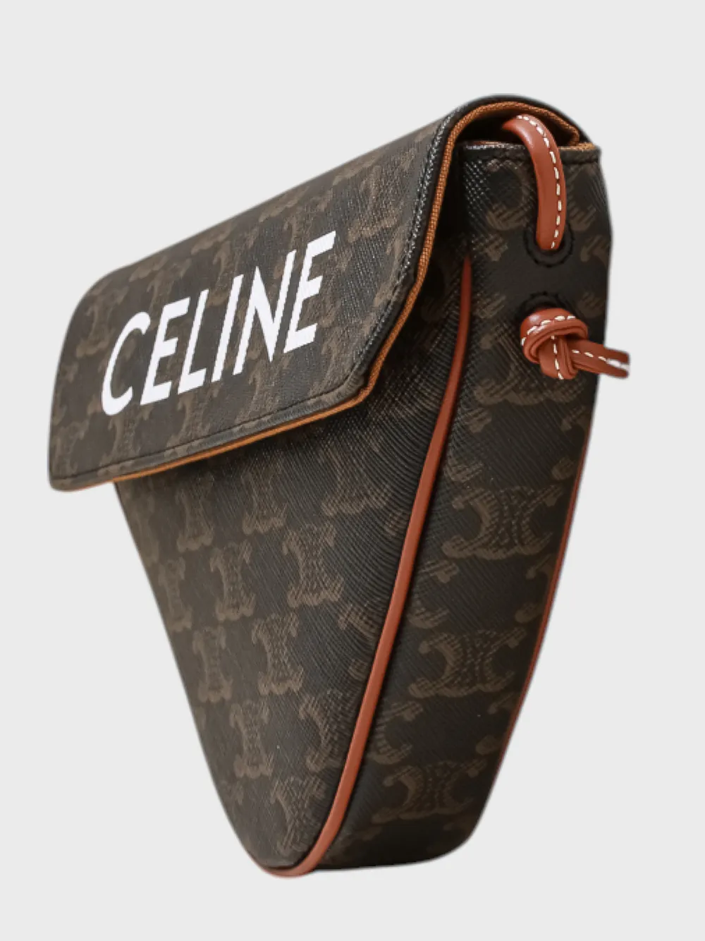 Модная сумка из прочного текстиля с фирменным монограммным принтом в черно-коричневой гамме. Модель выполнена в форме полумесяца и дополнена контрастной коричневой отделкой по краям. Детали: регулируемый плечевой ремень, застежка на кнопке спереди и крупный белый логотип "CELINE" на лицевой стороне. Универсальный аксессуар для повседневного стиля.