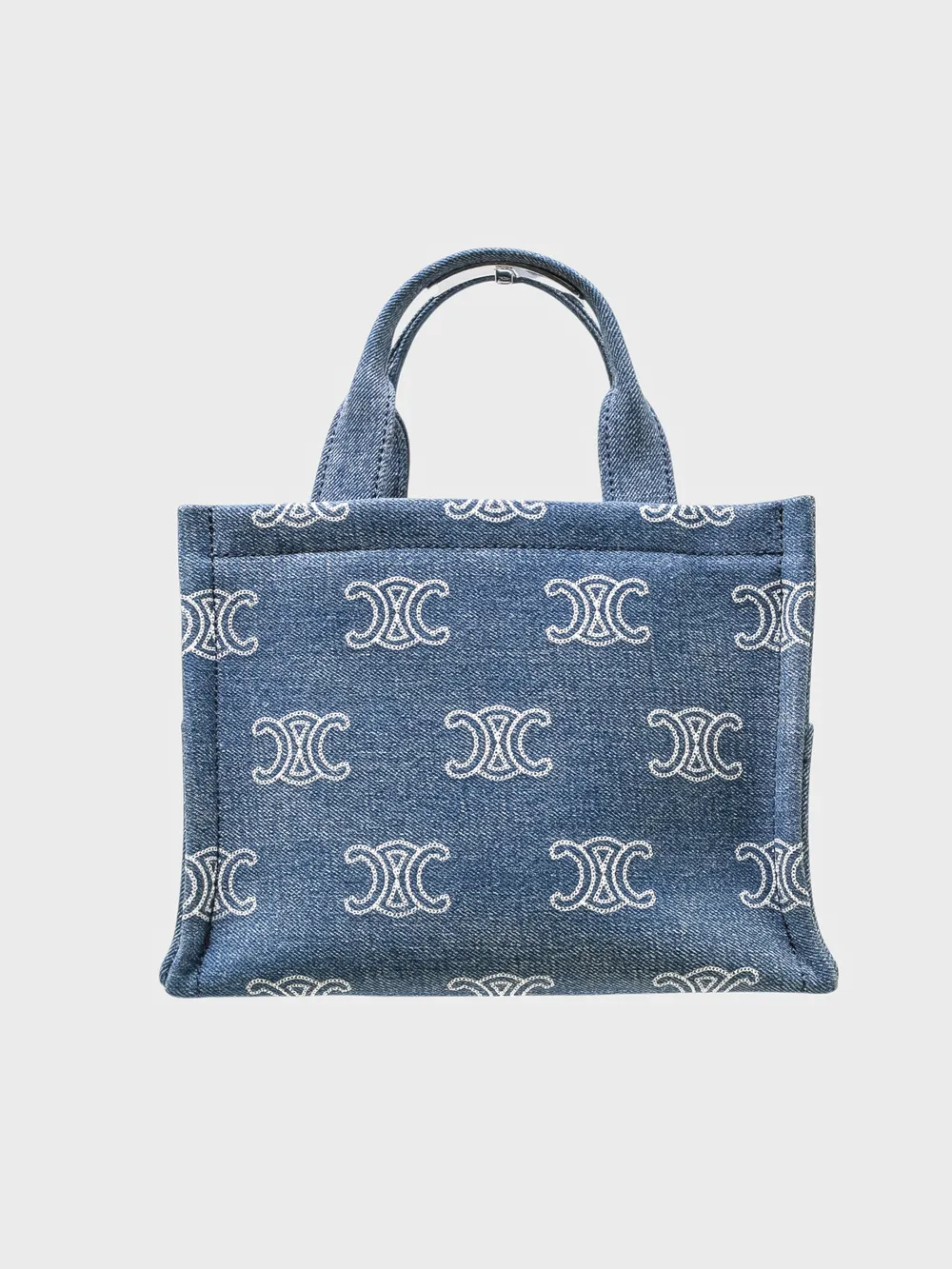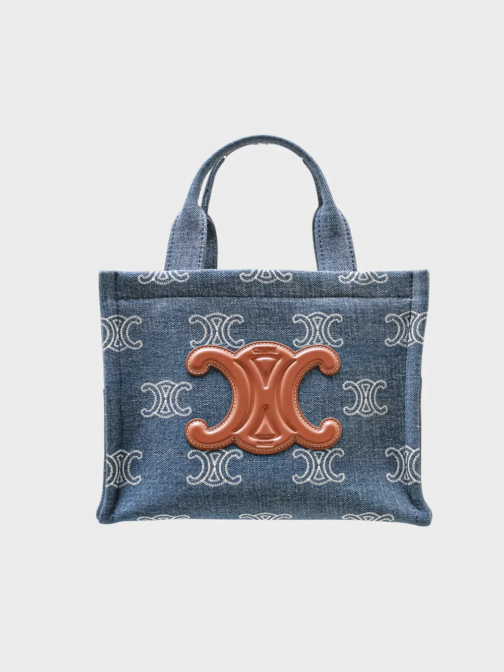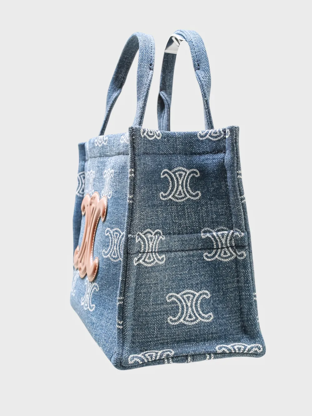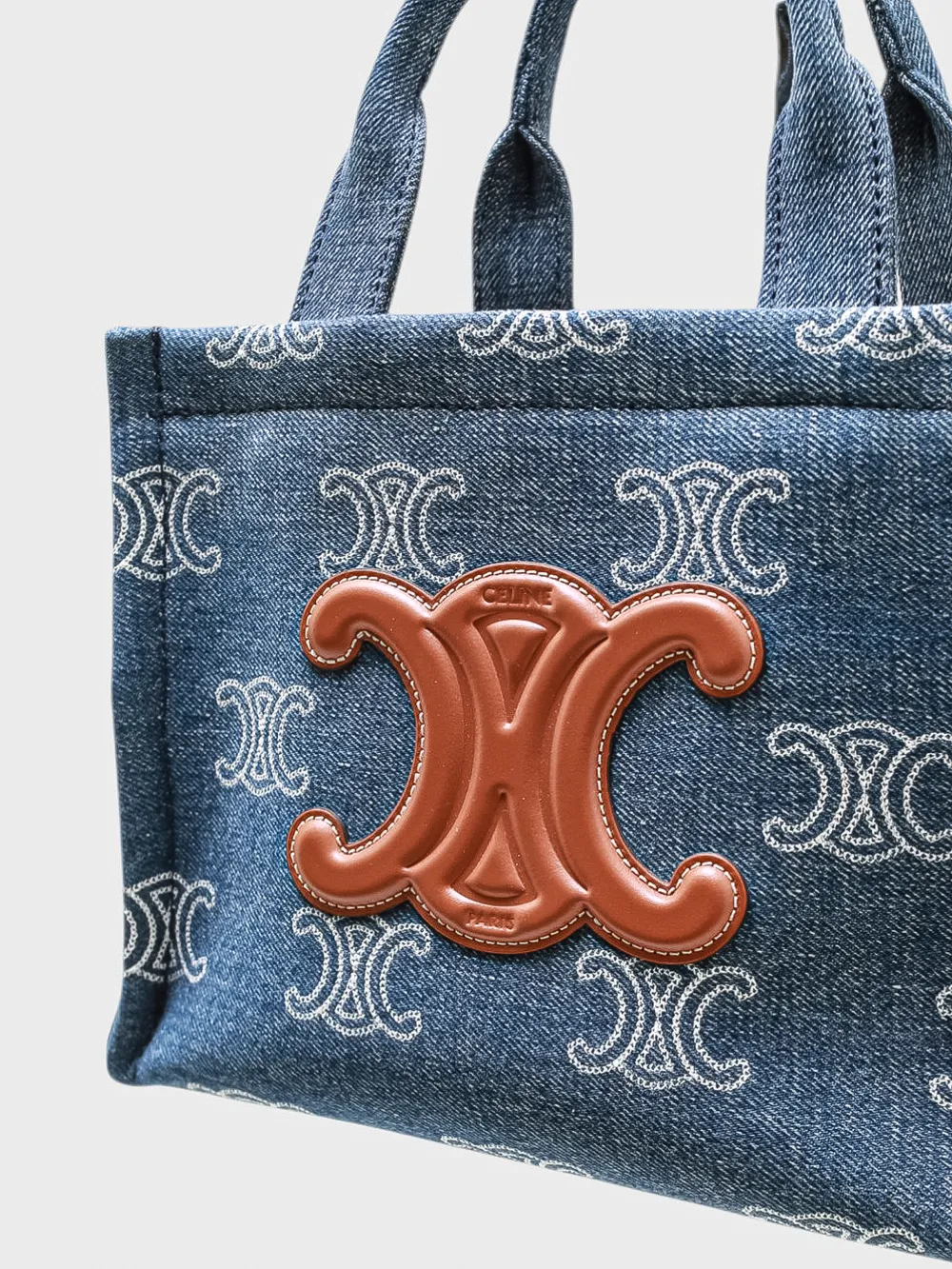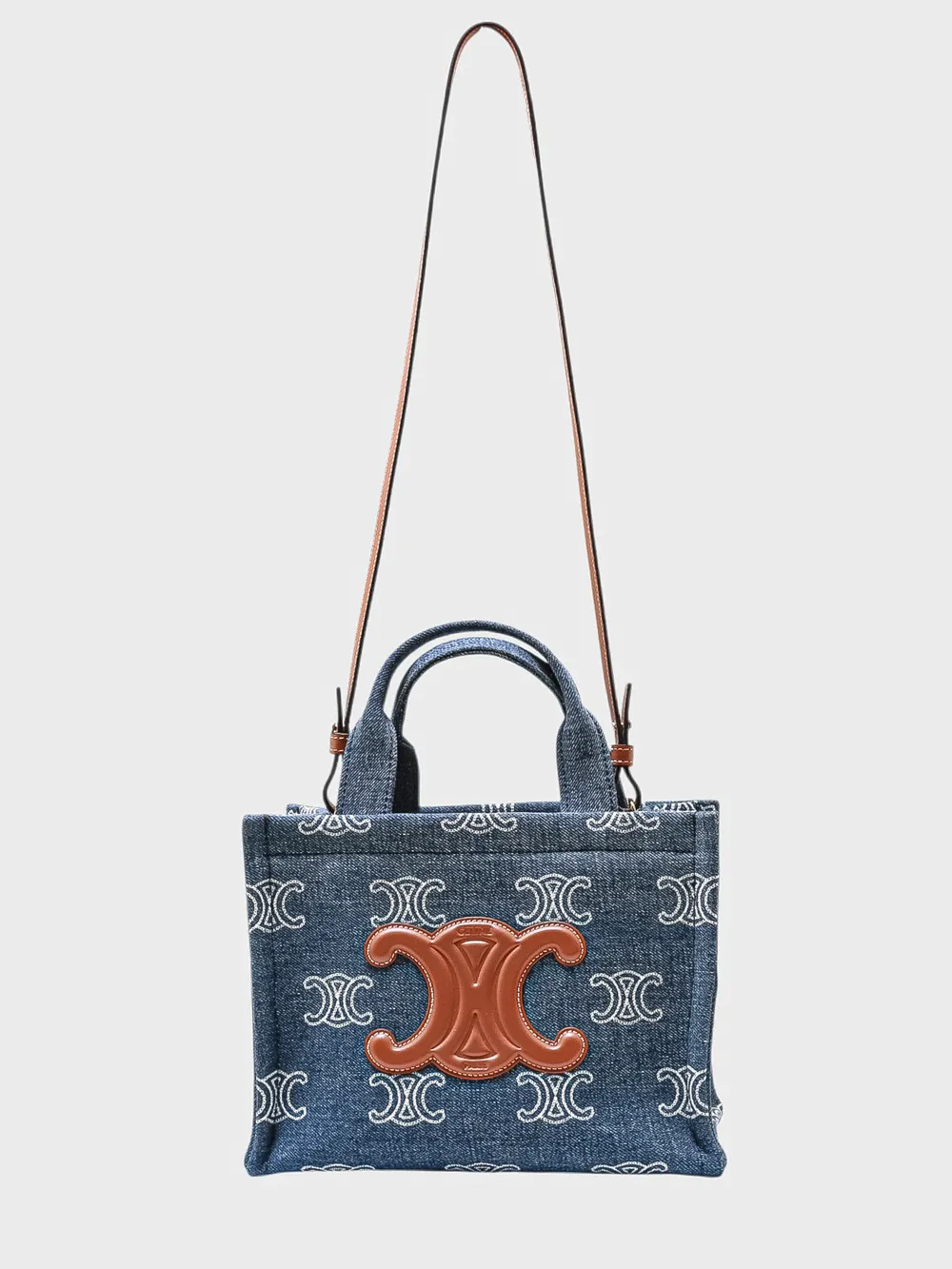 Сумка Celine выполнена из качественного денима синего цвета, декорированного монограммой в виде крупных вышитых логотипов бренда. Центральное место занимает объемный кожаный логотип контрастного коричневого цвета, который создает эффектную композицию. Модель дополнена двумя ручками и регулируемым плечевым ремнем для удобства ношения. Прочный материал и продуманный дизайн делают эту сумку идеальным аксессуаром для повседневного использования или выходных — сочетает практичность и современный стиль.