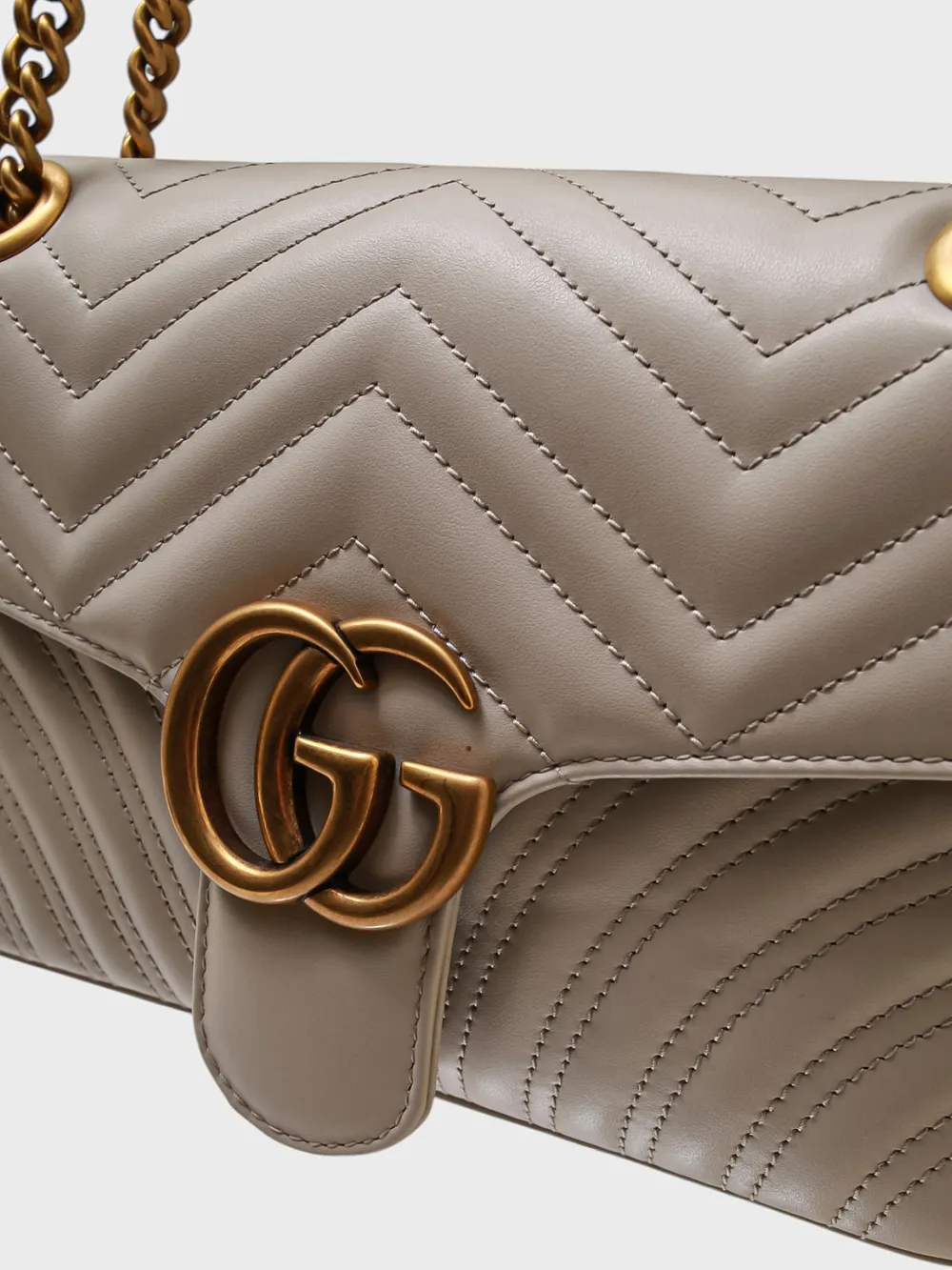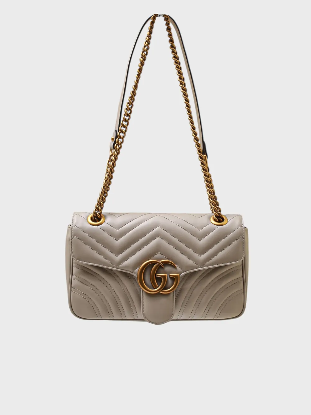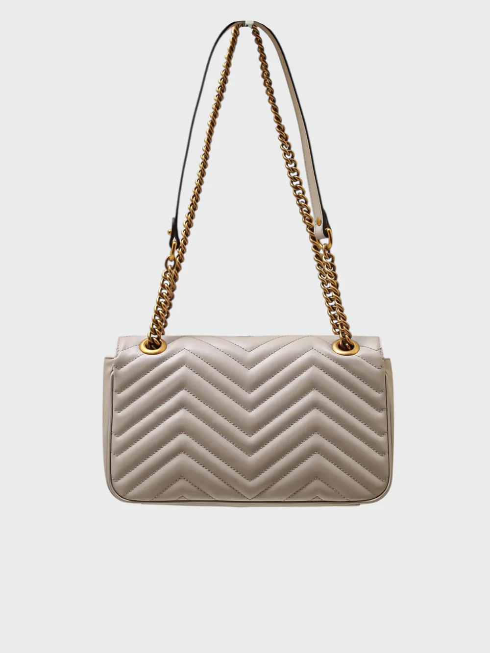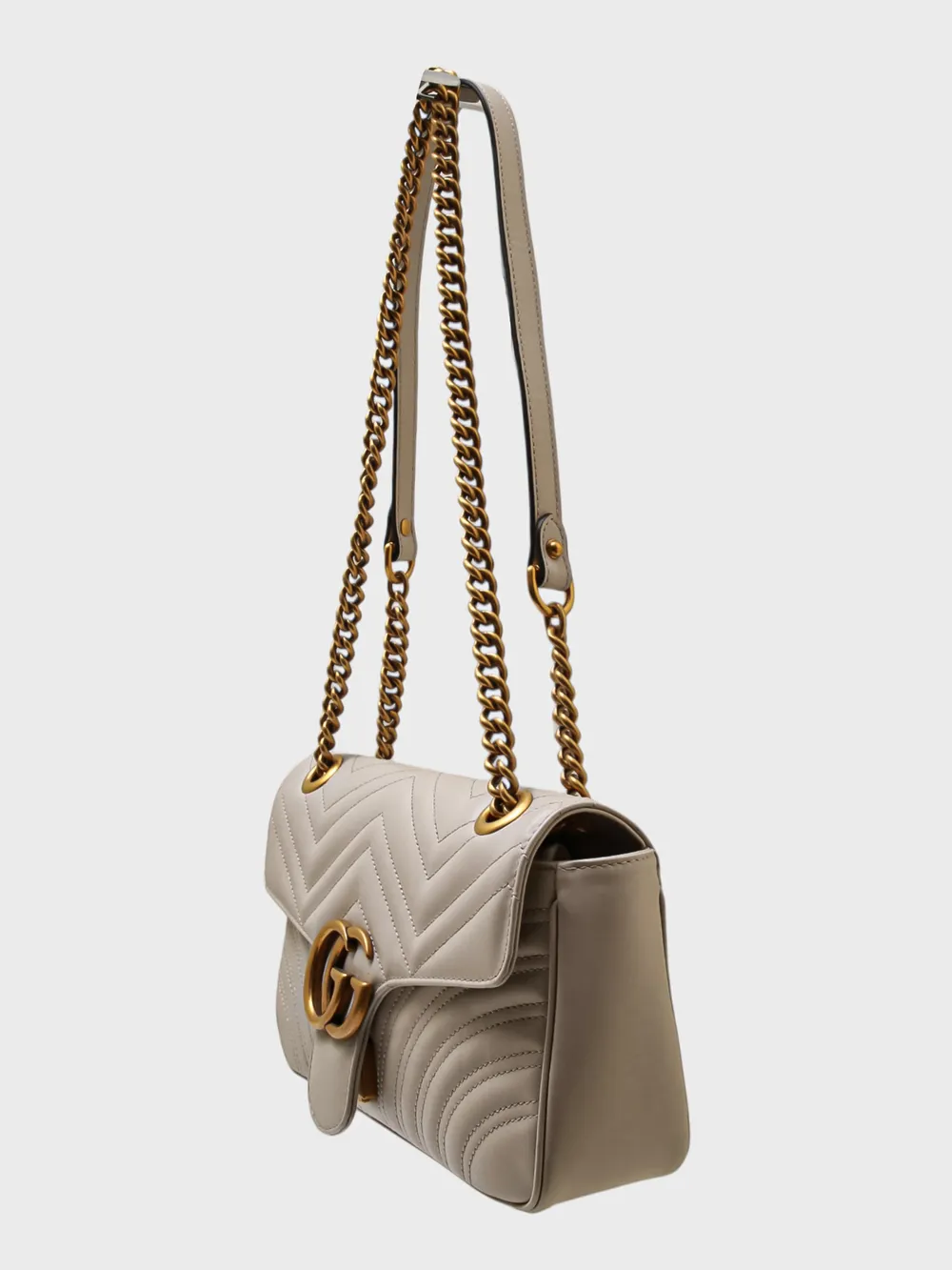 Сумка Gucci выполнена из высококачественной кожи в нежном бежевом оттенке. Модель дополнена характерным для бренда двойным G-логотипом на передней части и декоративной строчкой в виде зигзага, которая придает изделию современный и элегантный вид. Золотистая цепочка с кожаными вставками обеспечивает удобную переноску через плечо или на руке. Идеальный выбор для повседневного стиля и деловых встреч.