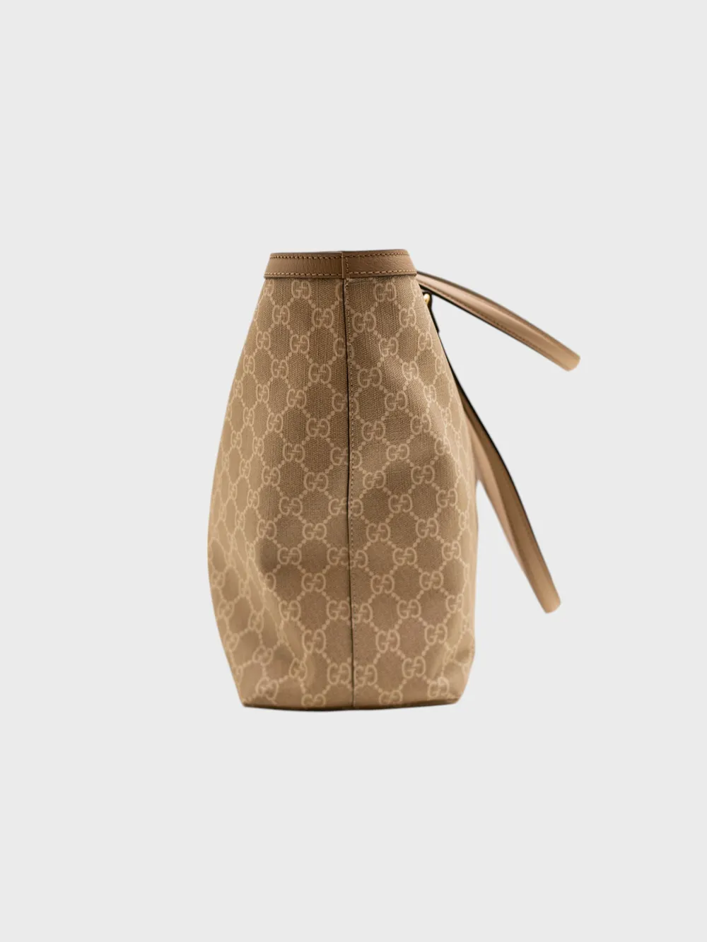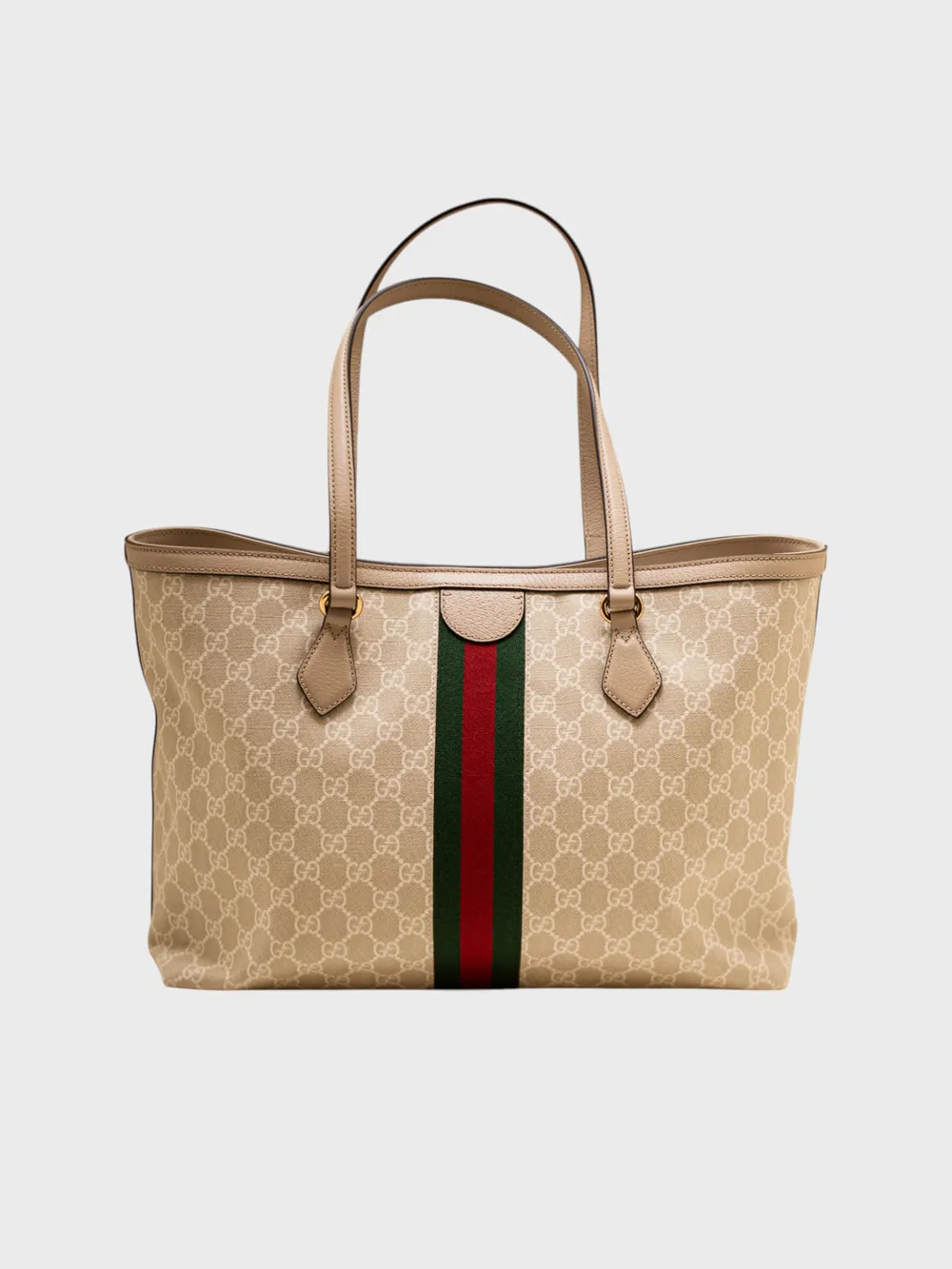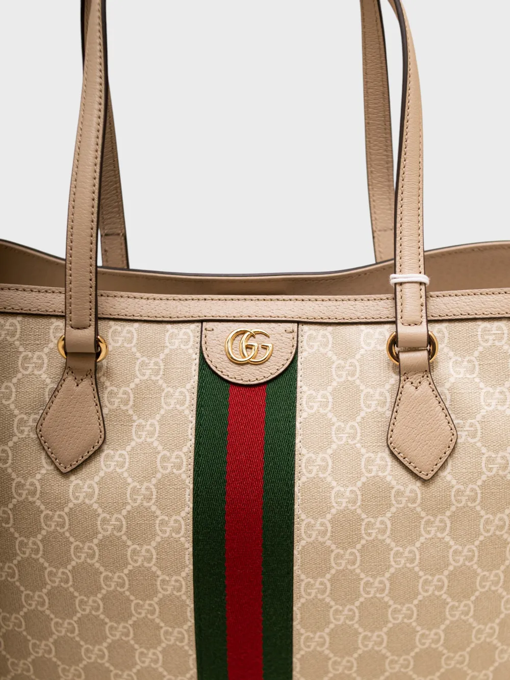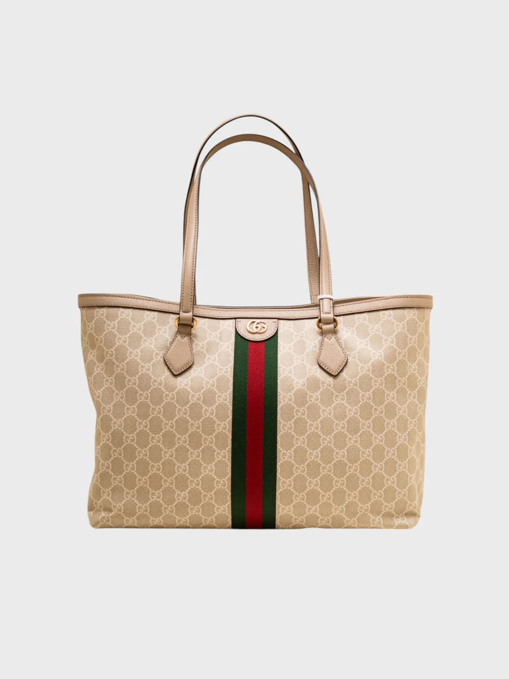 Сумка Gucci выполнена из ткани с фирменным принтом GG Supreme в светло-бежевом цвете, дополнена кожаными элементами и красно-зеленой полосой. Модель оснащена короткими ручками, двойным G-логотипом и золотистыми деталями, сочетая классический стиль бренда с современным дизайном.