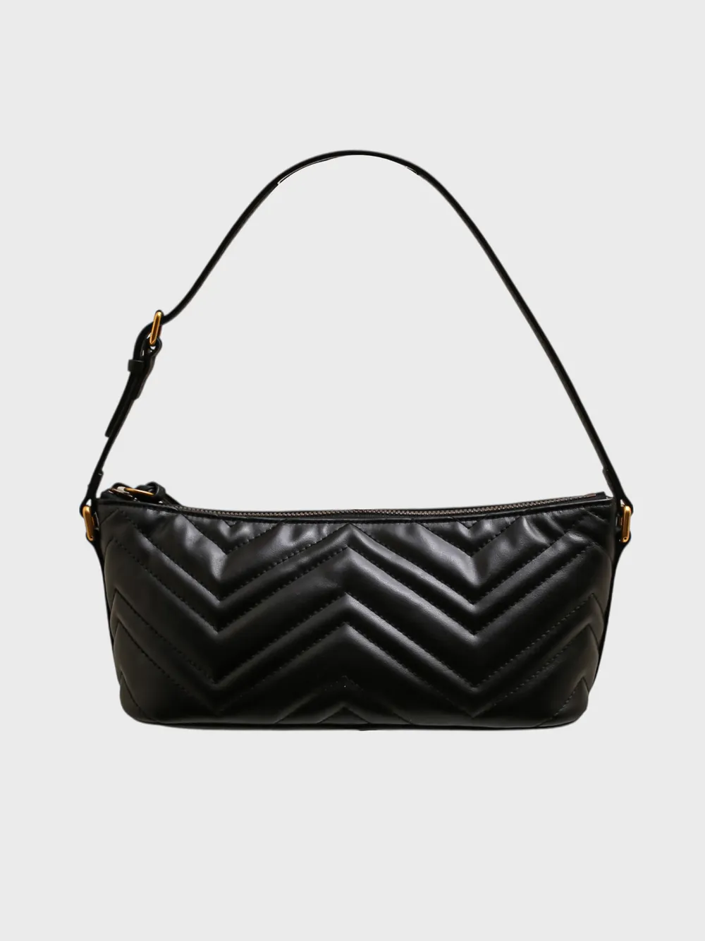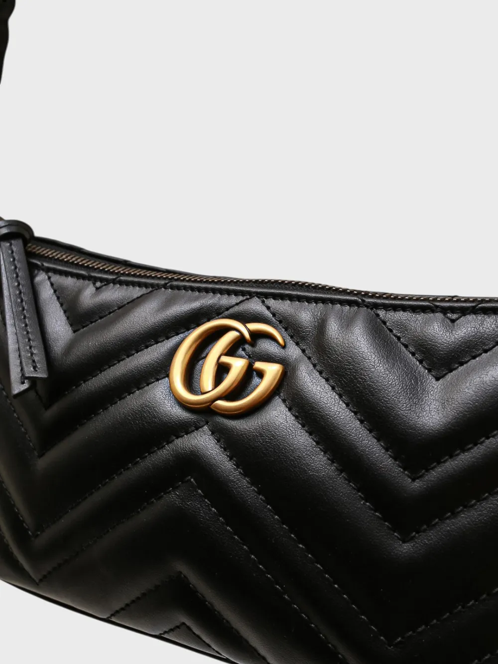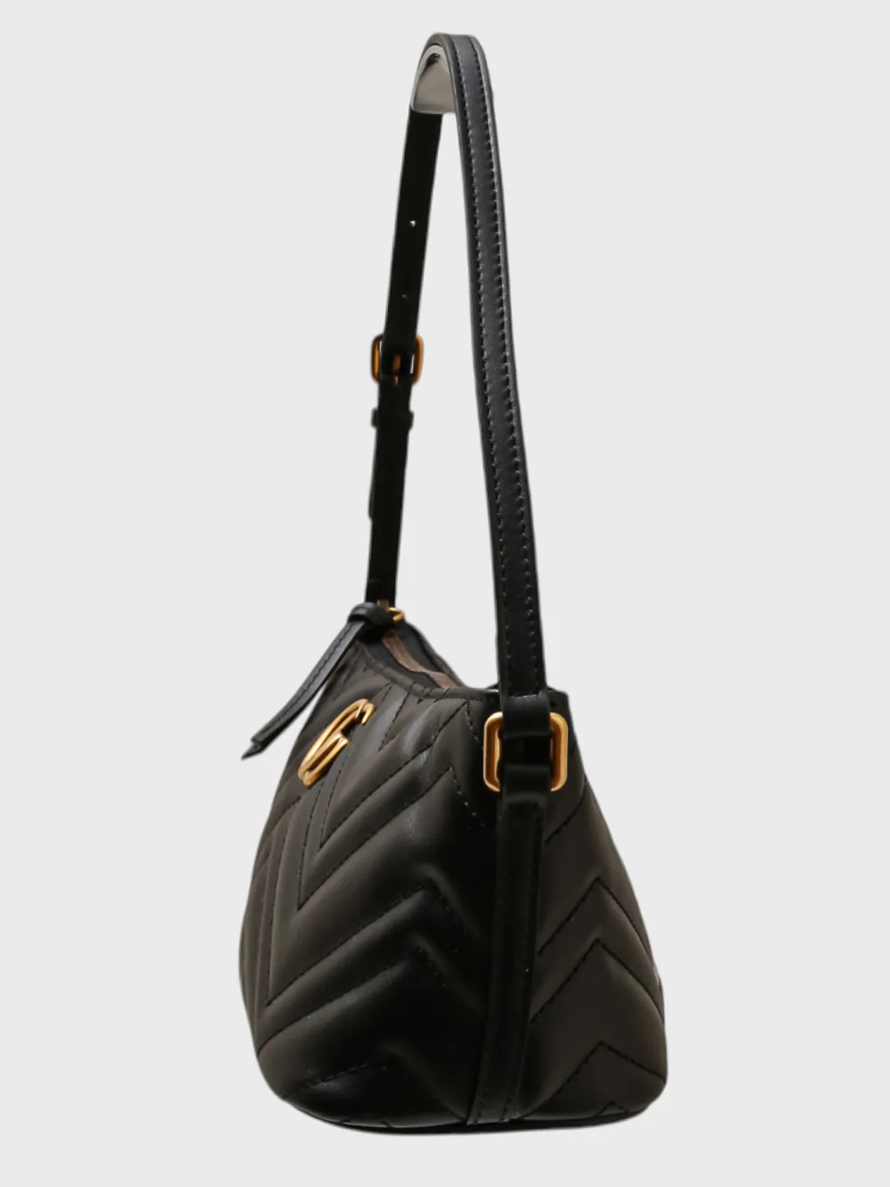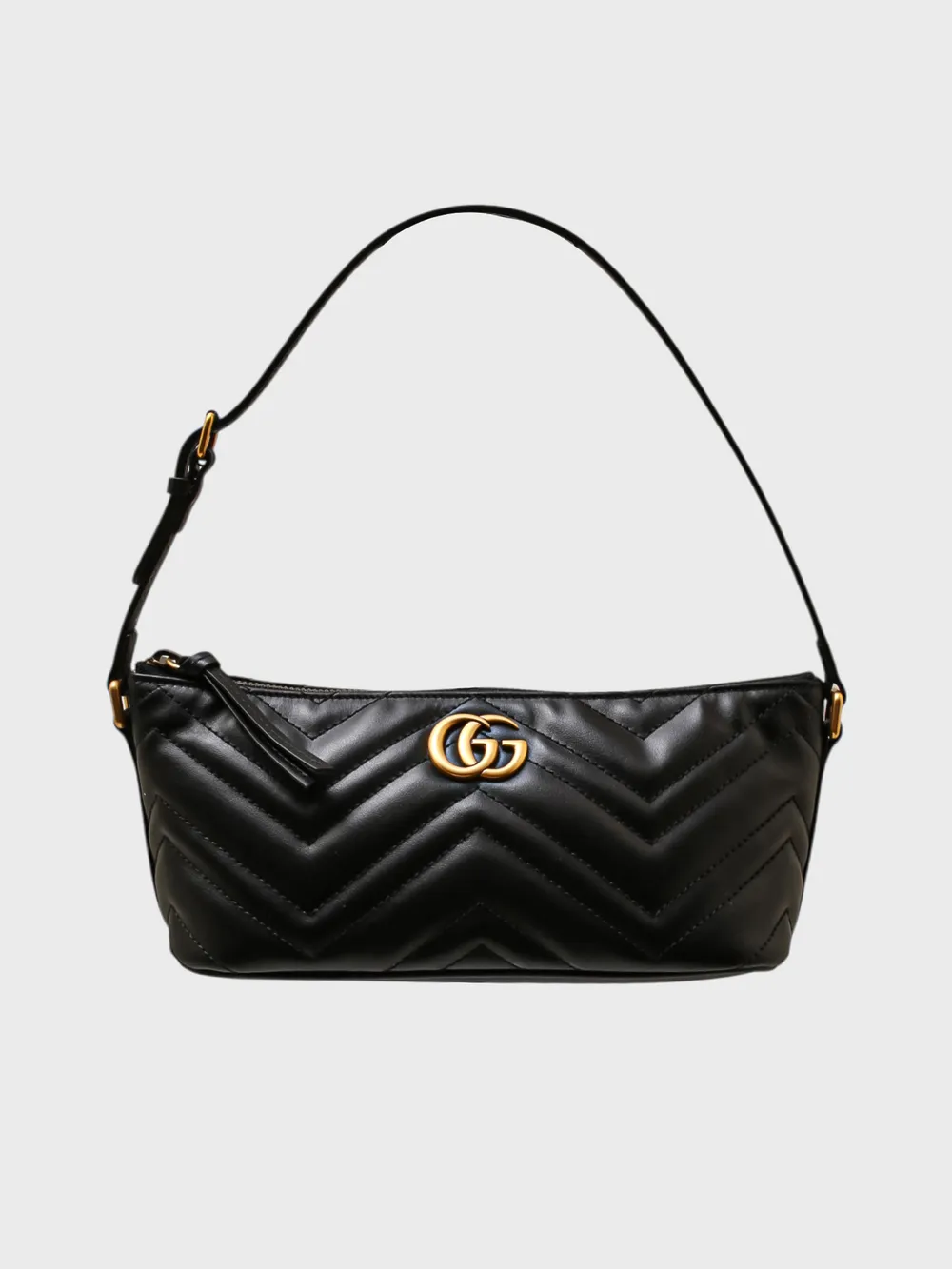 Сумка Gucci выполнена из высококачественной черной кожи с фирменным узором в виде диагональных швов (chevron stitching). Модель дополнена классическим золотым логотипом "G" на передней части и удобной ручкой для переноски. Комбинация текстуры кожи и металлической фурнитуры создает роскошный премиальный вид, идеально подходящий для повседневного использования или деловых встреч.