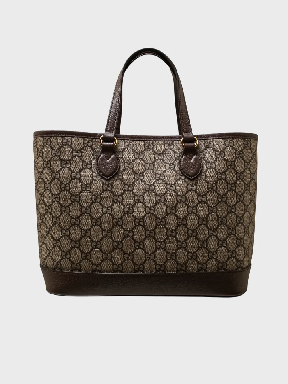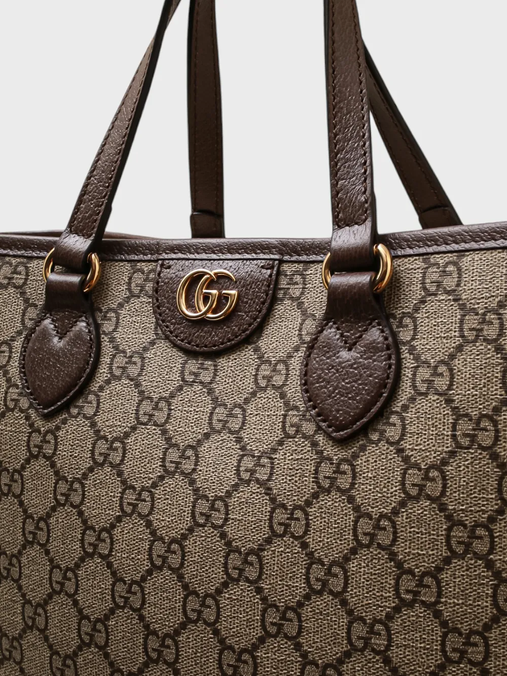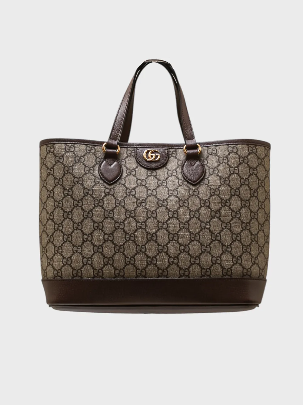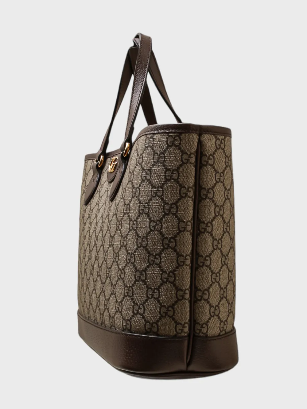 Сумка Gucci выполнена из ткани с фирменным принтом GG Supreme в коричнево-бежевых тонах и дополнена кожаными элементами. Модель имеет прямоугольную форму, короткие ручки и металлическую застежку с логотипом Double G. Универсальный аксессуар сочетает узнаваемый стиль бренда и повседневную функциональность.
