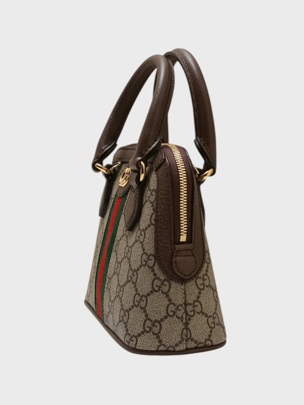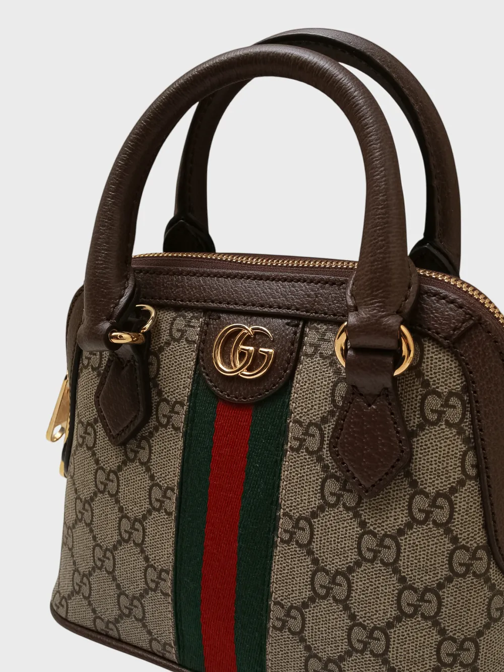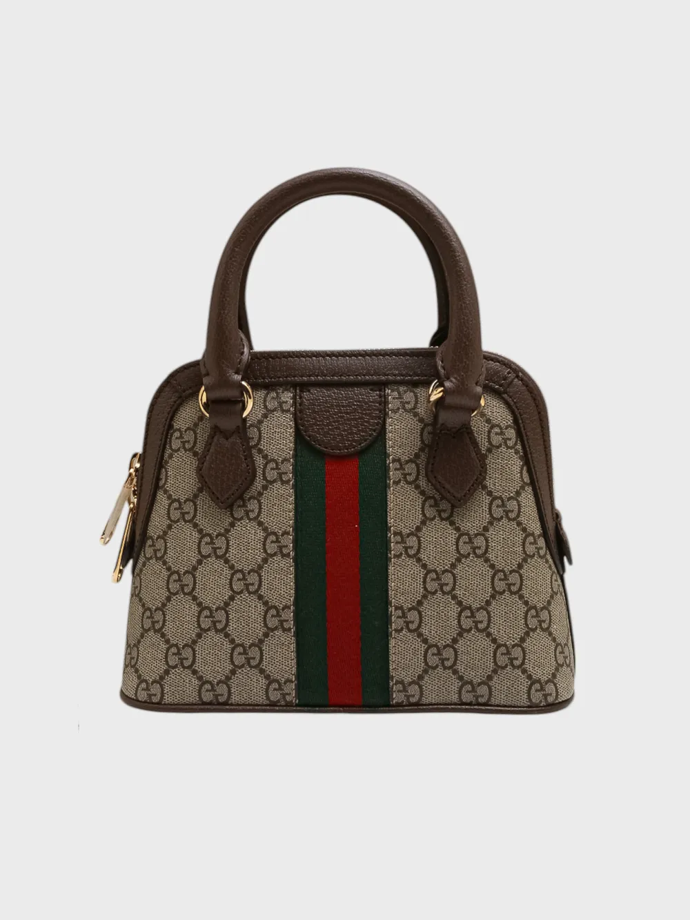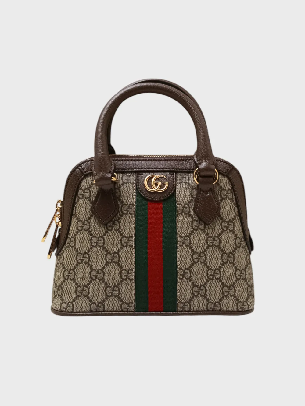 Сумка Gucci выполнена из высококачественного GG Supreme канваса с фирменным принтом и контрастными деталями. Модель дополнена классическим золотым логотипом "G" на кожаной подкладке, красно-зеленой полосой по бокам и удобной ручкой для переноски. Комбинация текстуры ткани и натуральной кожи создает роскошный премиальный вид, идеально подходящий для повседневного использования или деловых встреч.