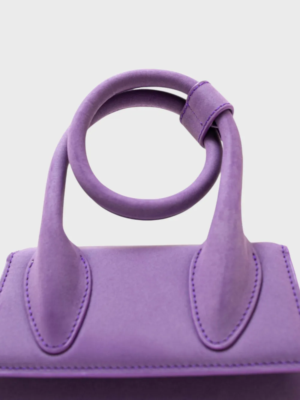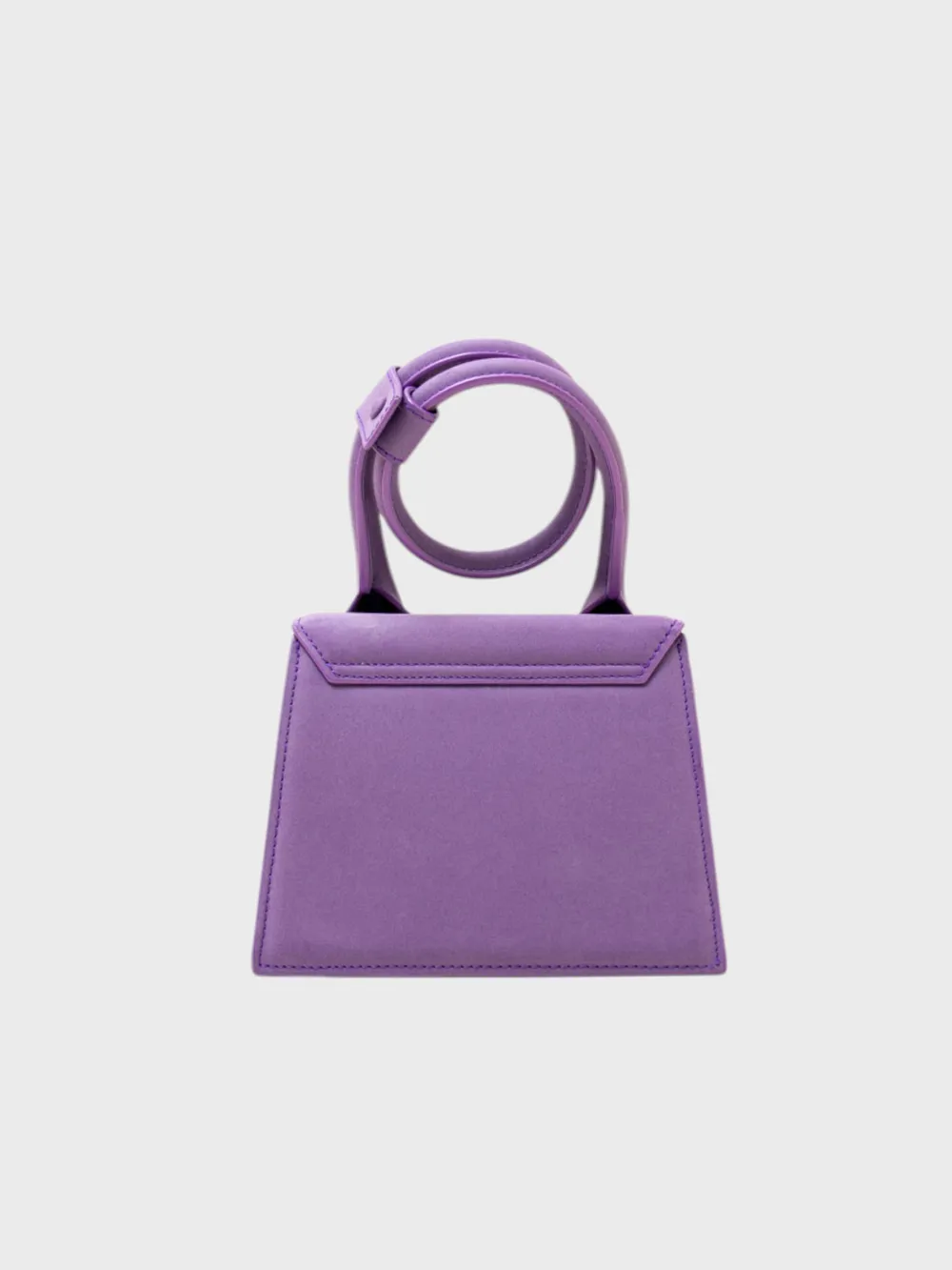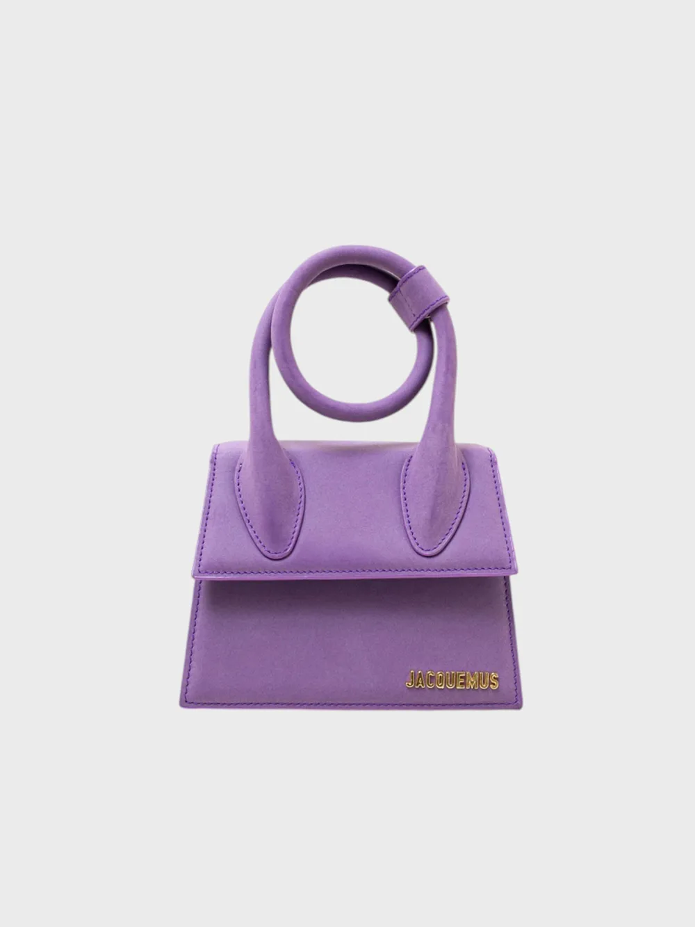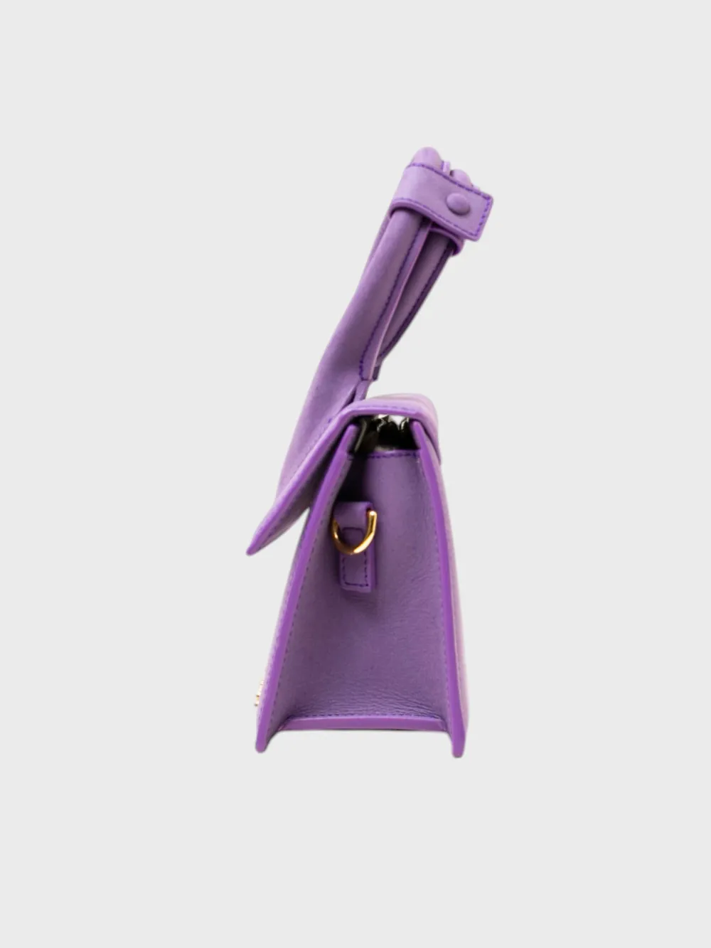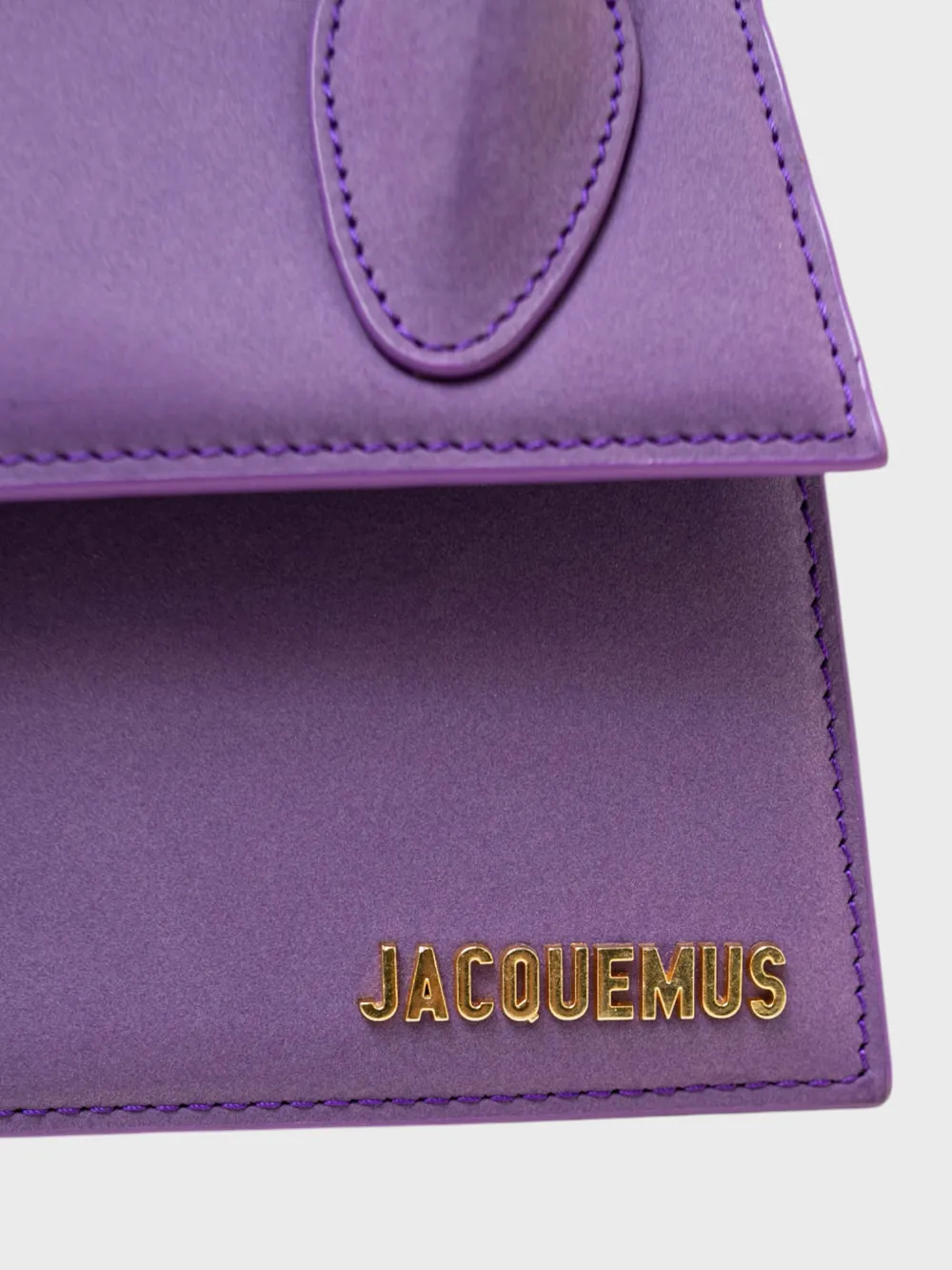 Сумка Jacquemus выполнена из фиолетовой кожи с гладкой текстурой. Модель имеет компактную форму и оснащена короткой ручкой для переноски через плечо или на руке. На передней части сумки расположен металлический логотип бренда "JACQUEMUS" в золотом цвете, добавляющий узнаваемости. Застежка-ремешок с металлической фурнитурой обеспечивает безопасность содержимого. Простая форма и качественные материалы делают эту сумку универсальной для различных случаев использования, от повседневных прогулок до вечерних мероприятий. Фиолетовый цвет позволяет сочетать аксессуар с различными стилями одежды.