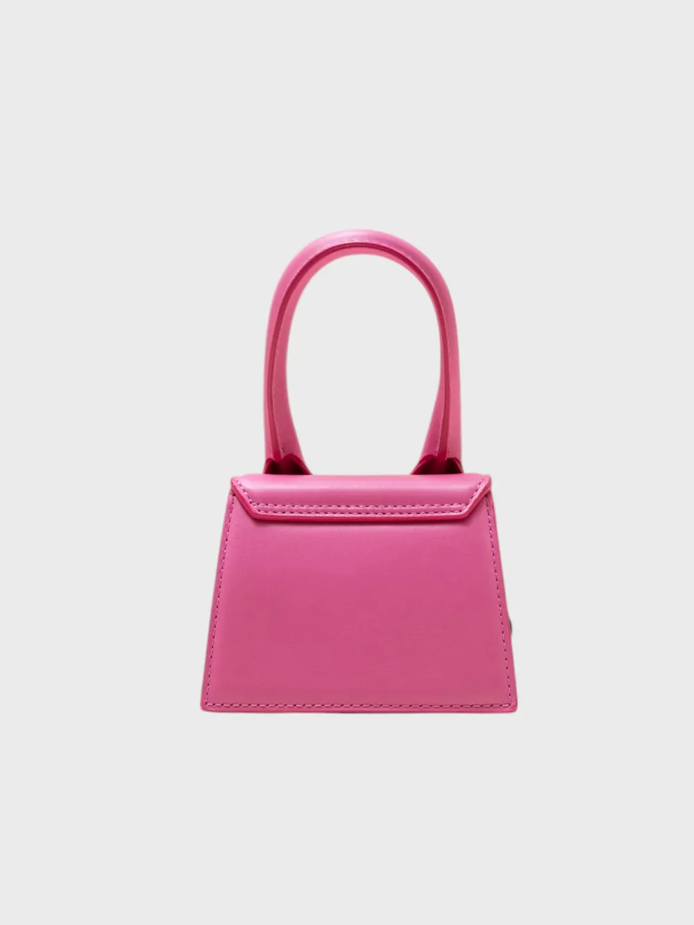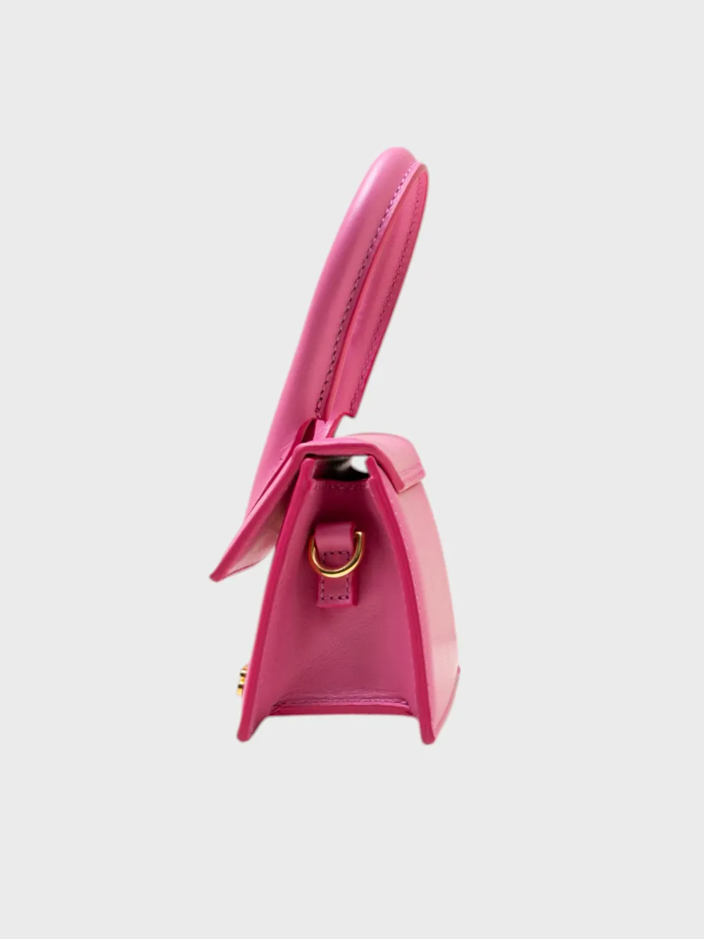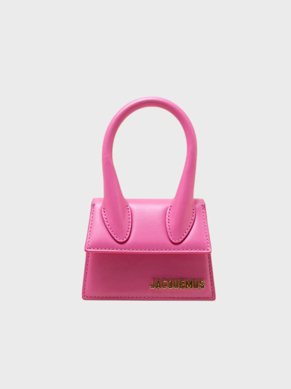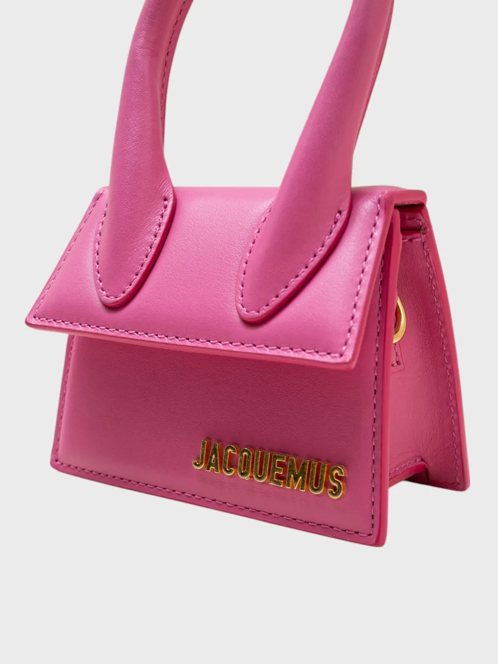 Сумка Jacquemus выполнена из ярко-розовой гладкой кожи с минималистичным дизайном. Модель оснащена короткой ручкой и металлической застежкой, дополненной золотистыми деталями. На передней части сумки расположен золотистый логотип "JACQUEMUS", добавляющий узнаваемости бренда. Простая форма и яркий цвет делают эту сумку стильным аксессуаром для повседневного использования или вечерних мероприятий.