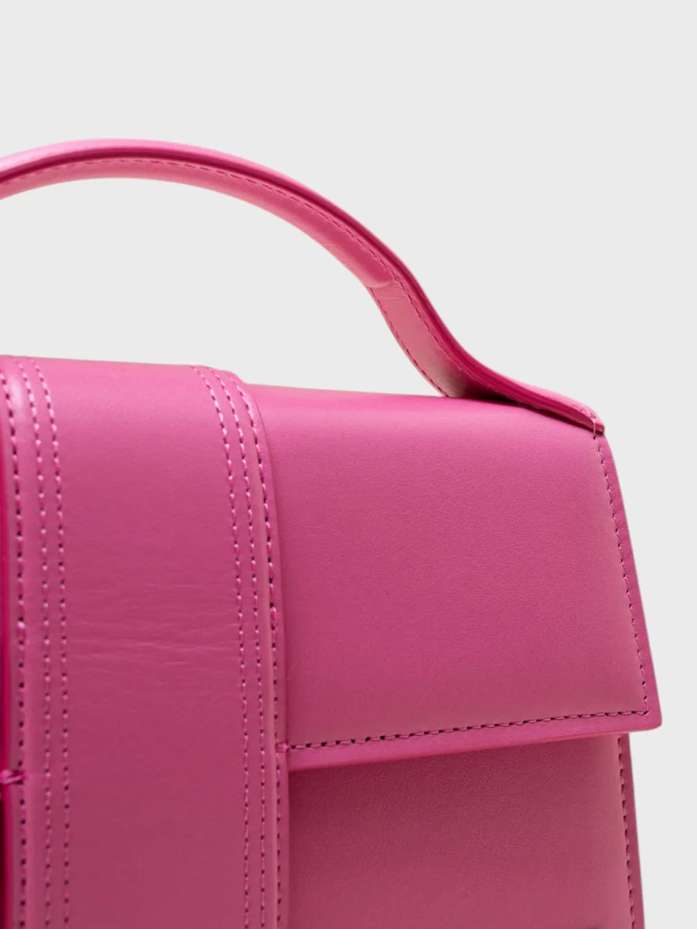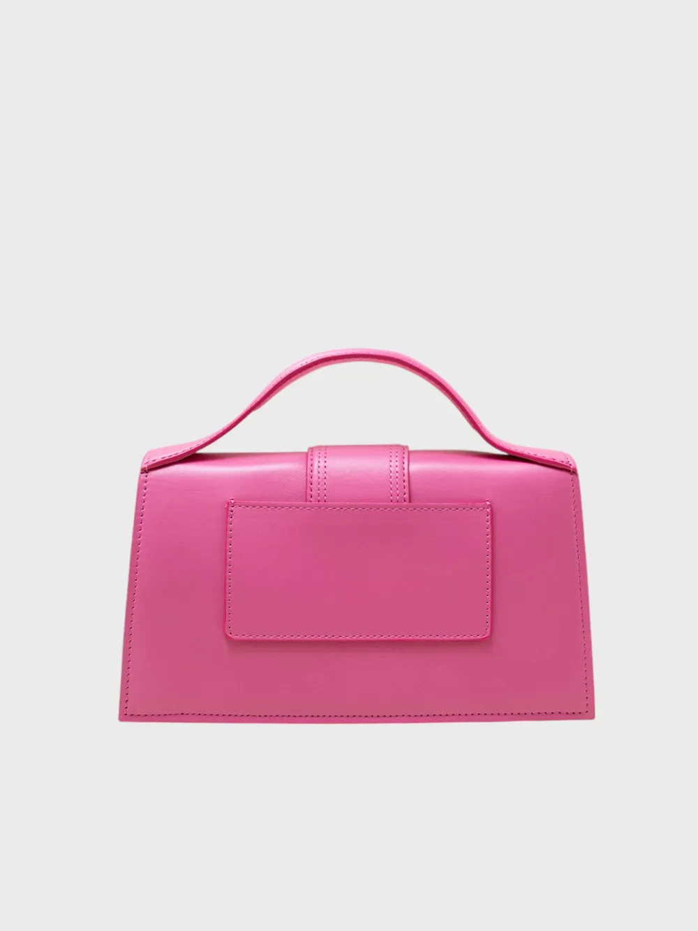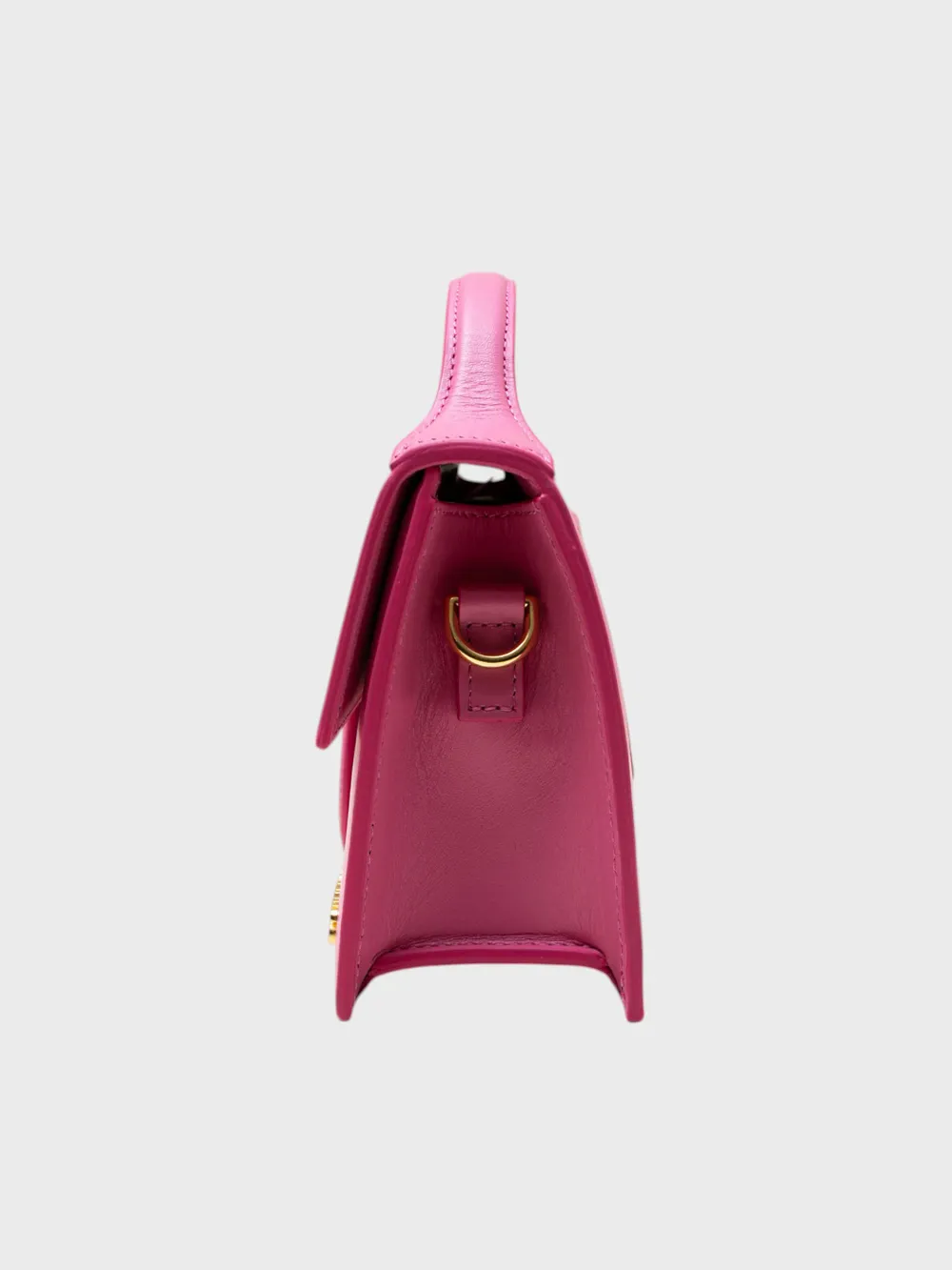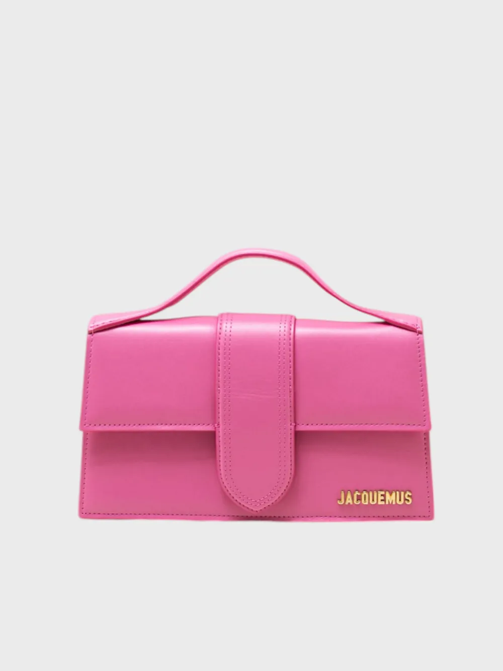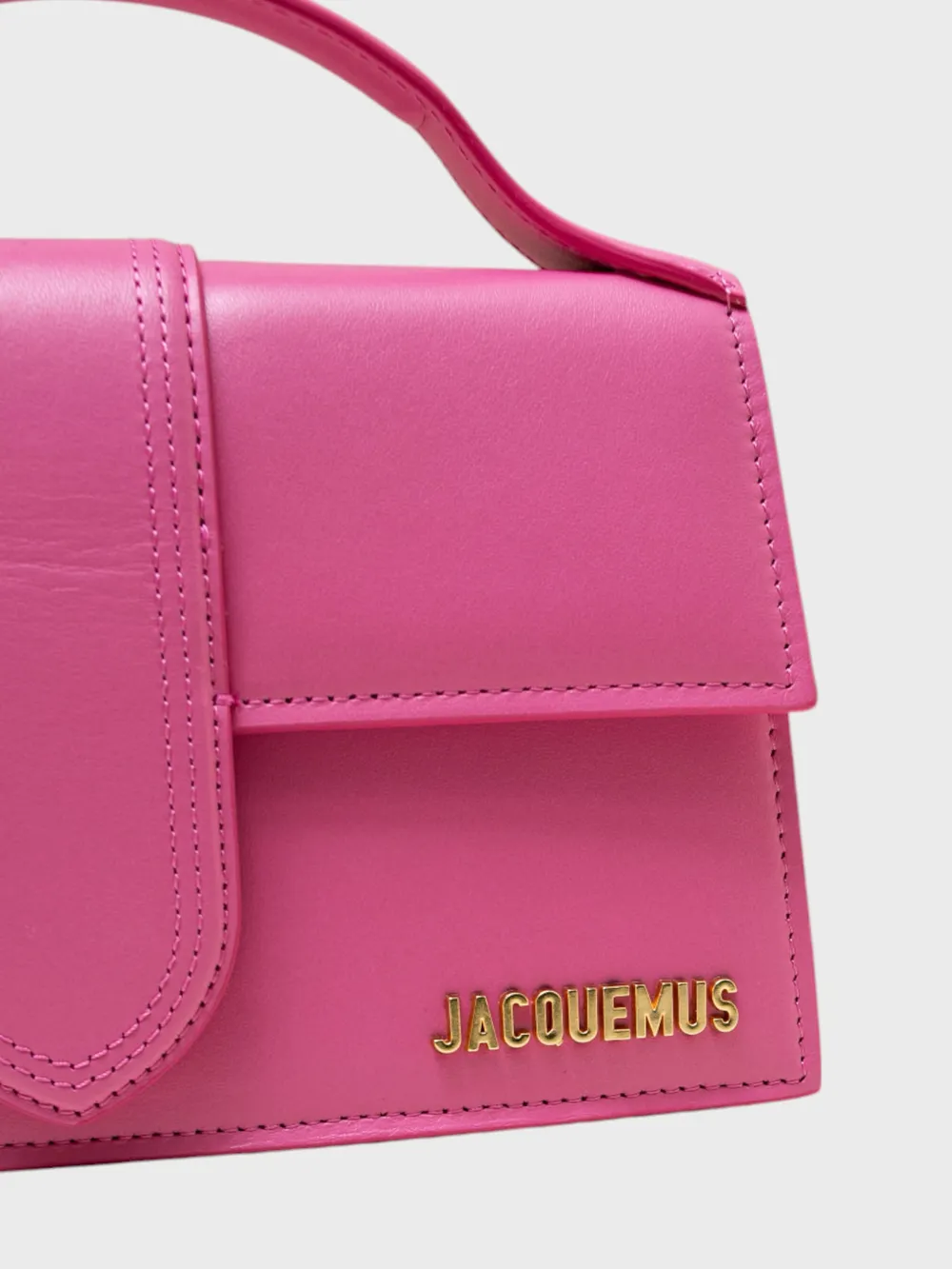 Сумка Jacquemus выполнена из ярко-розовой кожи с гладкой текстурой. Модель имеет компактную форму и оснащена короткой ручкой для переноски через плечо или на руке. На передней части сумки расположен металлический логотип бренда "JACQUEMUS" в золотом цвете, добавляющий узнаваемости. Застежка-ремешок с металлической фурнитурой обеспечивает безопасность содержимого. Простая форма и качественные материалы делают эту сумку универсальной для различных случаев использования, от повседневных прогулок до вечерних мероприятий. Яркий розовый цвет позволяет создать акцентный образ.