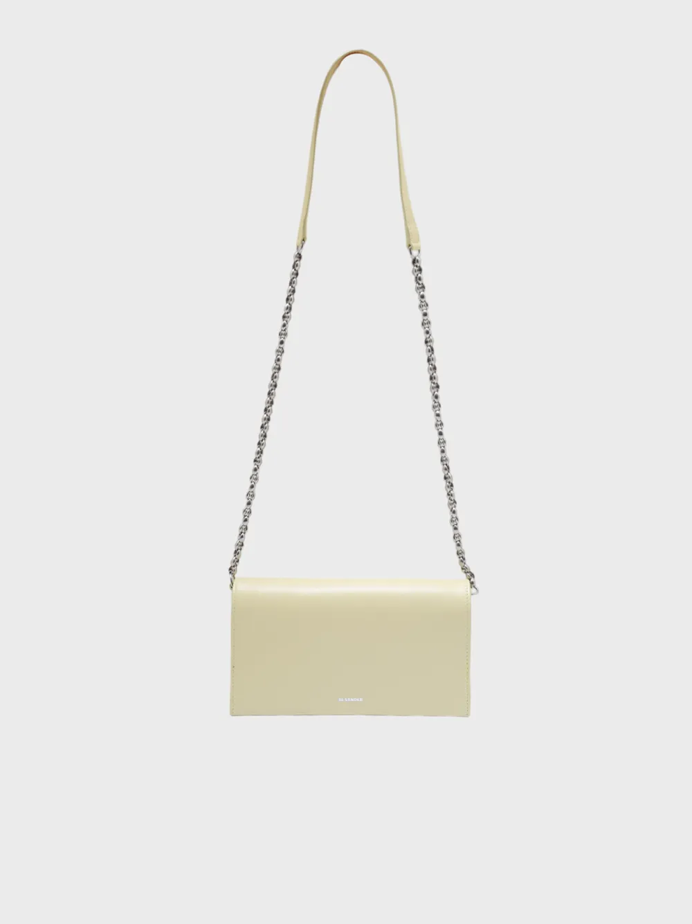 Светло-бежевая сумка Jil Sander выполнена из качественной кожи с прямым кроем и продуманным дизайном. Модель дополнена серебряной цепочкой, которая придает ей современный и элегантный вид. Прямой силуэт и утонченные детали делают эту сумку универсальной, подходящей как для повседневного использования, так и для создания модных комбинаций.