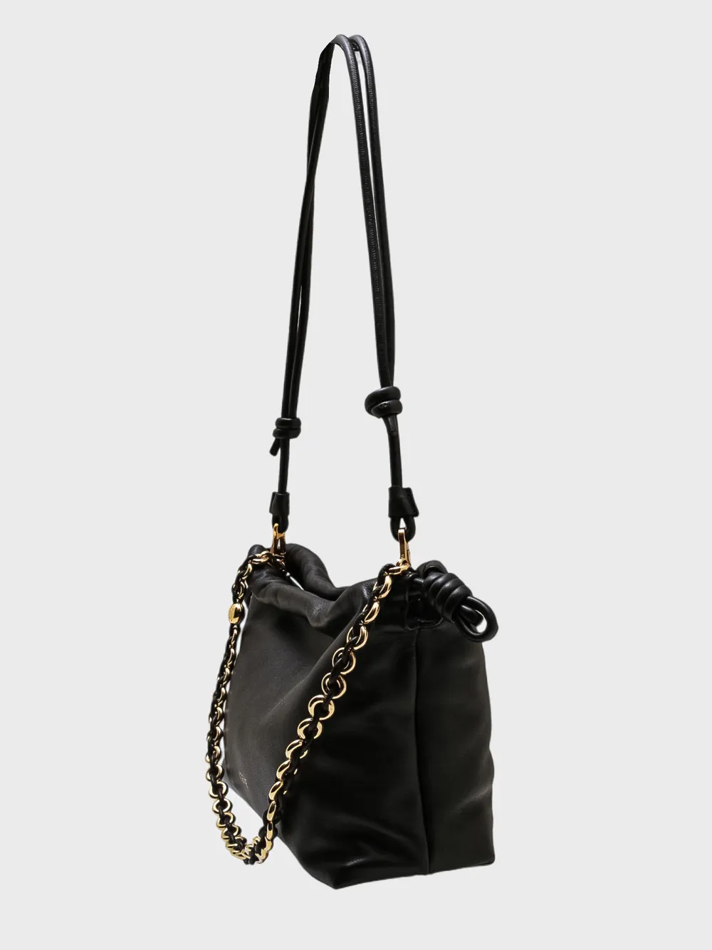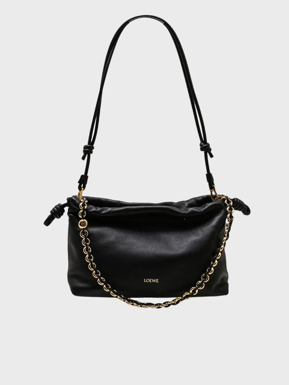 Сумка Loewe выполнена из черной кожи с гладкой текстурой. Модель имеет компактный дизайн и оснащена регулируемым плечевым ремнем, который можно носить как через плечо, так и на руке. Особенностью сумки является наличие золотистой цепочки, которая добавляет современный и элегантный акцент. На внешней стороне сумки присутствует золотистый логотип бренда "LOEWE", что подчеркивает ее принадлежность к известному испанскому бренду. Сумка сочетает в себе функциональность и стиль, идеально подходя для повседневного использования или деловых встреч.