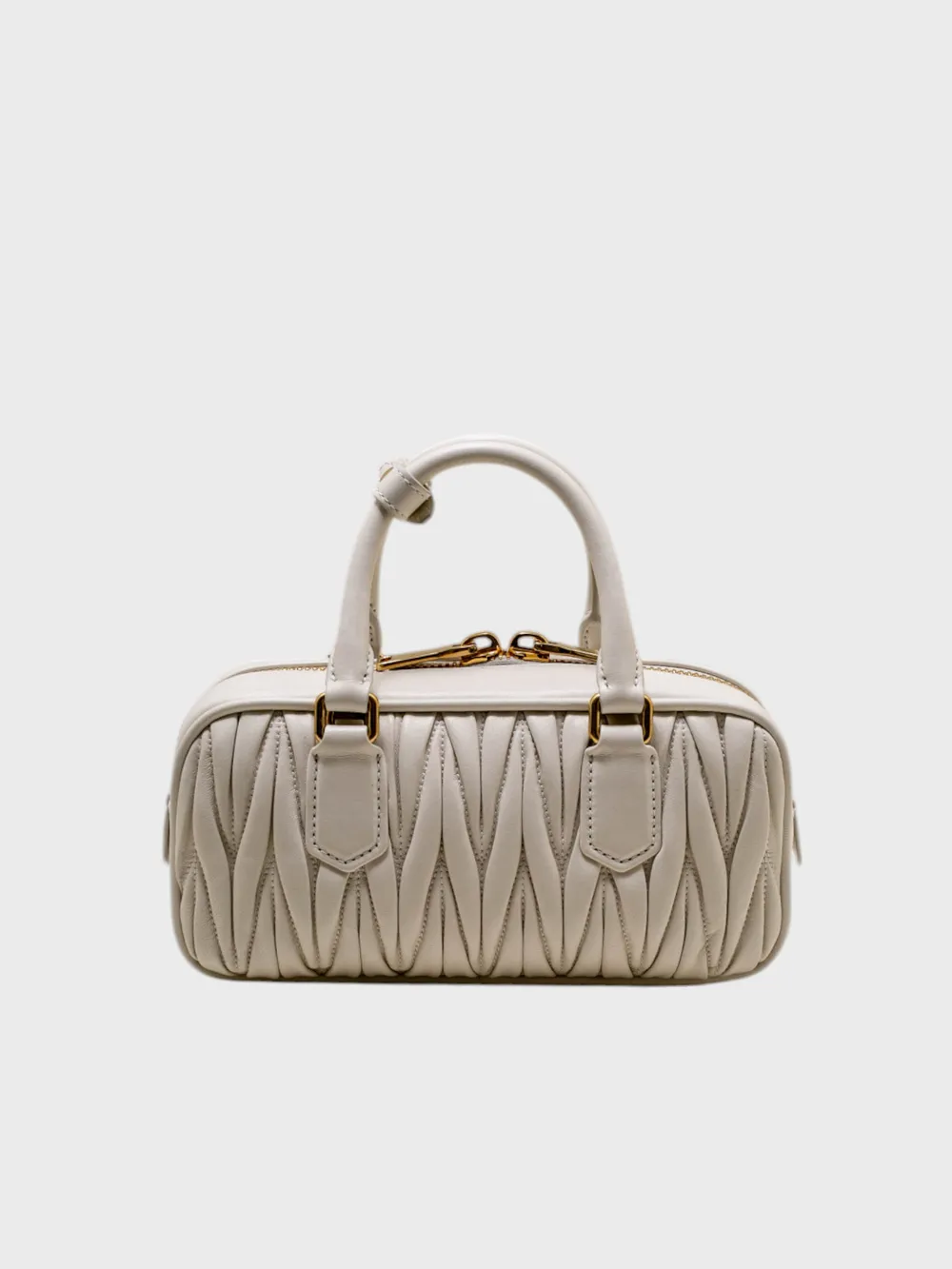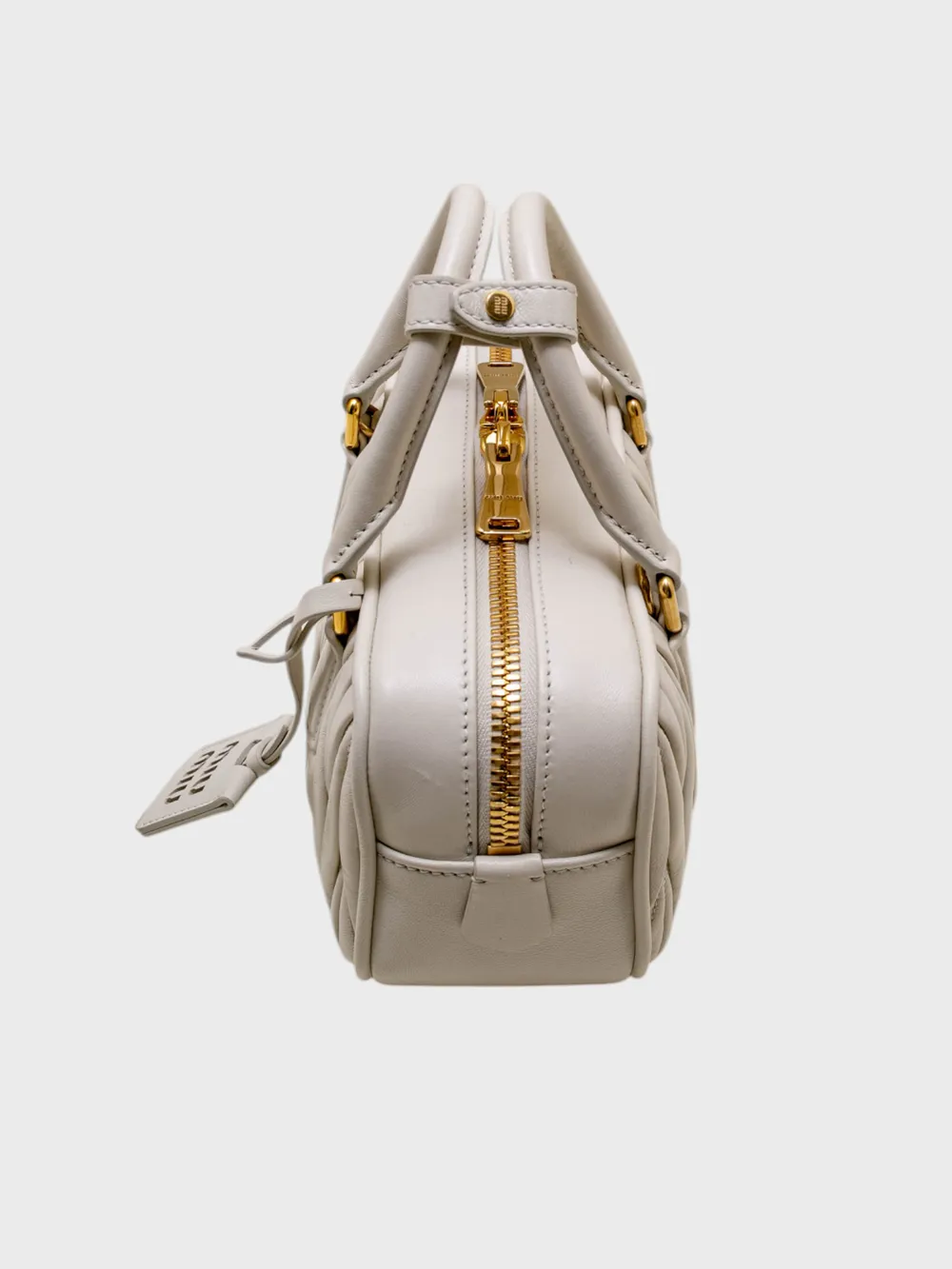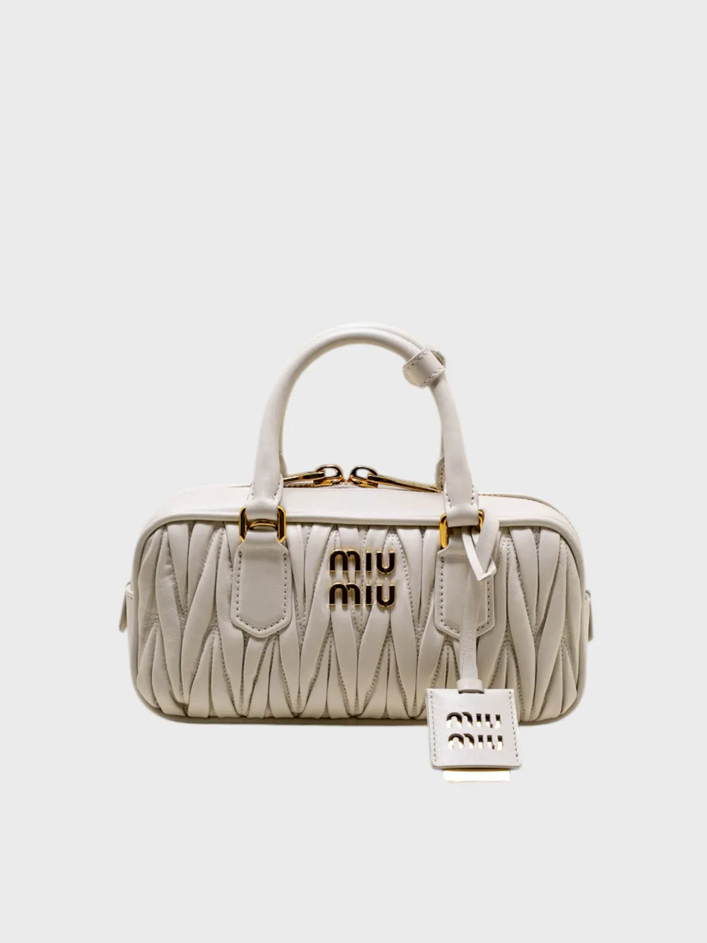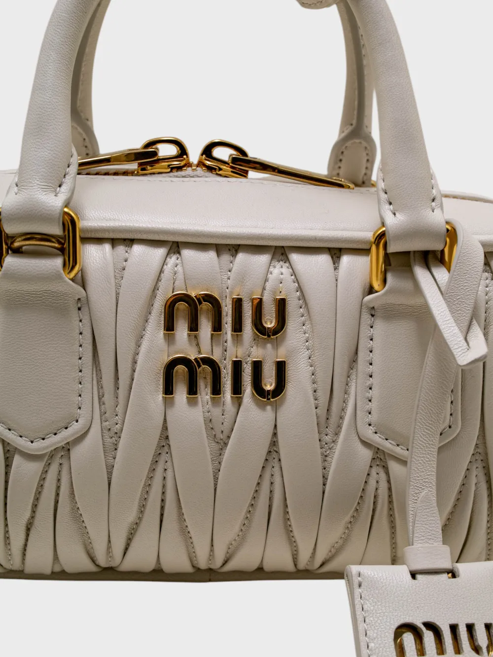 Сумка Miu Miu выполнена из белой кожи с текстурой, создающей эффект крупного зерна. Модель имеет компактную форму и оснащена короткой ручкой для переноски через плечо или на руке. На передней части сумки расположен металлический логотип "MIU MIU" в золотом цвете, который добавляет узнаваемости. Застежка-молния обеспечивает удобство использования. Простая форма и качественные материалы делают эту сумку универсальной для различных случаев использования, от повседневных прогулок до вечерних мероприятий. Белый цвет позволяет сочетать аксессуар с различными стилями одежды.