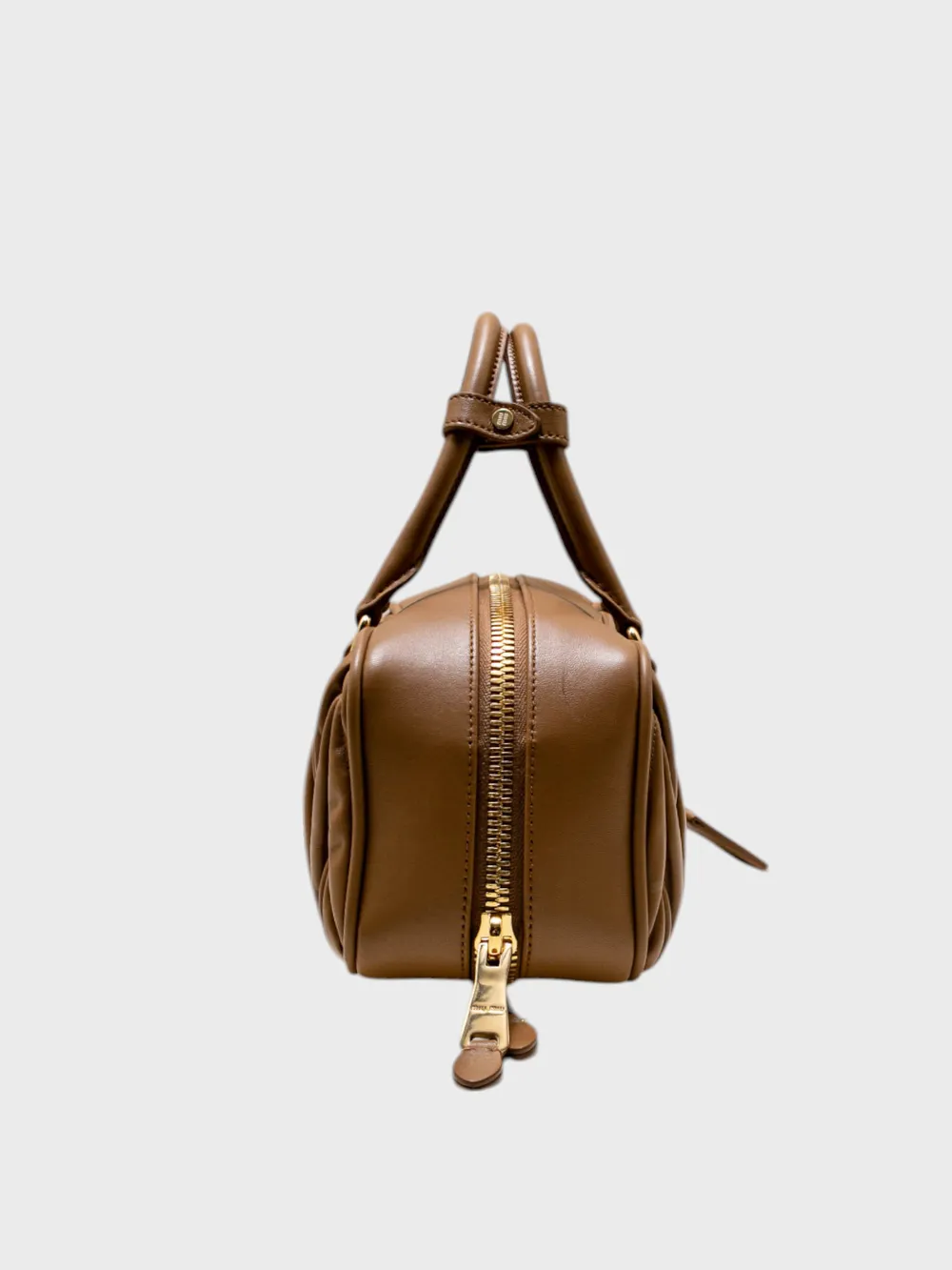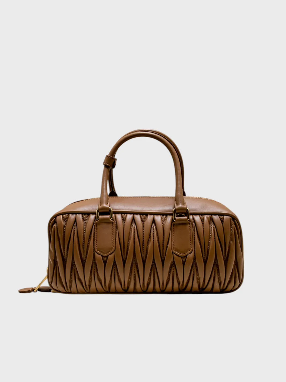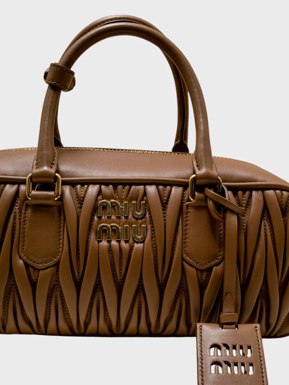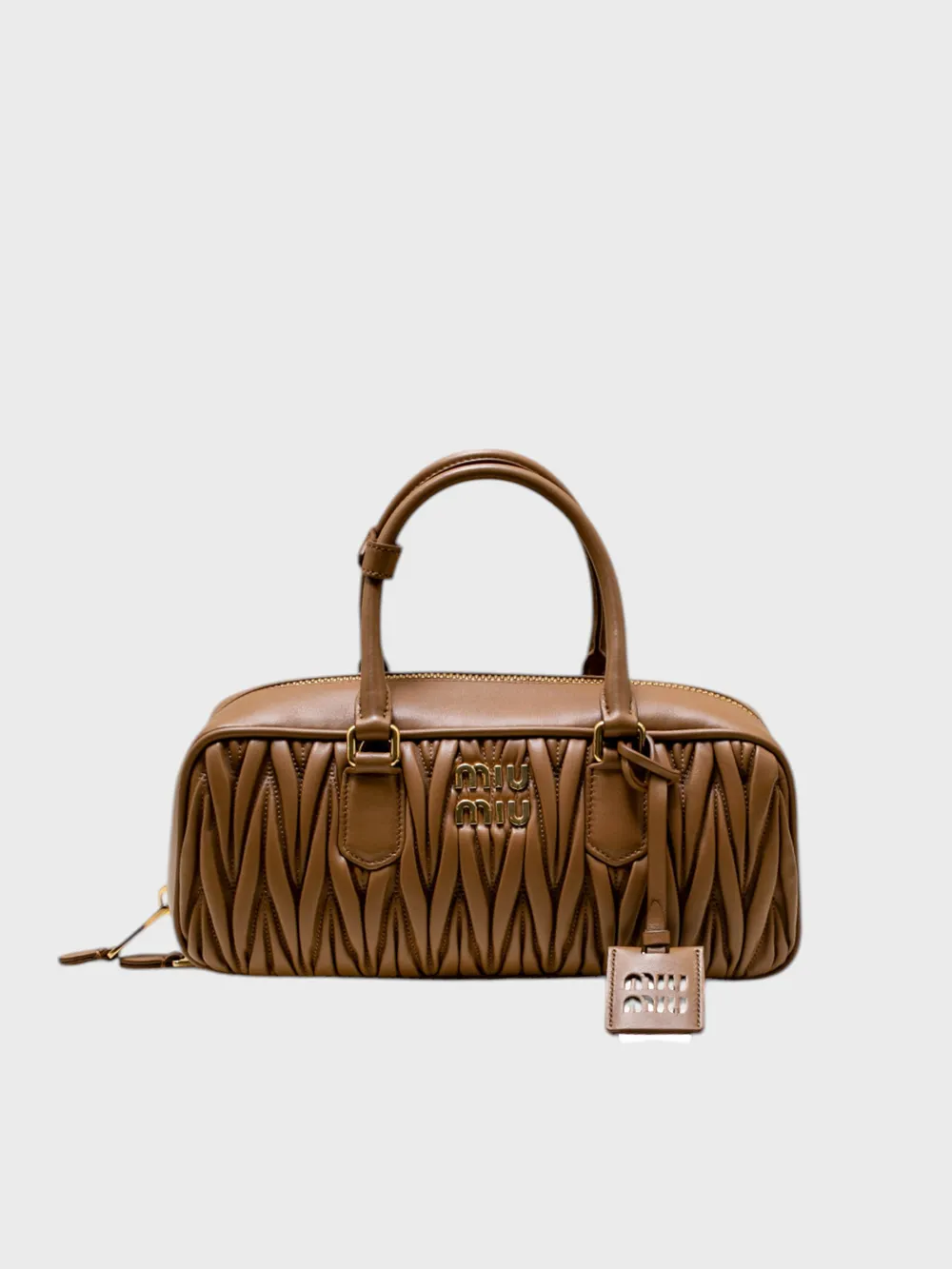 Сумка Miu Miu выполнена из коричневой кожи с текстурой, создающей эффект складок. Модель имеет компактную форму и оснащена короткой ручкой для переноски через плечо или на руке. На передней части сумки расположен металлический логотип бренда "MIU MIU" в золотом цвете, который добавляет узнаваемости. Застежка-молния с металлической фурнитурой обеспечивает безопасность содержимого. Простая форма и качественные материалы делают эту сумку универсальной для различных случаев использования, от повседневных прогулок до вечерних мероприятий. Коричневый цвет позволяет сочетать аксессуар с различными стилями одежды.
