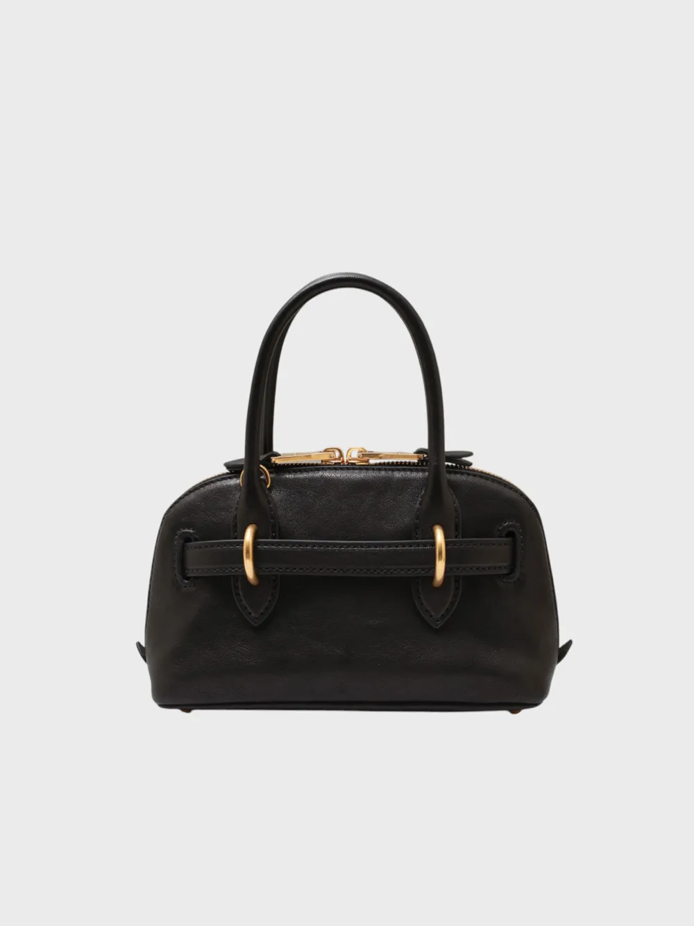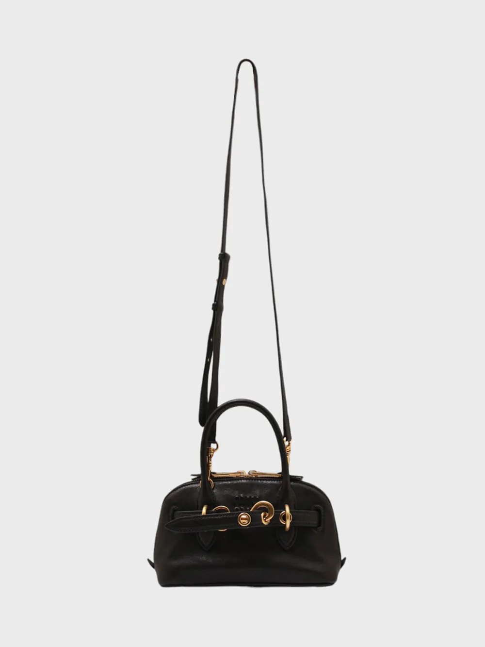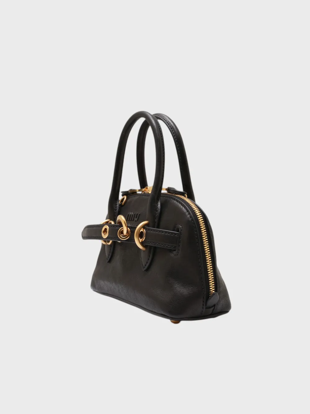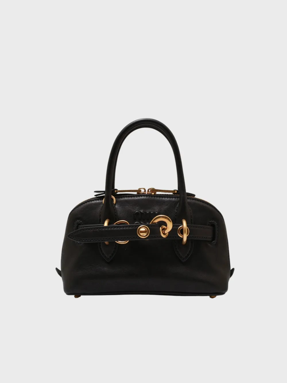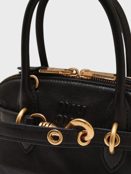 Сумка Miu Miu выполнена из качественной черной кожи с фактурным граненым текстурным эффектом. Модель дополнена золотыми металлическими деталями, включая застежку-молнию и декоративные кольца на ремешке. Компактный размер и удобная ручка обеспечивают комфорт при использовании, а возможность ношения через плечо делают аксессуар универсальным для повседневного и делового стиля. Идеальный выбор для ценителей элегантности и качества.