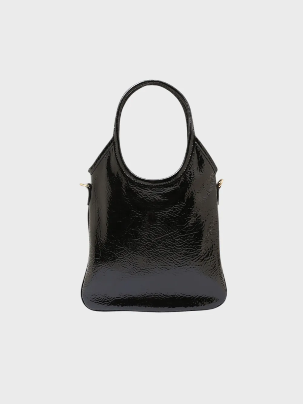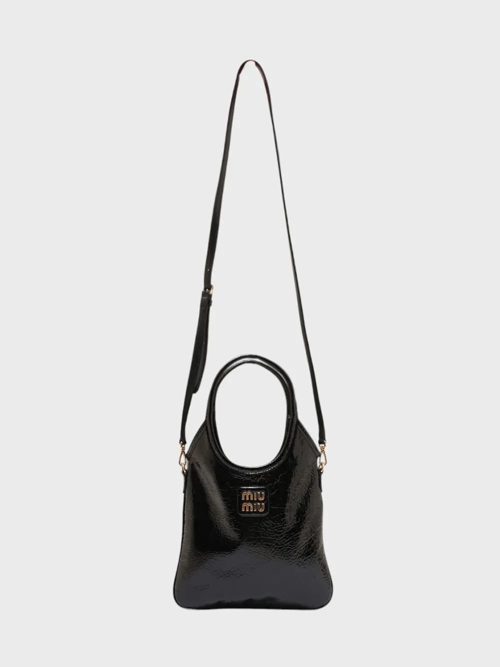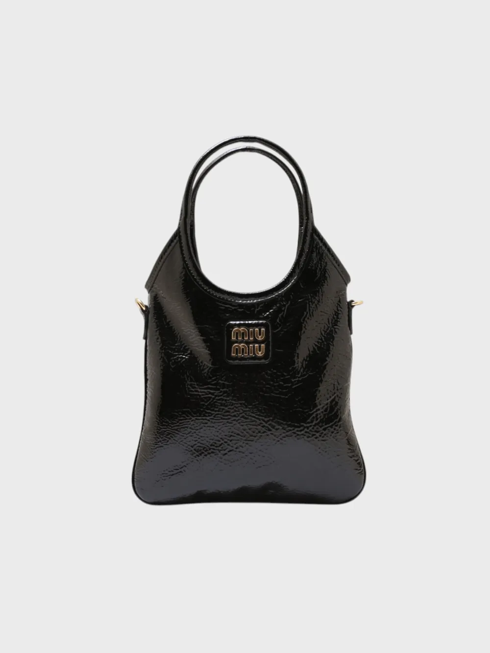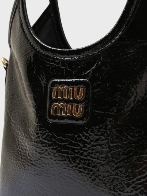 Сумка Miu Miu выполнена из высококачественной черной кожи с гладкой текстурой и матовым блеском. Модель дополнена золотыми акцентами на молниях и декоративных элементах, а также вышитым логотипом бренда на передней части. Ручки сумки обеспечивают удобную переноску, а компактный размер делает ее идеальной для повседневного использования. Идеальный выбор для тех, кто ценит стиль и качество в аксессуарах.