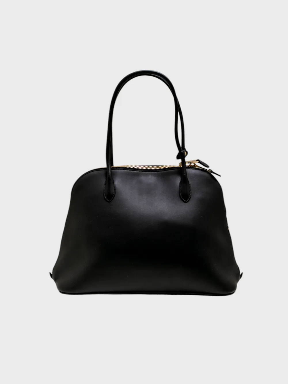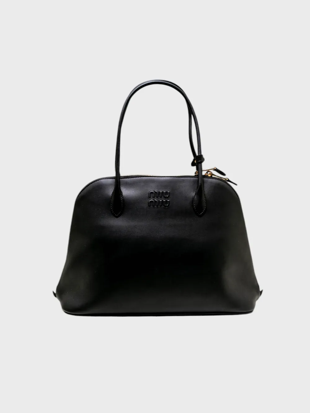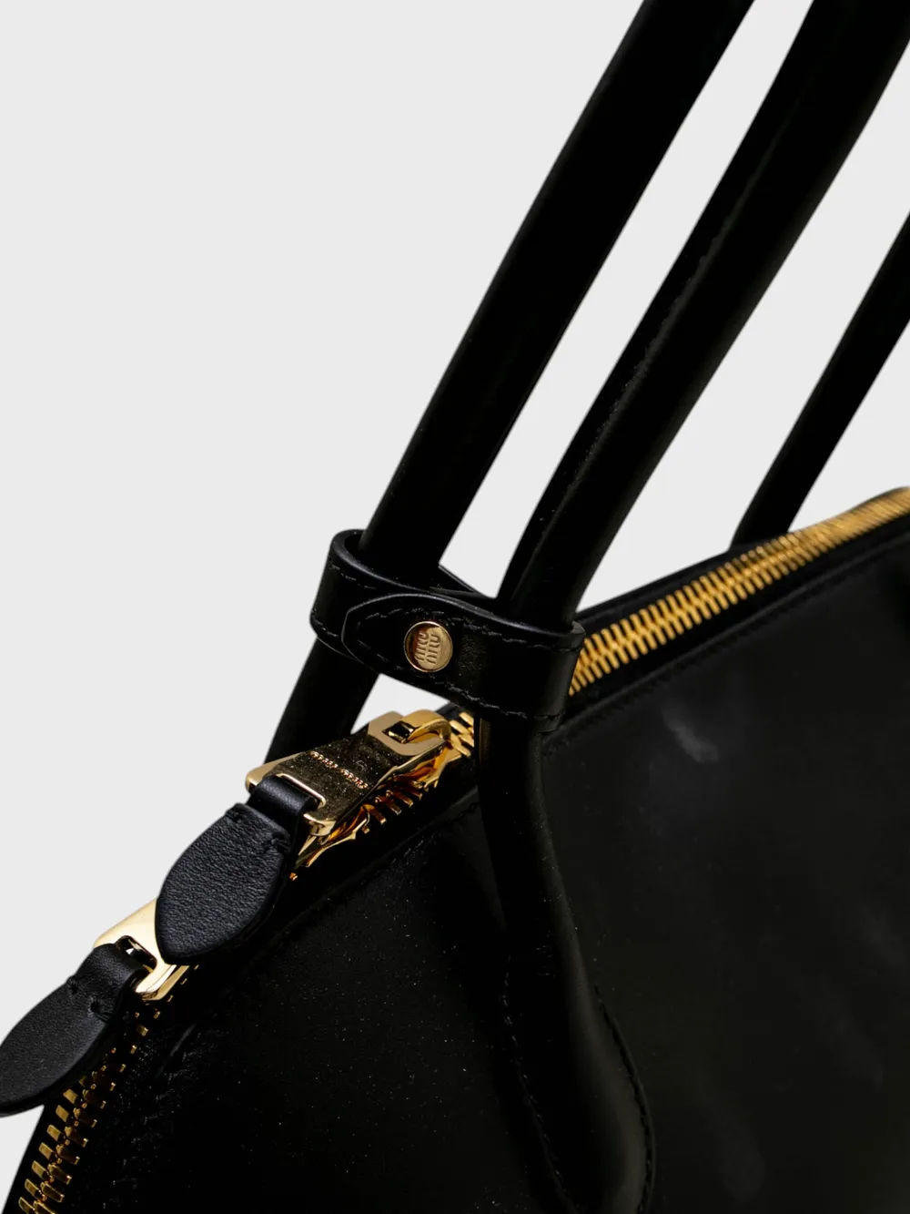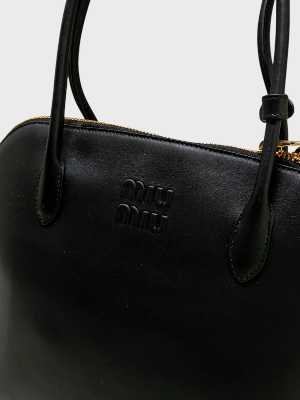 Сумка Miu Miu выполнена из черной кожи с гладкой текстурой. Модель имеет компактную форму и оснащена короткой ручкой для переноски через плечо или на руке. На передней части сумки расположен металлический логотип бренда "MIU MIU" в золотом цвете, который добавляет узнаваемости. Застежка-молния с металлической фурнитурой обеспечивает безопасность содержимого. Простая форма и качественные материалы делают эту сумку универсальной для различных случаев использования, от повседневных прогулок до вечерних мероприятий. Черный цвет позволяет сочетать аксессуар с различными стилями одежды.