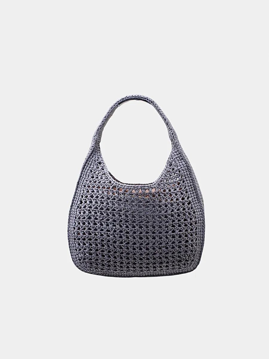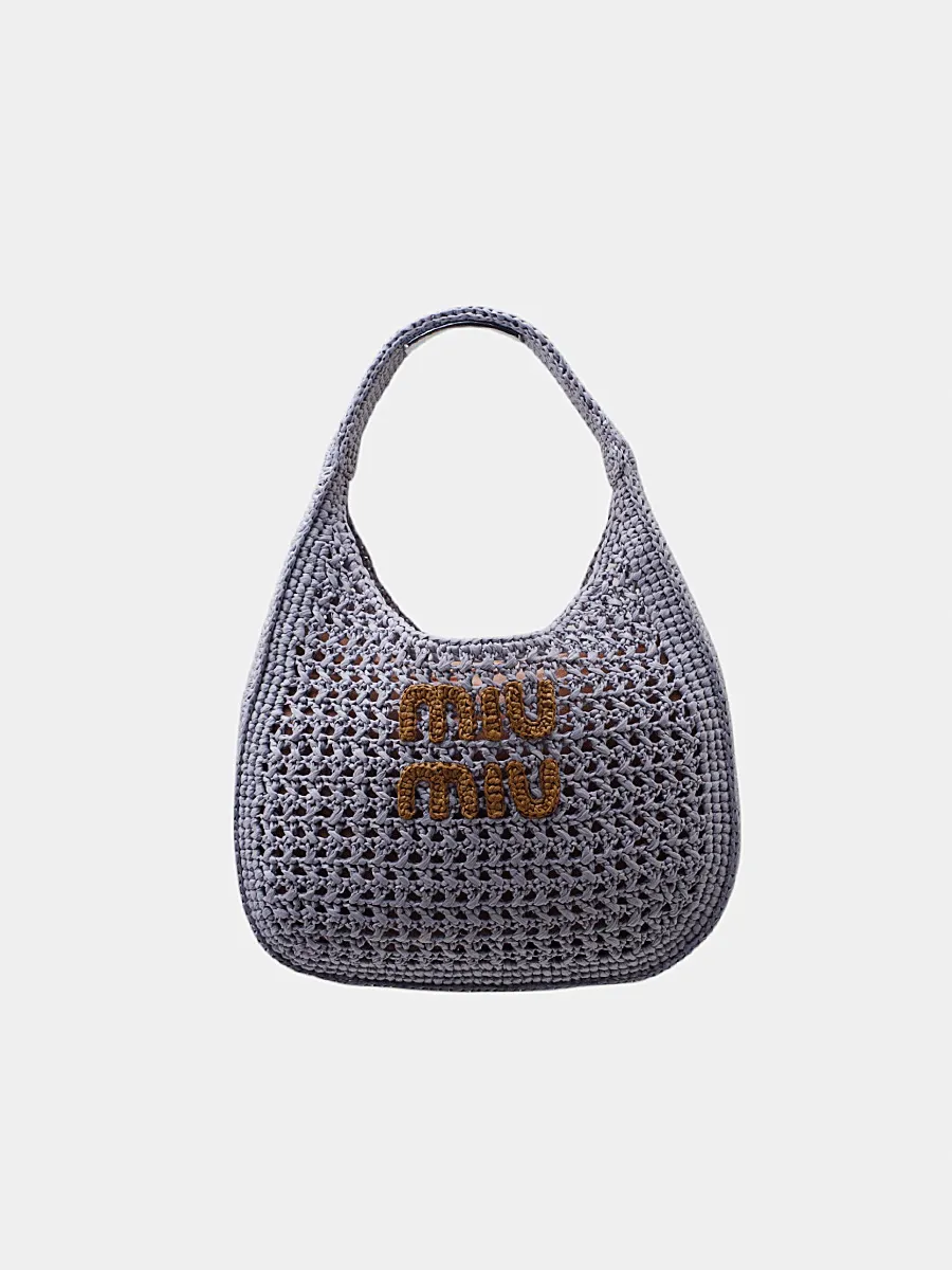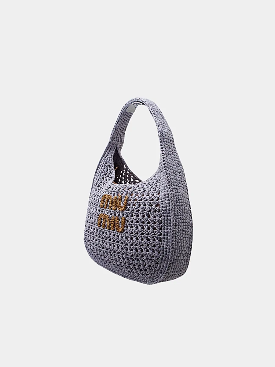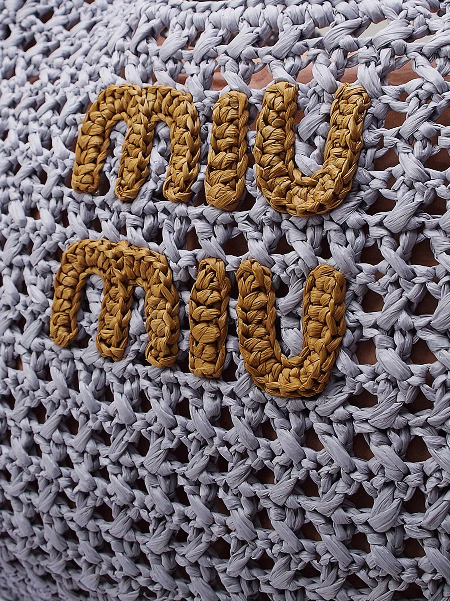 Сумка Miu Miu выполнена из тонкой плетёной ткани серо-голубого оттенка с воздушной текстурой, украшена вышитым логотипом «miu miu» в технике ручного плетения; модель с мягкой дуговой формой и удобной ручкой — стильный аксессуар, сочетающий легкость, качество и узнаваемый брендовый шик.