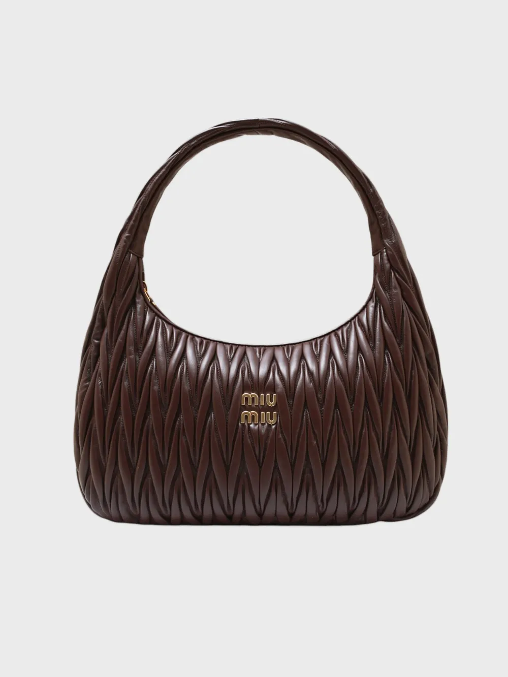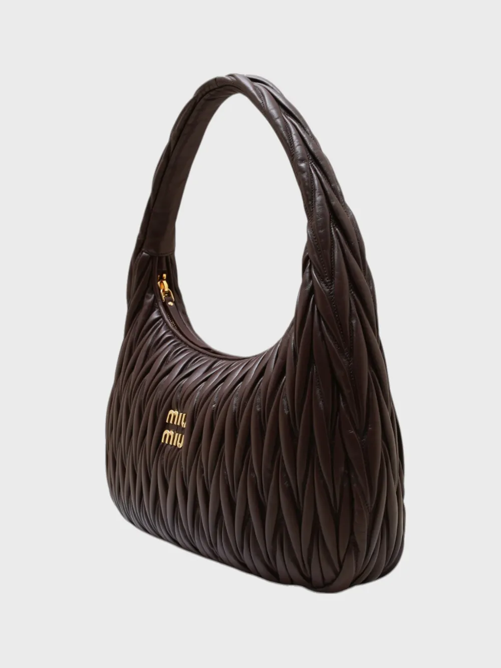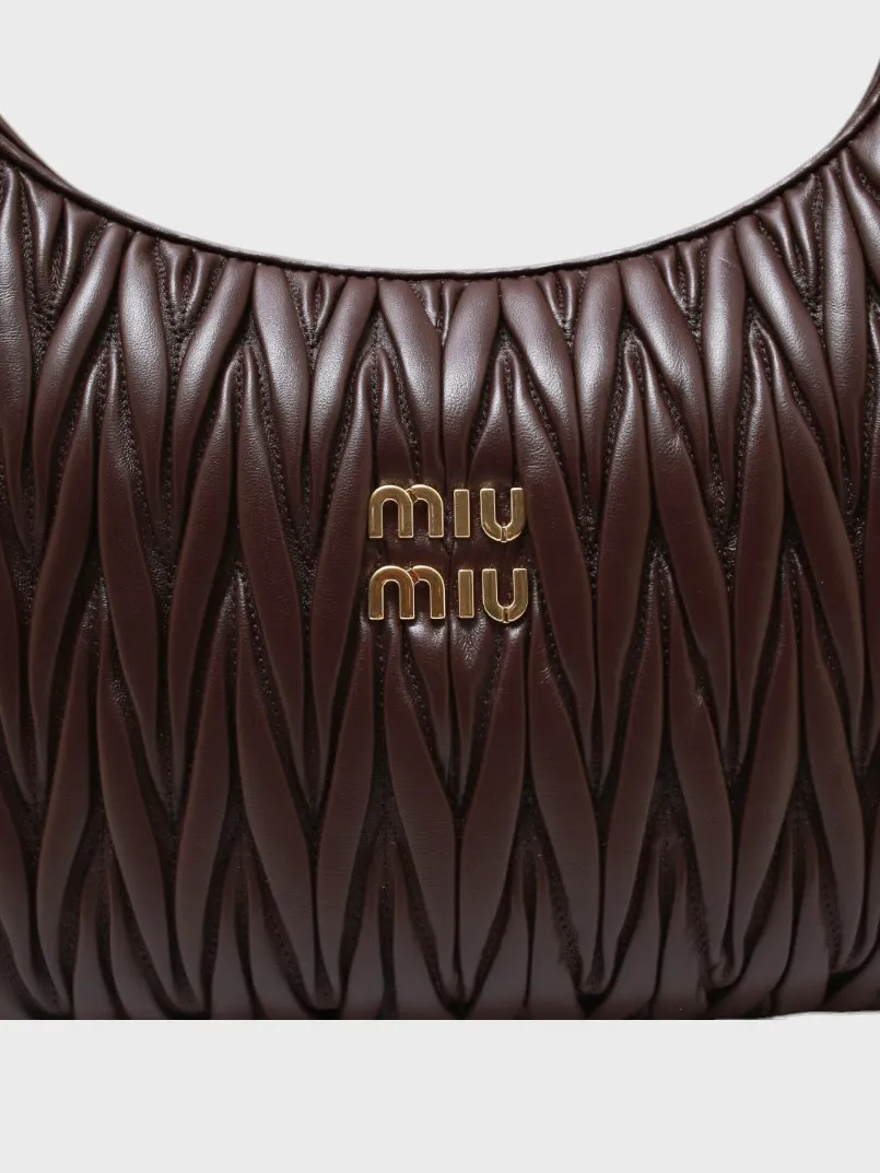 Сумка Miu Miu выполнена из высококачественной коричневой кожи с текстурным дизайном, созданным за счет складок и стежки. Модель дополнена золотыми акцентами на молниях и декоративных элементах, а также вышитым логотипом бренда на передней части. Ручки сумки обеспечивают удобную переноску, а компактный размер делает ее идеальной для повседневного использования. Идеальный выбор для тех, кто ценит стиль и качество в аксессуарах.