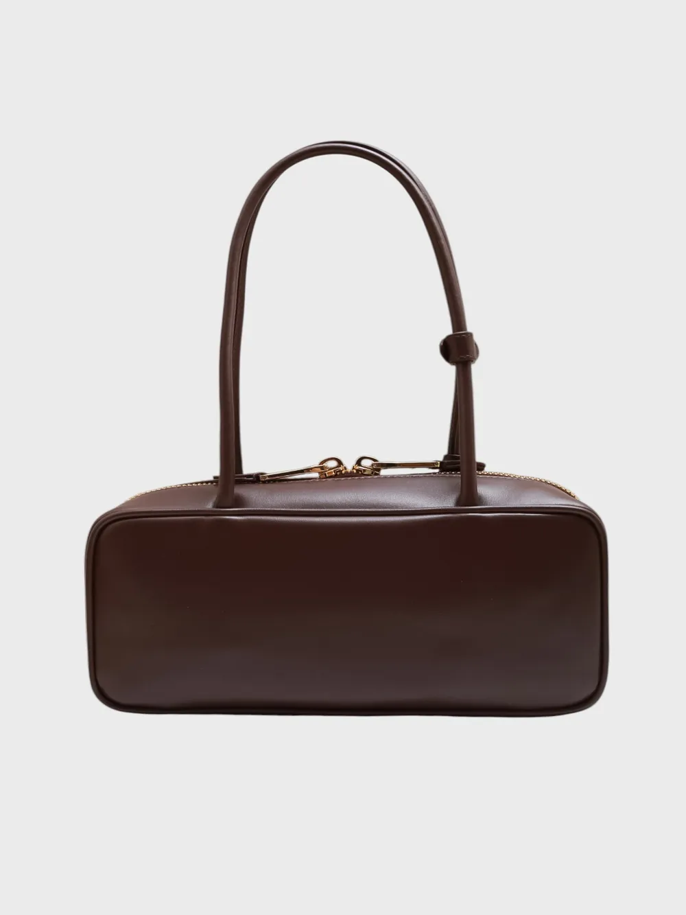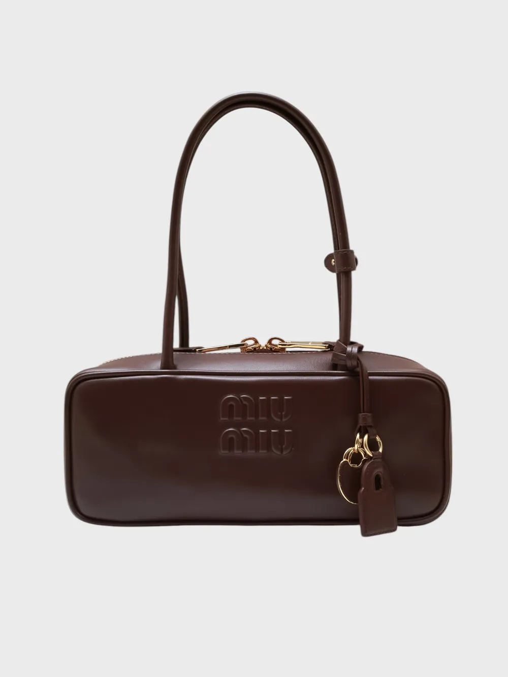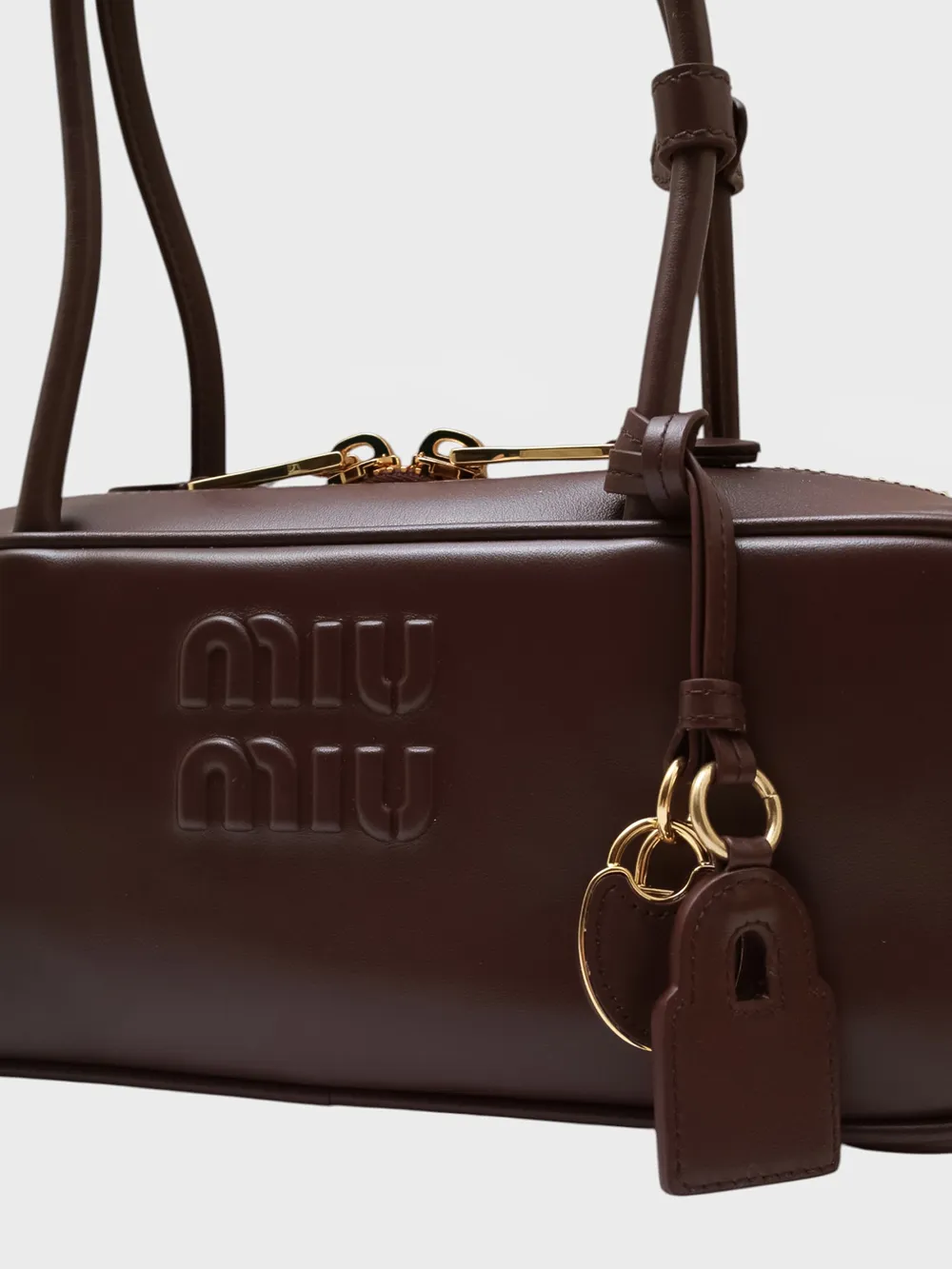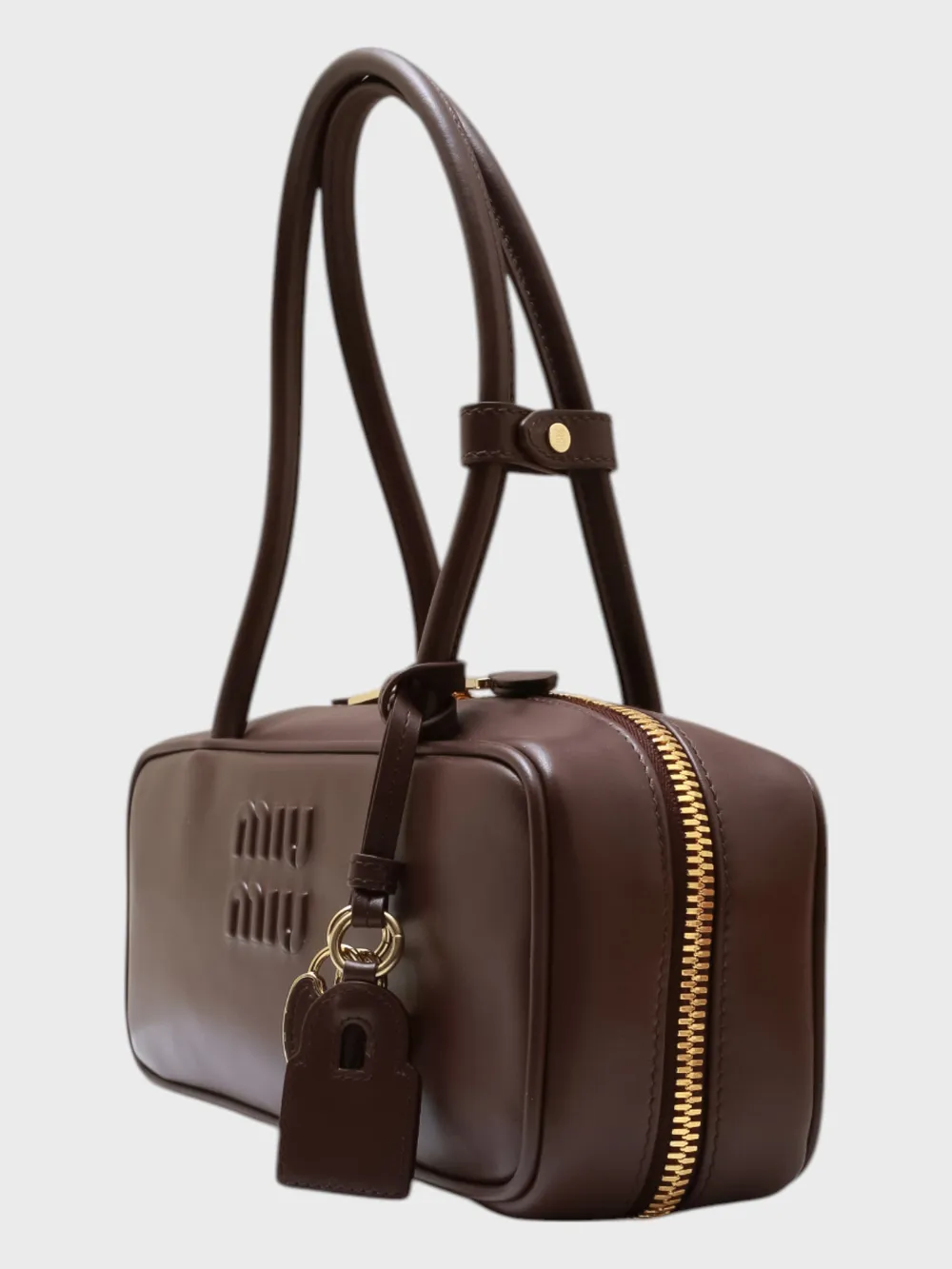 Сумка Miu Miu выполнена из темно-коричневой гладкой кожи с золотыми деталями. Модель дополнена двумя ручками и металлическим замком, обеспечивающим безопасность содержимого. Простой и элегантный аксессуар для создания современного образа.