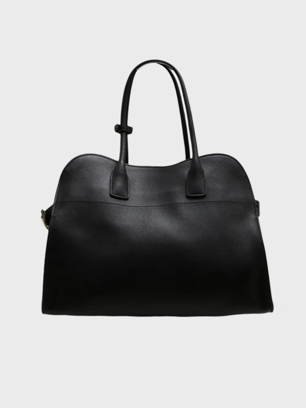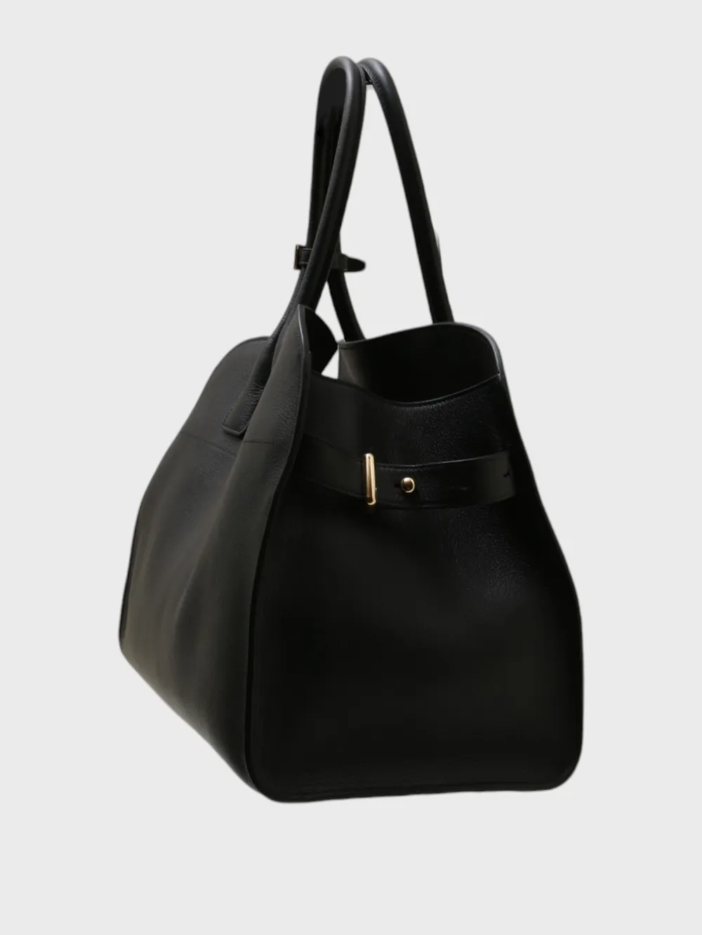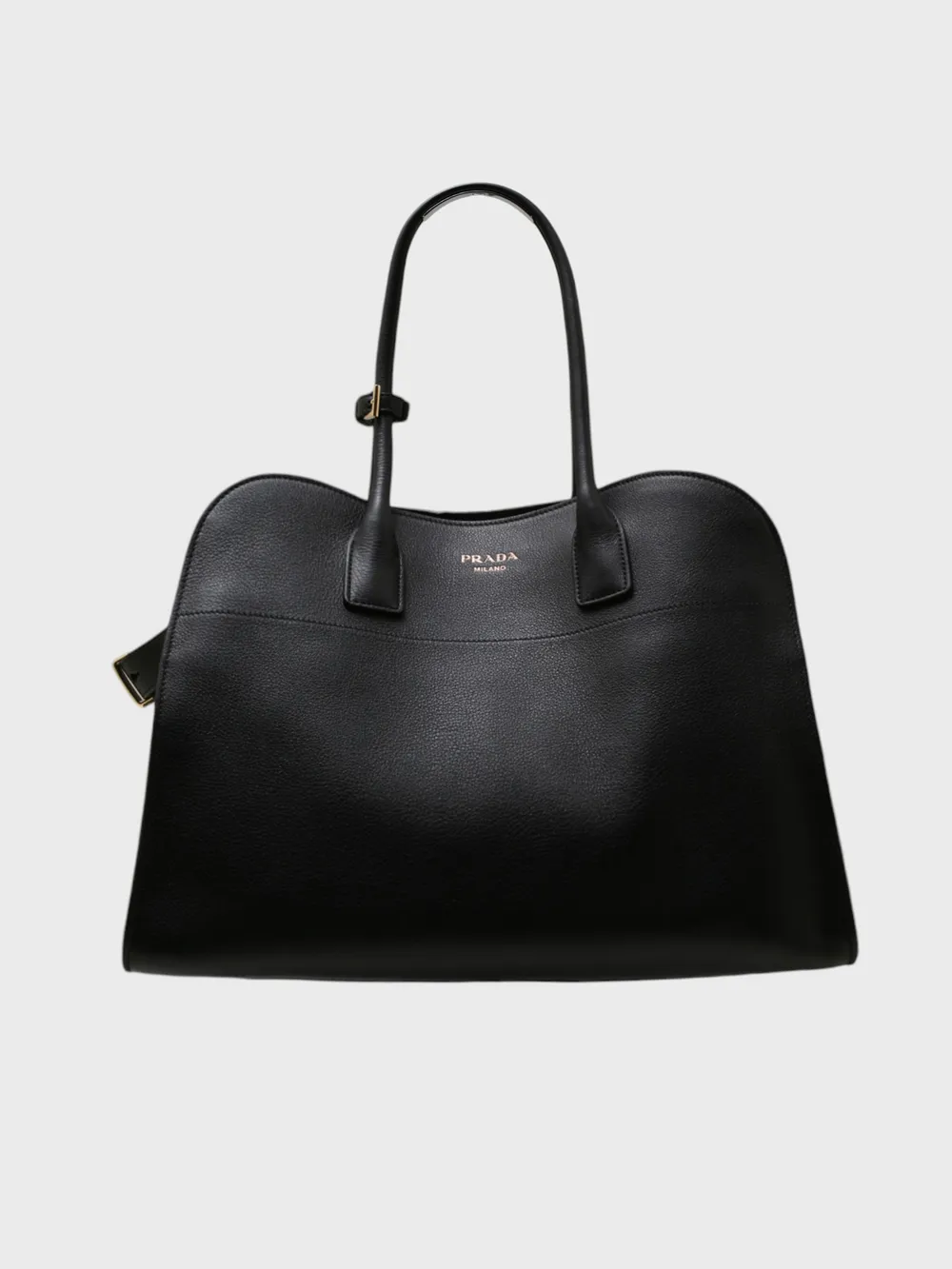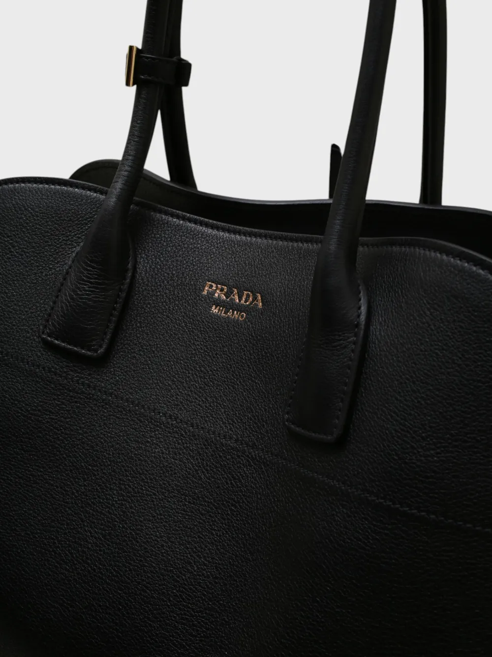 Сумка Prada выполнена из черной фактурной кожи с лаконичным дизайном. Модель дополнена двумя ручками, застежкой-ремешком с золотым кольцом и вместительным внутренним отделением. На передней части сумки расположен фирменный логотип бренда "Prada Milano". Стильная и функциональная — идеальный аксессуар для повседневного и делового образа.