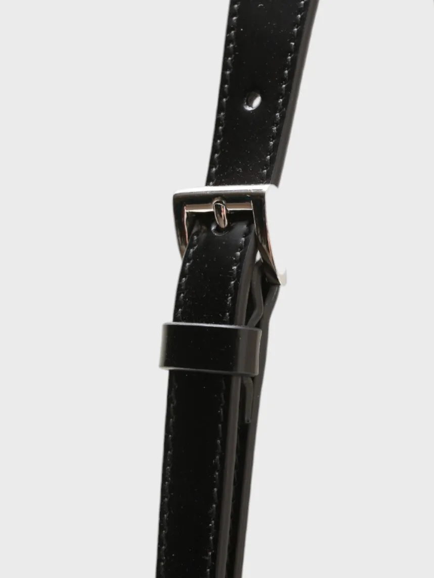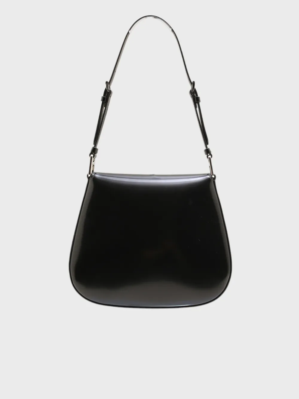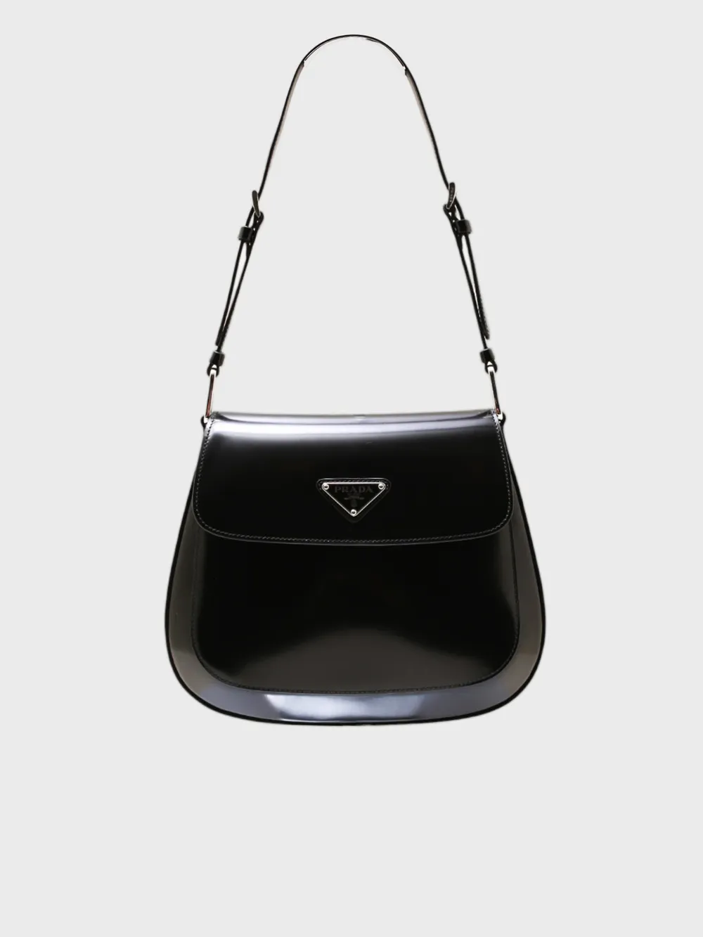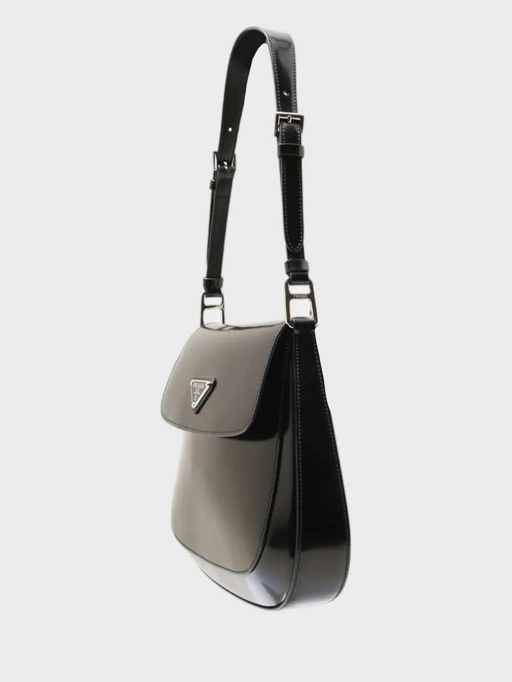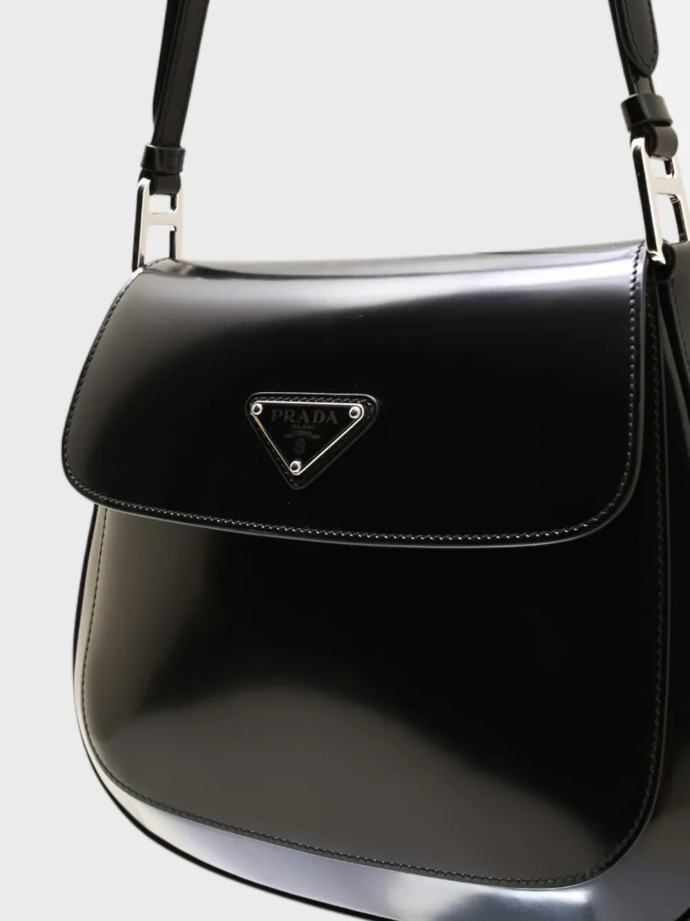 Сумка Prada выполнена из черной лаковой кожи с глянцевой поверхностью, что придает ей современный и элегантный вид. Модель дополнена широкой регулируемой плечевой лямкой для удобства ношения. На лицевой стороне сумки расположен фирменный треугольный логотип Prada, изготовленный из металла с черным покрытием. Сумка оснащена застежкой-молнией на передней части, обеспечивающей надежное закрывание. Дизайн сумки сочетает в себе классические элементы и современные детали, делая ее универсальным аксессуаром для различных случаев использования.